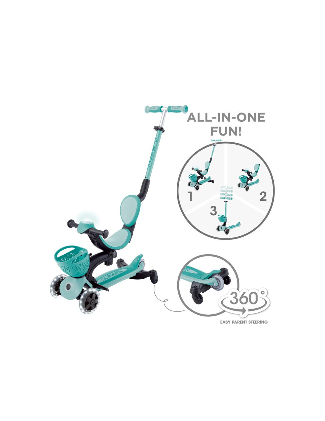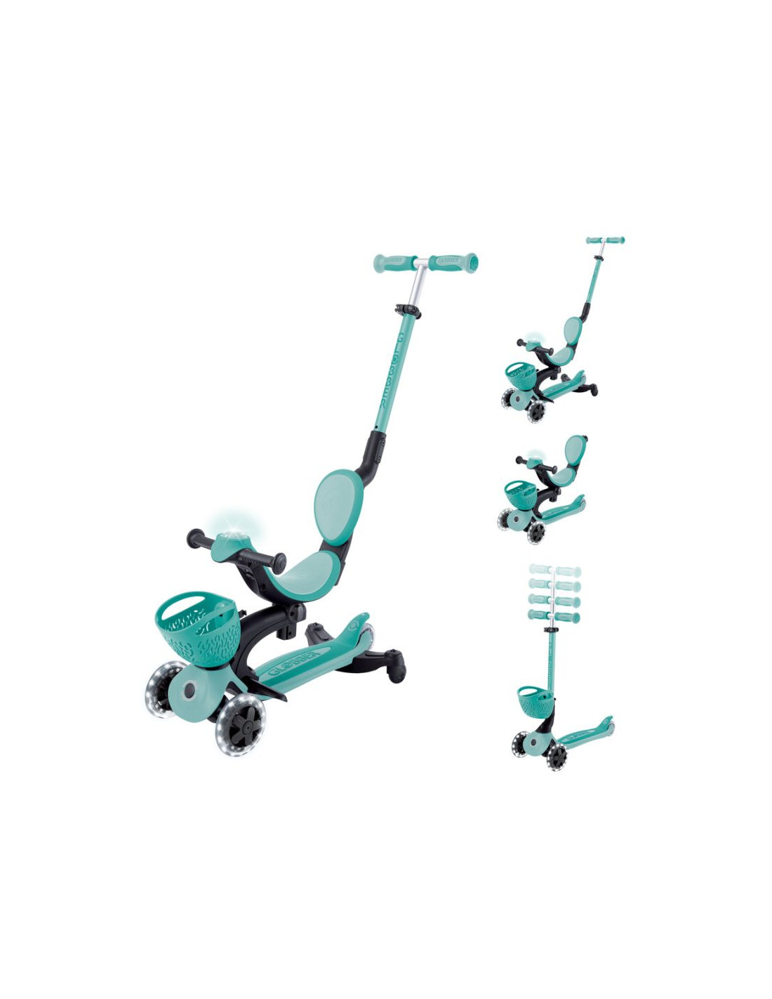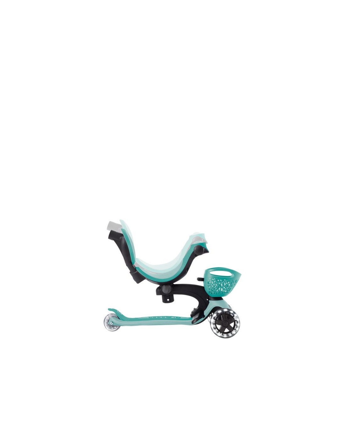 Wielofunkcyjny pojazd typu „wszystko w jednym”, z siedziskiem dla małych dzieci, wykonany z plastiku TBC pochodzącego z recyklingu, wyposażony w świecące kółka, światełko na kierownicy, koszyczek, oparcie i boczne kółka.