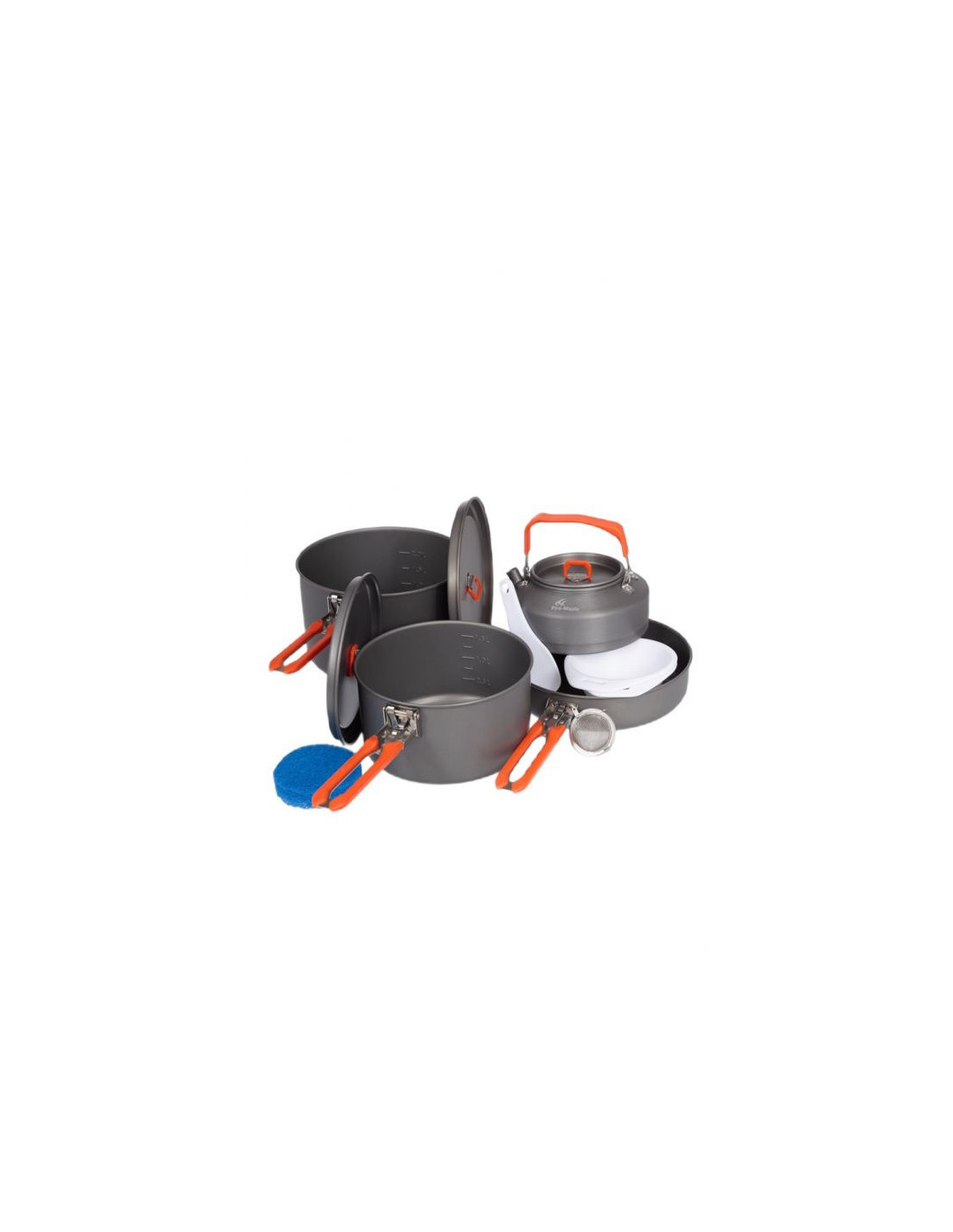 - Zawartość zestawu: 2 garnki z pokrywką, patelnia, czajnik, 2 miski, łopatka do gotowania, zaparzacz do herbaty i gąbka