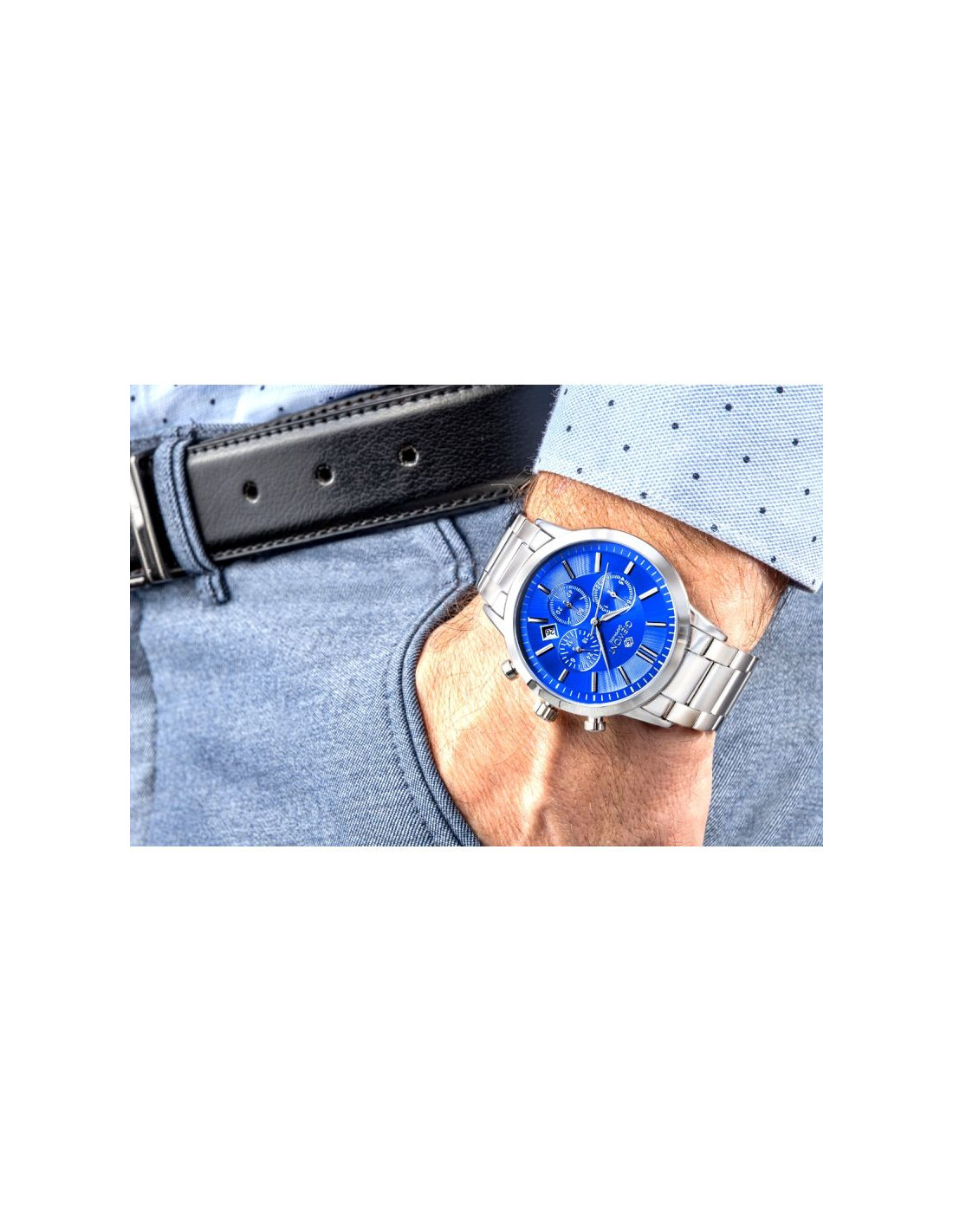 Rozbudowana tarcza została zaprojektowana w sposób logiczny i uporządkowany, umożliwiając szybki odczyt wszystkich wskazań. Chronograf z funkcją czasu 24-godzinnego pozwala na dokładne planowanie i kontrolę dnia, a datownik w naturalny sposób uzupełnia zestaw funkcji, zwiększając wygodę codziennego użytkowania. Każdy element pełni tu konkretną rolę, bez zbędnych dodatków.