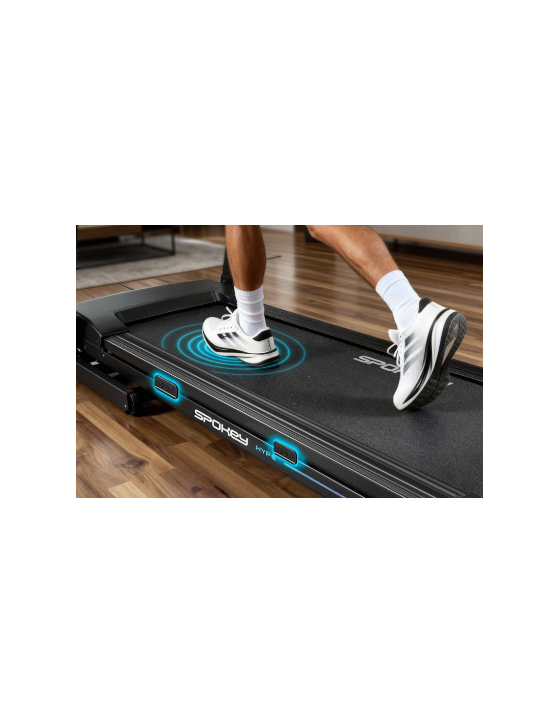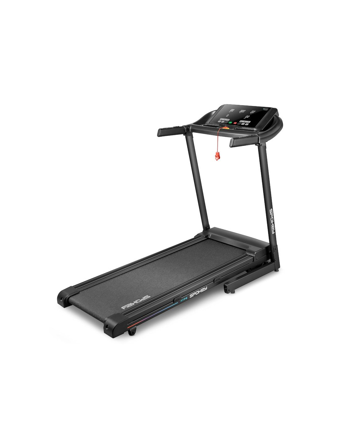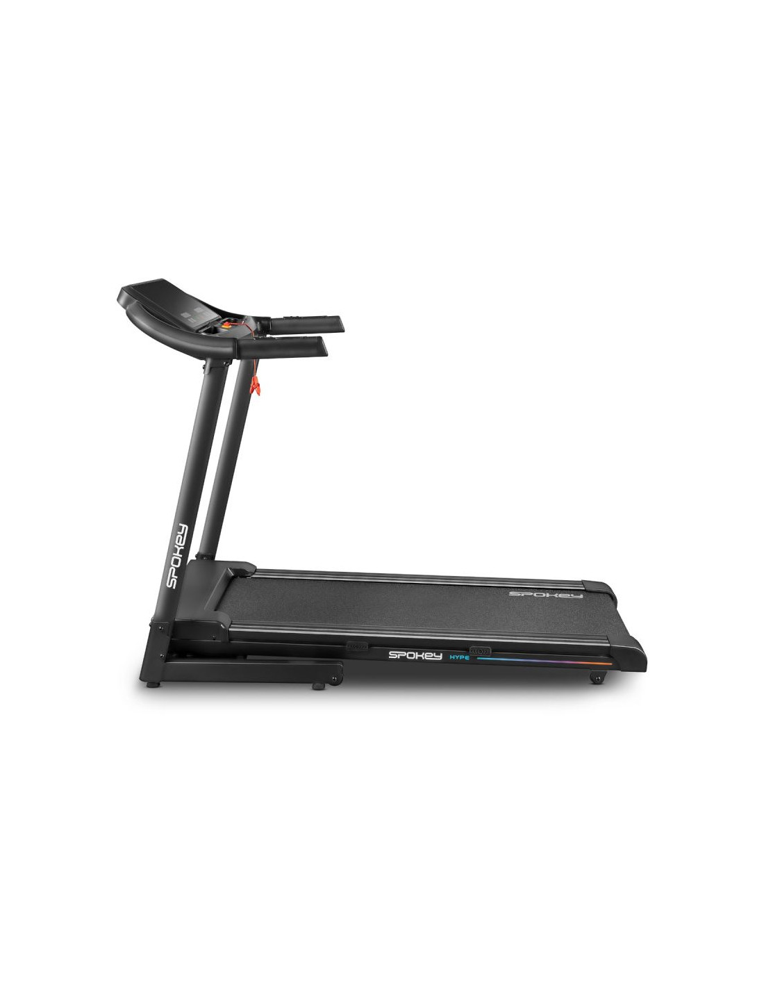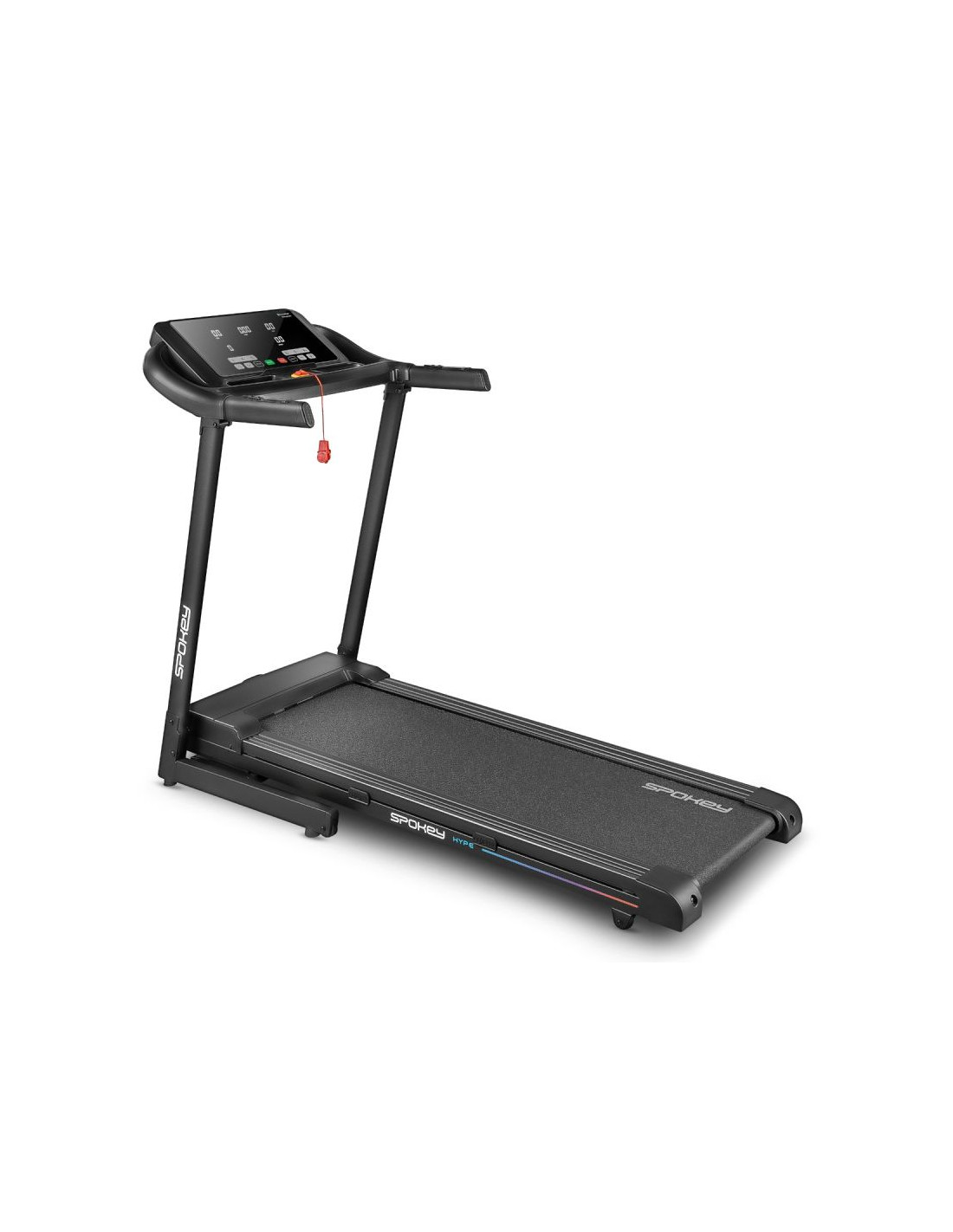 Bieżnia elektryczna Spokey HYPE – składana, z automatycznym nachyleniem i 15 programami treningowymi Składana bieżnia elektryczna Spokey HYPE z automatyczną regulacją nachylenia (1–15%), 15 programami treningowymi i możliwością personalizacji dla 3 użytkowników. Wyposażona w duży ekran LED, amortyzację, czujniki pulsu oraz praktyczne uchwyty na tablet i butelkę z wodą. Idealna do codziennych treningów w domu. Wprowadzenie Spokey HYPE to domowa bieżnia, która łączy wygodę użytkowania z szerokimi możliwościami treningowymi. Wyposażona w automatyczną regulację kąta nachylenia, 15 programów oraz możliwość personalizacji planów aż dla 3 użytkowników, pozwala dopasować trening do indywidualnych potrzeb. Dzięki składanej konstrukcji, amortyzacji i praktycznym uchwytom na tablet i bidon z wodą, bieganie w domu z bieżnia HYPE staje się naprawdę komfortowe i motywujące. Dlaczego warto wypróbować bieżnię elektryczną Spokey HYPE? 15 programów treningowychBogaty zestaw 15 gotowych programów treningowych pozwala na urozmaicenie ćwiczeń i dopasowanie intensywności do Twoich możliwości. Każdy z nich został podzielony na 20 sekcji, w których prędkość i nachylenia zmienia się automatycznie – to świetny sposób na symulację zróżnicowanych warunków i uniknięcie monotonii w trakcie biegu. 3 personalizowane programyBieżnia umożliwia stworzenie i zapisanie własnych planów treningowych dla 3 oddzielnych użytkowników. Dzięki temu każdy domownik może szybko wybrać swój tryb i trenować zgodnie z indywidualnymi potrzebami, bez konieczności ponownego ustawiania parametrów. Uchwyt na tablet i butelkęPodczas treningu wszystko, czego potrzebujesz, masz zawsze pod ręką – ulubiony napój w zasięgu dłoni i tablet lub smartfon, na którym możesz oglądać film, słuchać muzyki albo korzystać z aplikacji treningowych. To połączenie wygody i motywacji. AmortyzacjaSystem amortyzacji skutecznie pochłania wstrząsy powstające w czasie biegu, co odciąża stawy i zapewnia większy komfort. Dzięki temu każdy trening staje się przyjemniejszy i bardziej efektywny dla organizmu, nawet podczas dłuższych sesji. Szczegółowy opis Bieżnia elektryczna Spokey HYPE to Twój sposób na efektywny trening bez wychodzenia z domu. Mocny silnik 1,75 HP pozwala rozpędzić się do 14 km/h – idealnie zarówno do energicznych marszów, jak i intensywnego biegania. Szeroki pas biegowy (122 × 40 cm) daje pełną swobodę ruchu, a system amortyzacji sprawia, że każdy krok jest komfortowy i płynny. Trenuj kiedy chcesz i na własnych zasadach! Dzięki 15 programom treningowym możesz łatwo dopasować intensywność ćwiczeń, a personalizacja dla aż 3 osób sprawia, że każda z nich może korzystać z bieżni w wygodny sposób. Duży ekran LED na bieżąco wyświetla najważniejsze dane, a czujniki pulsu wbudowane w poręcze umożliwiają monitorowanie tętna. Bieżnia HYPE została zaprojektowana z myślą o oszczędności miejsca – można ją złożyć i przechowywać w pozycji pionowej, a kółka transportowe ułatwiają jej przemieszczanie. Praktyczne detale, takie jak uchwyt na tablet i butelkę, podnoszą komfort korzystania z bieżni, a klucz bezpieczeństwa zapewnia dodatkową ochronę podczas treningu. Dane techniczne Typ: bieżnia elektryczna Moc silnika: 1,75 HP Maksymalna prędkość: 14 km/h Nachylenie: automatyczne: 1–15% Wyświetlacz: LED Funkcje wyświetlacza: czas, dystans, prędkość, puls, kalorie Programy treningowe: 15 + 3 personalizowane Pomiar pulsu: tak Pas biegowy: 122 × 40 cm Wymiary: 143 × 67 × 111 cm Wymiary po złożeniu: 64 × 67 × 135 cm Waga urządzenia: 47 kg Maksymalna waga użytkownika: 110 kg Składanie: hydrauliczne Uchwyt na tablet i butelkę: tak Kółka transportowe: tak Bluetooth: tak Certyfikaty, normy i ostrzeżenia Zgodność z normami bezpieczeństwa UE. Produkt przeznaczony wyłącznie do użytku domowego. Urządzenie nie jest przeznaczone dla dzieci. Użytkowanie i pielęgnacja Przed pierwszym użyciem upewnij się, że bieżnia stoi na stabilnym i równym podłożu. Zaleca się umieszczenie sprzętu na macie amortyzującej, aby zmniejszyć poziom hałasu oraz drgania. Po każdym treningu wyłącz urządzenie przyciskiem, a następnie odłącz je od zasilania. Regularnie czyść pas biegowy i obudowę miękką, wilgotną szmatką. Unikaj stosowania agresywnych detergentów. Nie przechowuj sprzętu w wilgotnych ani mocno nasłonecznionych pomieszczeniach. Bieżnia jest przeznaczona wyłącznie do użytku domowego – nie należy korzystać z niej w warunkach komercyjnych ani udostępniać dzieciom. Najczęściej zadawane pytaniaCzy bieżnia Spokey HYPE nadaje się do intensywnych treningów?Tak, dzięki silnikowi o mocy 1,75 HP i prędkości do 14 km/h, HYPE sprawdzi się zarówno do marszów, jak i regularnych treningów biegowych. Czy można złożyć bieżnię Spokey HYPE?Tak, dzięki systemowi hydraulicznemu można ją złożyć i przechowywać w pionie. Kółka transportowe ułatwiają przemieszczanie. Czy bieżnia ma amortyzację?Tak, cztery punkty amortyzacji zmniejszają obciążenie stawów, poprawiając komfort biegu. Czy b
