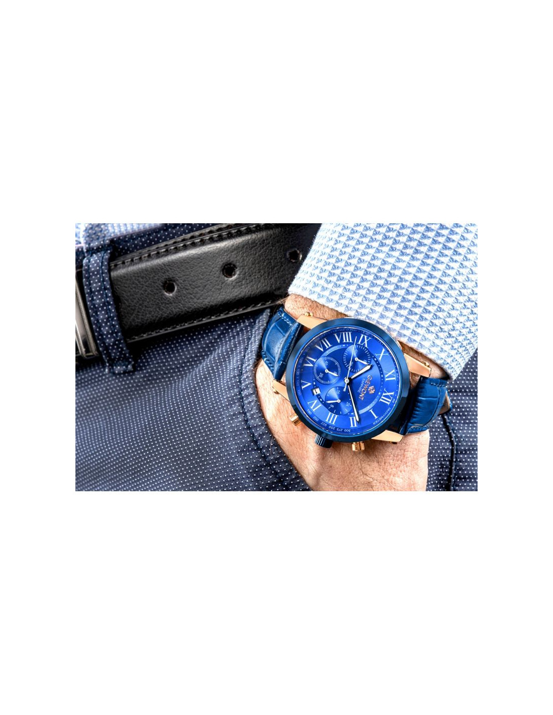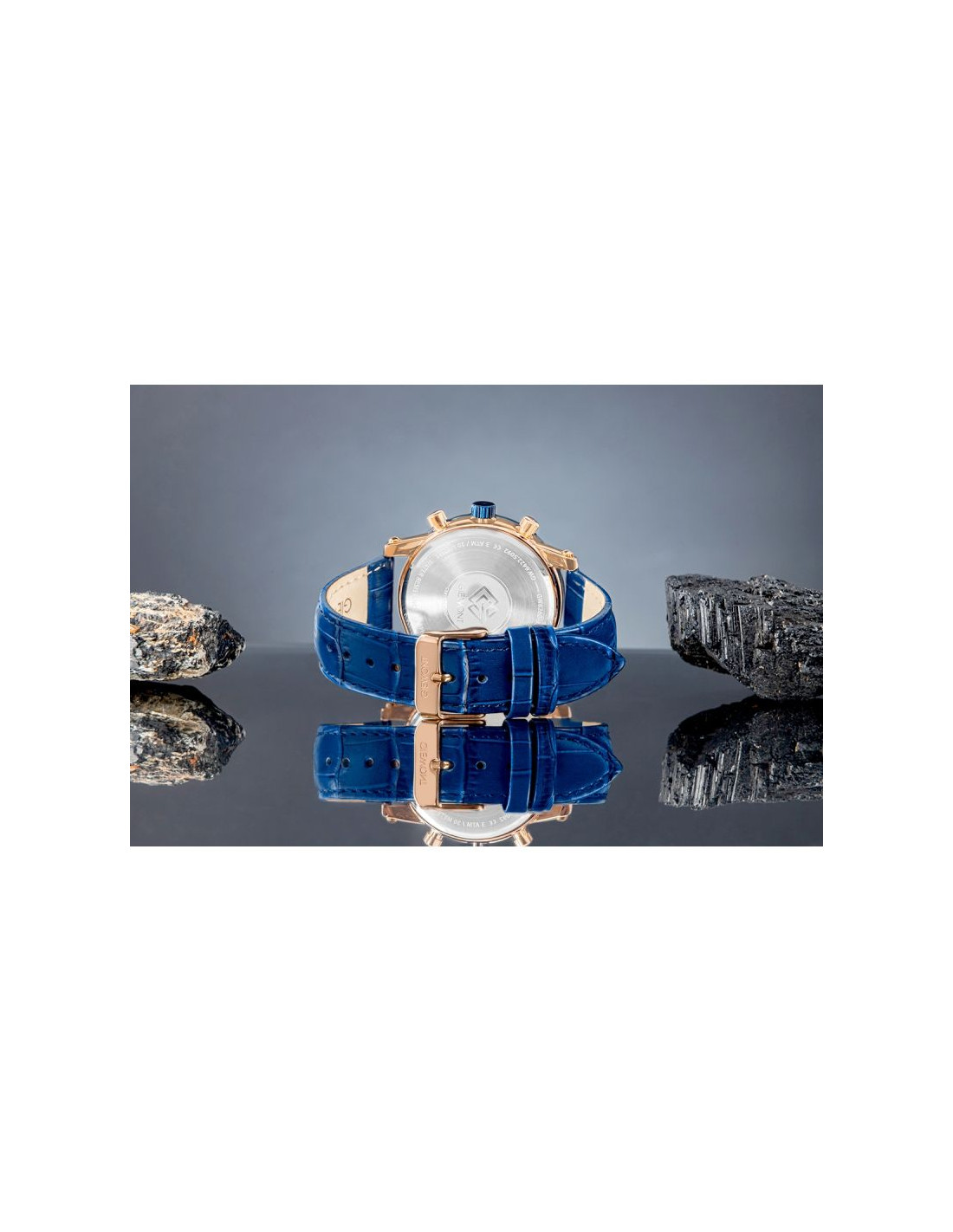 Elegancka, miedziana koperta doskonale komponuje się z granatowym skórzanym paskiem, który zapewnia komfort noszenia i podkreśla luksusowy charakter zegarka. To model stworzony dla mężczyzn, którzy wiedzą, że prawdziwa elegancja tkwi w detalach.