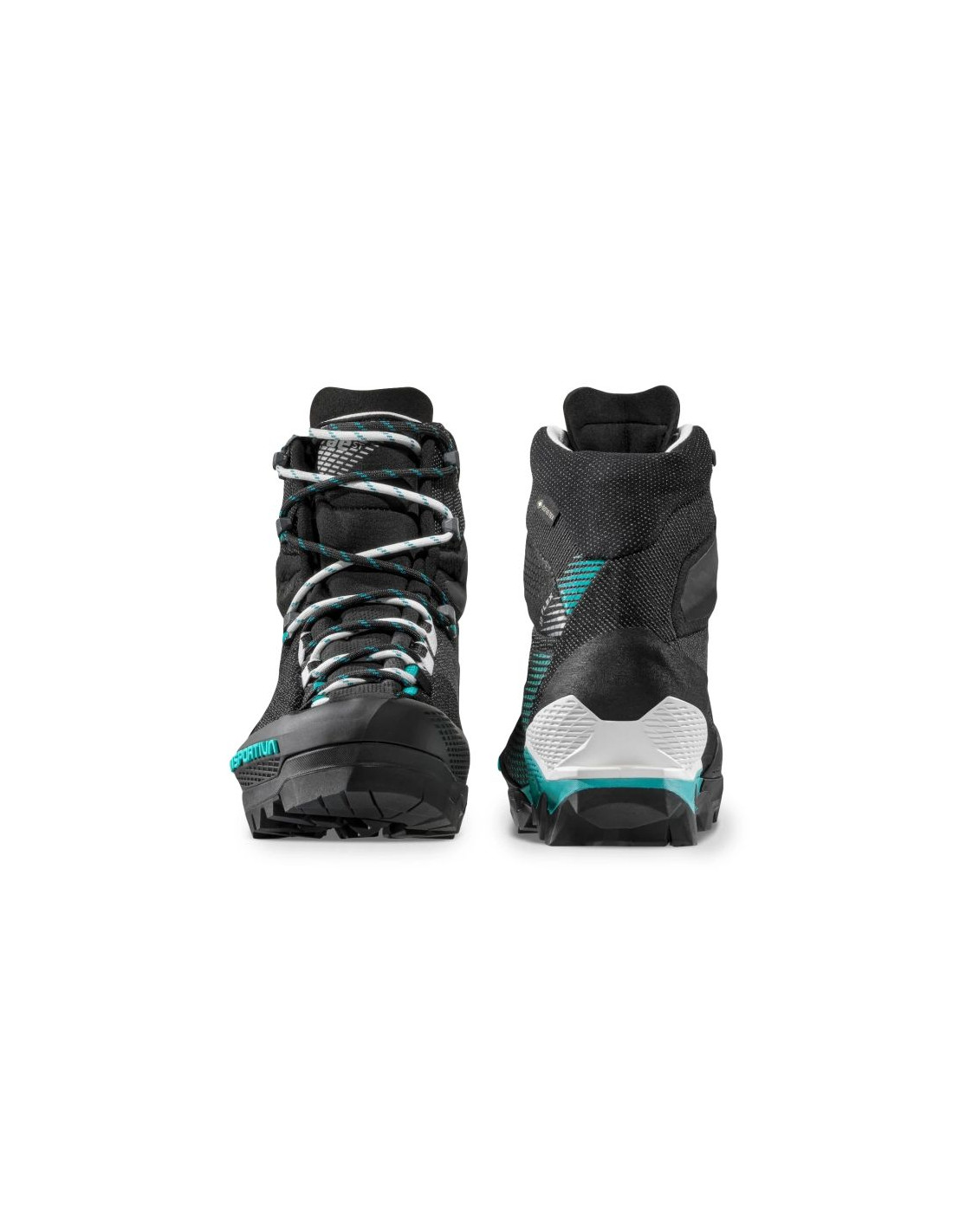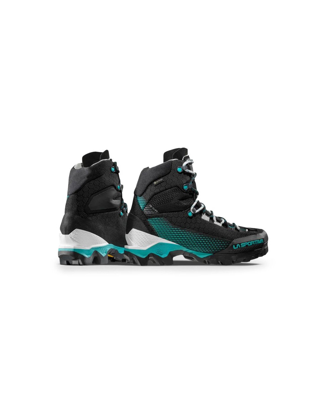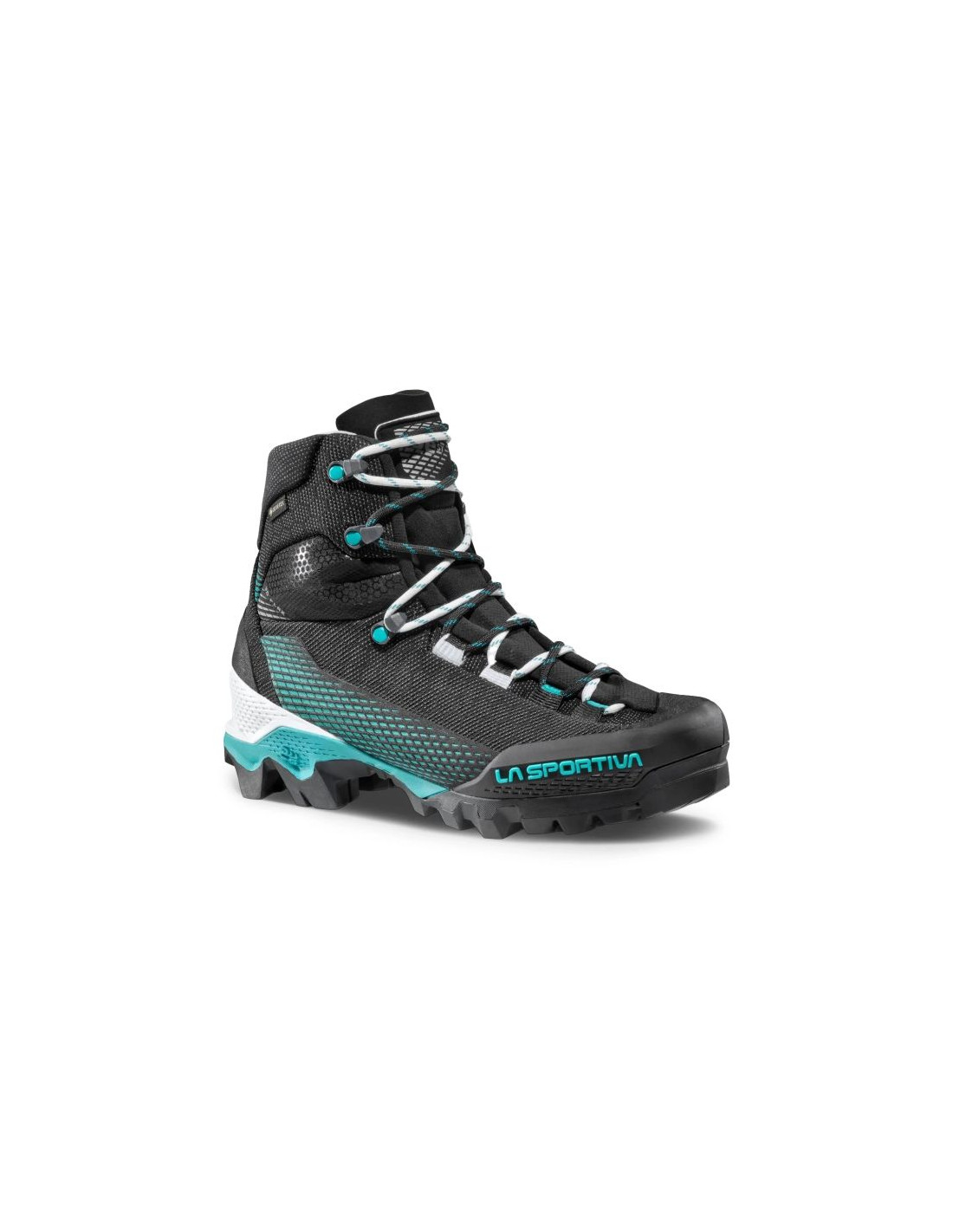 La Sportiva Aequilibrium ST GTX Women Black/Aqua to zaawansowany model outdoorowy idealny do via ferrata, przepraw lodowcowych oraz zróżnicowanego terenu. Cholewka wykonana jest z wodoodpornego nylonu 60.6 z powłoką HoneyComb Guard™ oraz strefami odpornymi na ścieranie, ze wzmocnieniami TPU na nosku i pięcie. Miękka osłona przeciwśnieżna (snow guard) i język ze wstawką typu „bellows” chronią przed dostawaniem się kamieni i śniegu. Membrana GORE-TEX Performance Comfort gwarantuje wodoodporność i dobrą oddychalność. System 3D Flex System Evo™ zapewnia zakres ruchu w kostce przy zachowaniu stabilności. Konstrukcja pięty Double Heel™ z tylnym klinem zwiększa efekt hamujący przy zejściach i umożliwia płynniejszą pracę stopy, co zmniejsza zmęczenie mięśni. Podeszwa zewnętrzna Vibram SpringLug Tech z bieżnikiem Impact Brake System zapewnia przyczepność na skałach i twardych nawierzchniach. Wkładka z nylonu wzmocnionego włóknem szklanym poprawia stabilność stopy. Waga jednej połowy pary to około 515 g.