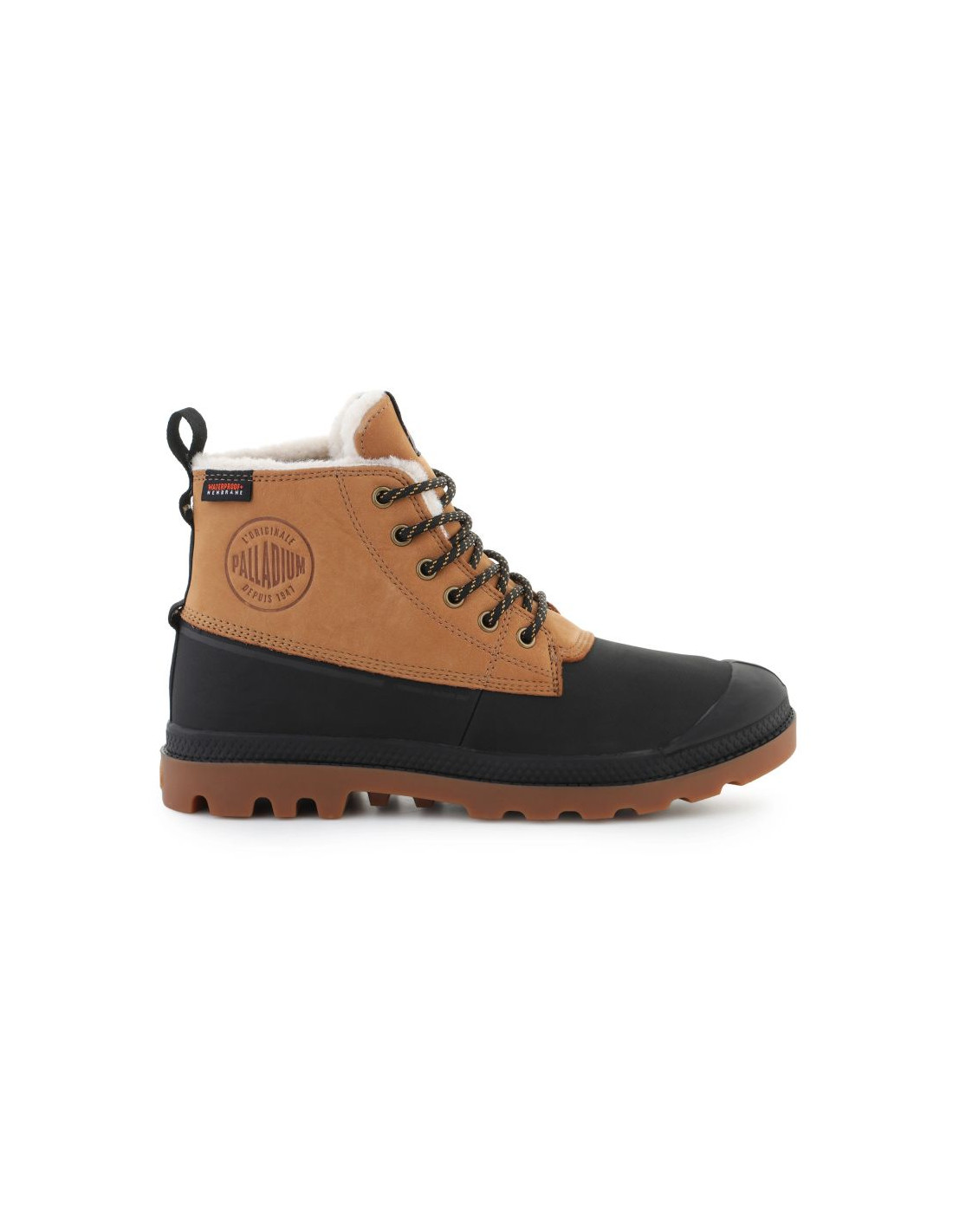 Model Palladium Pampa Duck WL WP+ 79547-254 Dear Brown to wytrzymałe i funkcjonalne buty na zimne i mokre warunki. Górna część cholewki wykonana jest z nubukowej skóry oraz gumowanego panelu w dolnej części, co zapewnia ochronę przed wilgocią i trwałość. Membrana Waterproof Plus skutecznie chroni przed przemoczeniem, a uszczelnione szwy zwiększają wodoodporność.