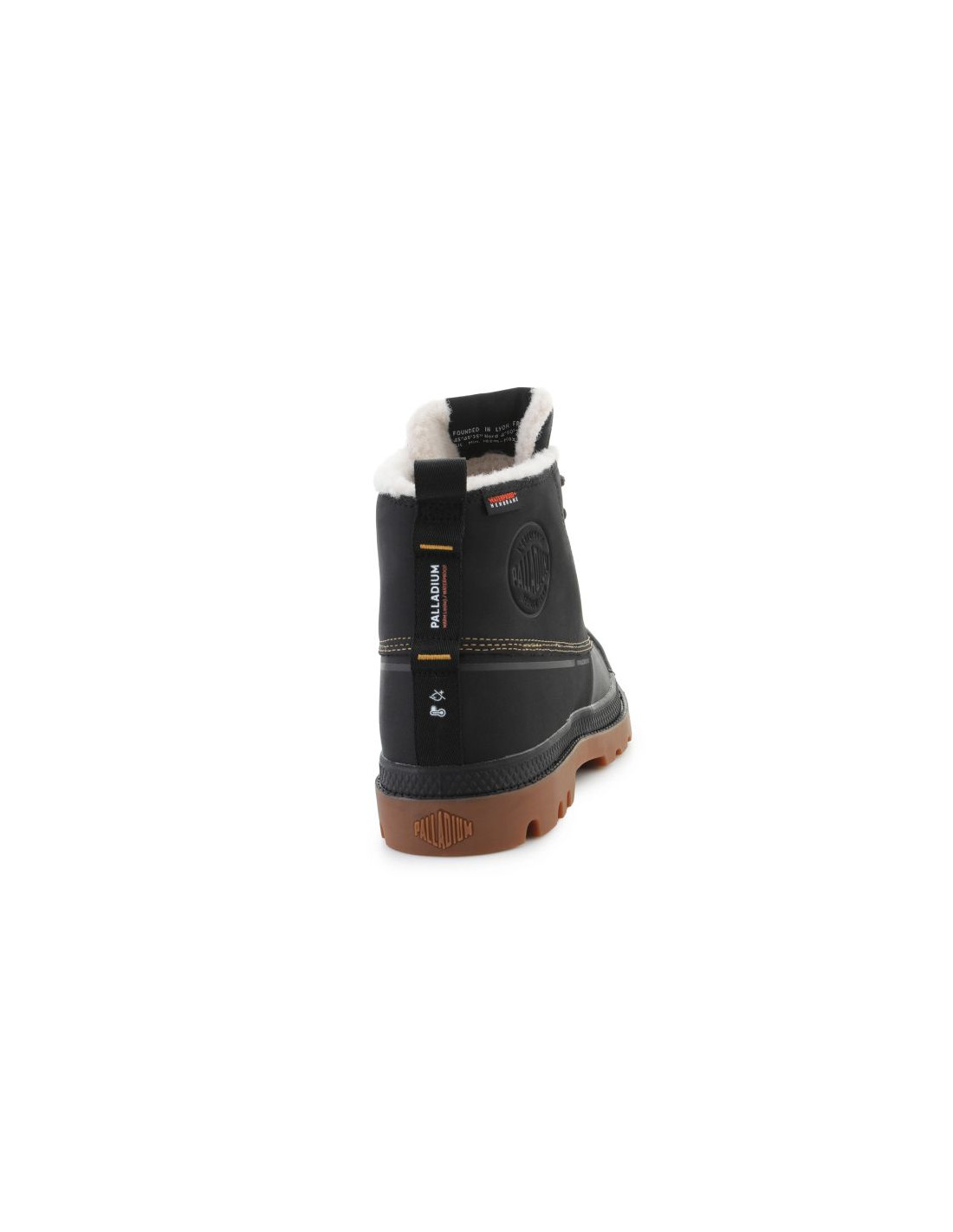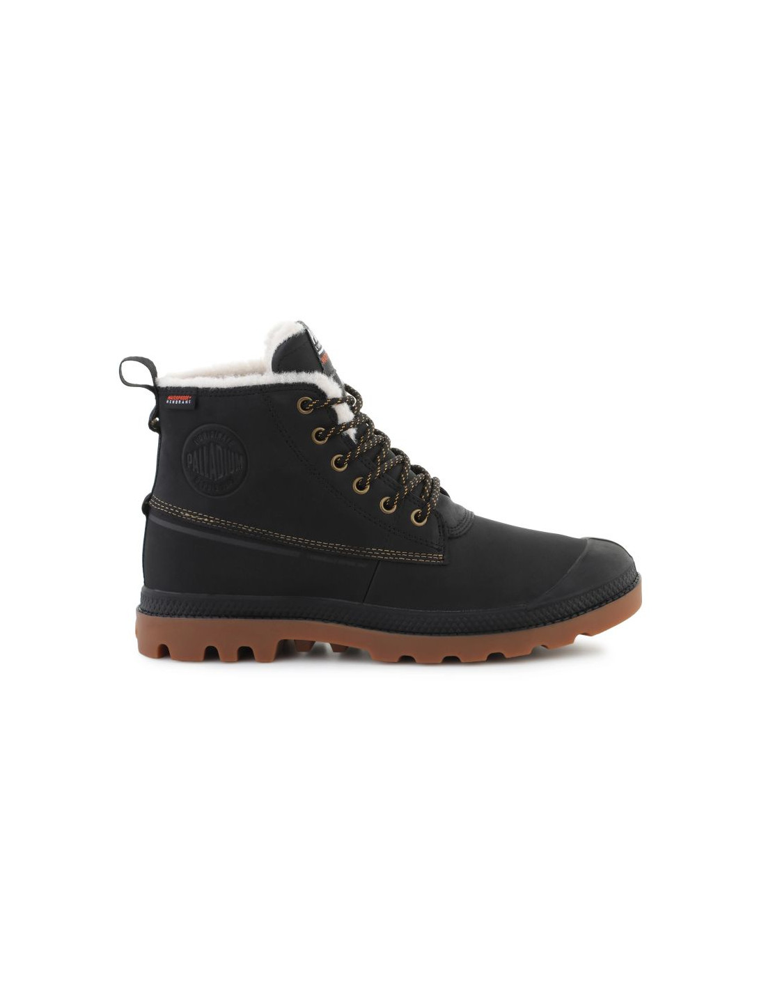 Model Palladium Pampa Duck WL WP+ 79547-008-M Black to solidne buty zaprojektowane na mokrą i chłodną pogodę, łączące klasyczny styl „duck boot” z nowoczesnymi rozwiązaniami. Górna część buta wykonana jest z nubuku (syntetycznego i skórzanego materiału), a dolny panel to guma, co daje dobrą ochronę przed śniegiem i kałużami. Dzięki membranie Waterproof Plus obuwie jest wodoodporne, a uszczelnione szwy zapobiegają przenikanie wilgoci.