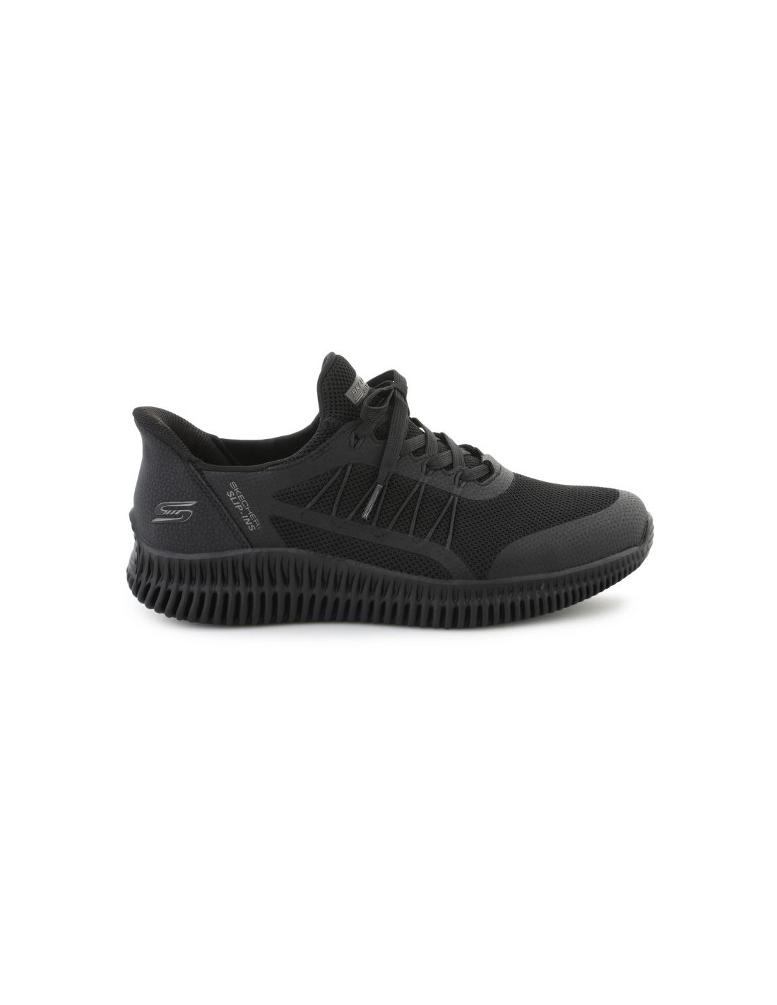 Cholewka wykonana jest z połączenia materiałów tekstylnych (knit) i syntetycznych, co zapewnia przewiewność i elastyczność. Model posiada regulowane sznurowadła dla lepszego dopasowania, ale nadal zachowuje wsuwany charakter. Wnętrze wykończone jest komfortową wkładką Skechers Memory Foam™, która dopasowuje się do kształtu stopy, oferując miękkie amortyzowanie przy każdym kroku.