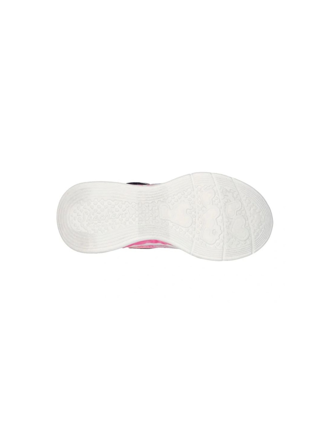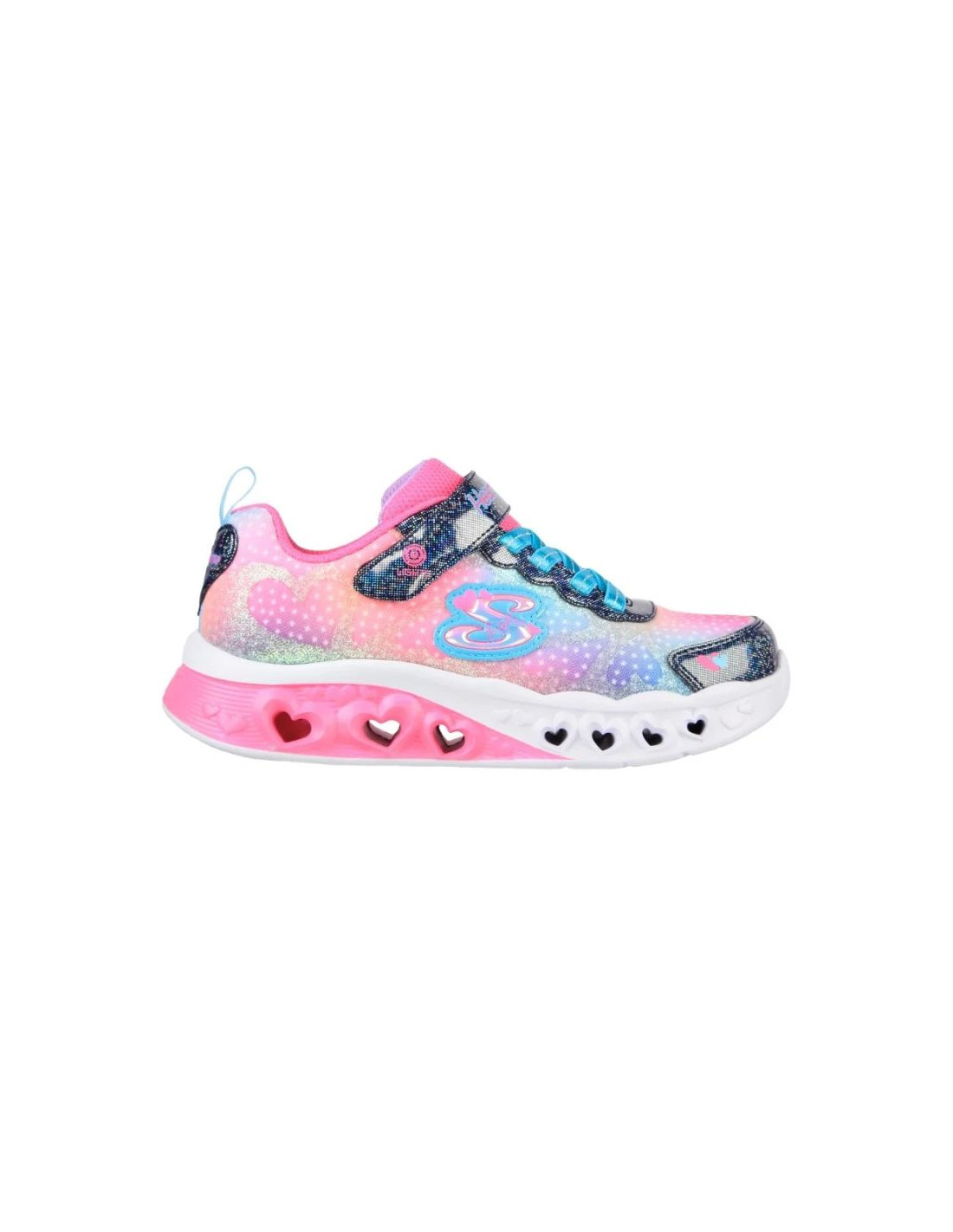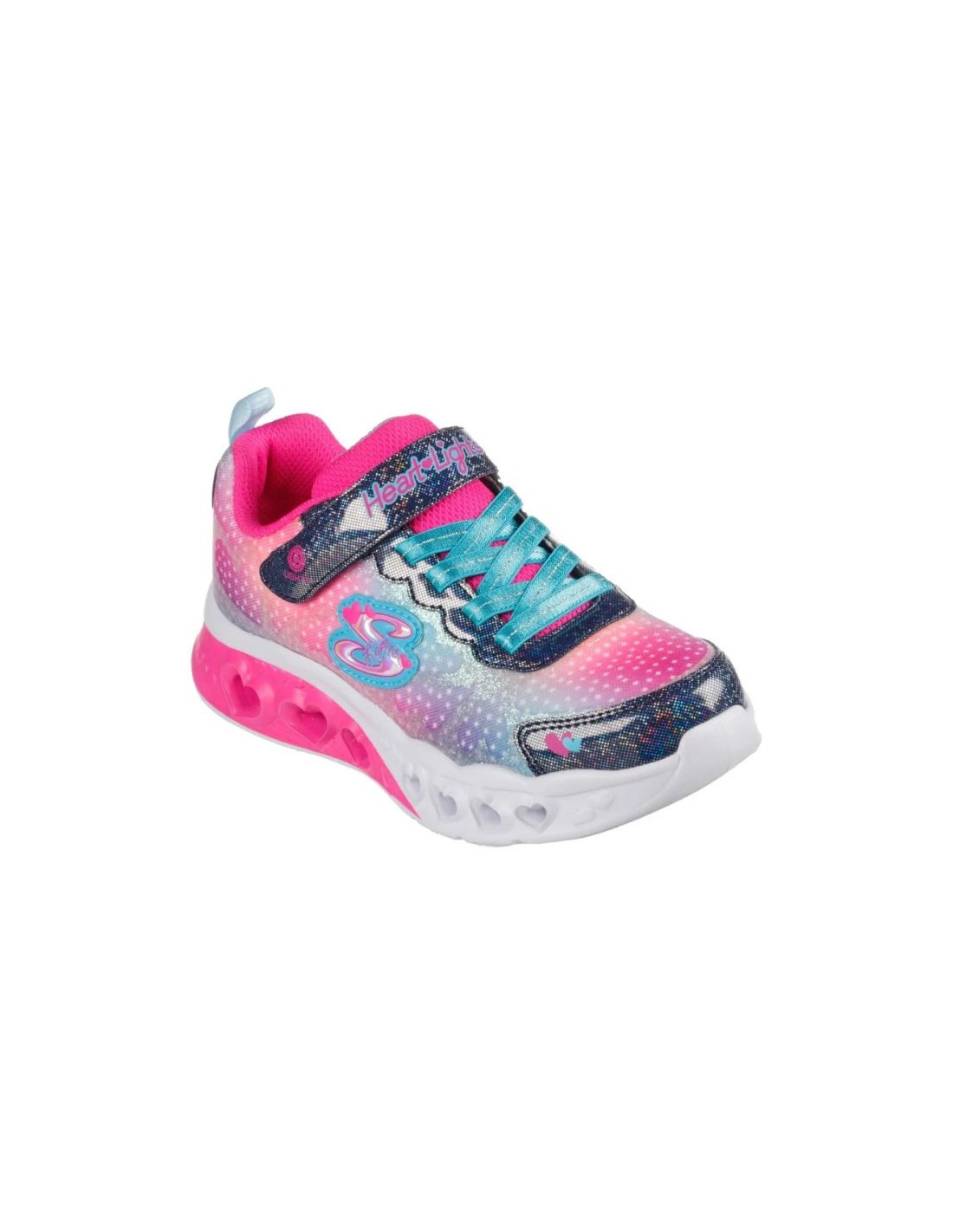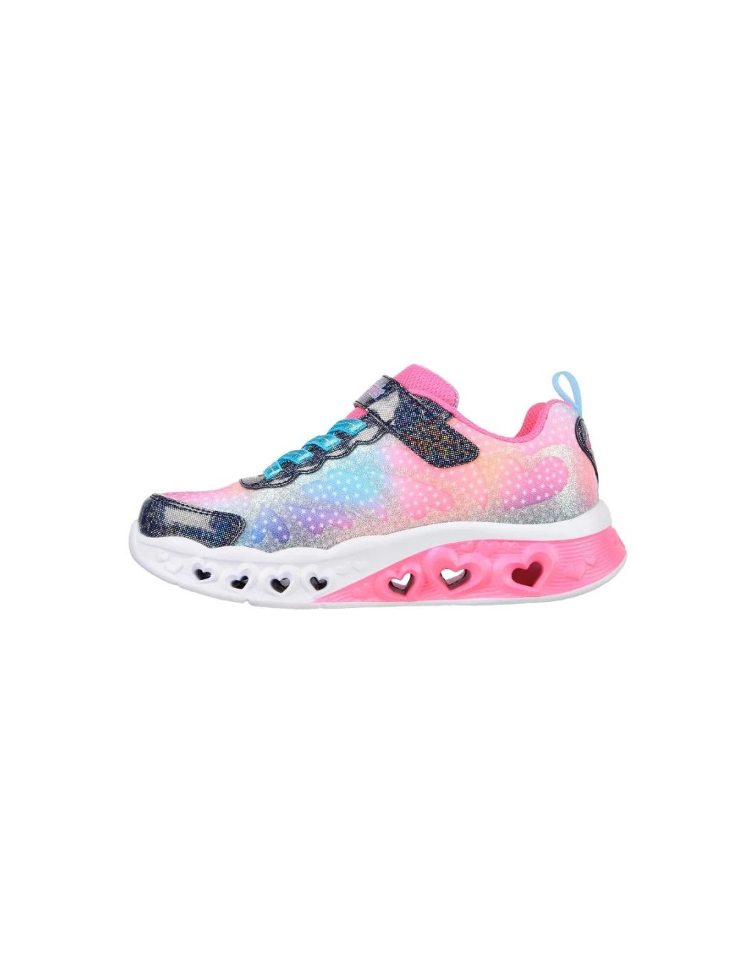 Skechers Flutter Heart Lights - Simply Love to kolorowe dziewczęce sneakersy dziecięce, które rozświetlą każdy krok dzięki trójwymiarowym, świecącym elementom w podeszwie, zaprojektowanym w formie serduszek. Model ten wyróżnia się lekką, wsuwaną konstrukcją typu slip-on z elastycznymi sznurowadłami z przodu, co ułatwia zakładanie i zapewnia wygodę podczas zabawy i codziennych aktywności. Cholewka wykonana jest z tekstyliów z ombre printem i syntetycznymi brokatowymi aplikacjami w kształcie serc, które dodają dziewczęcego i radosnego charakteru.