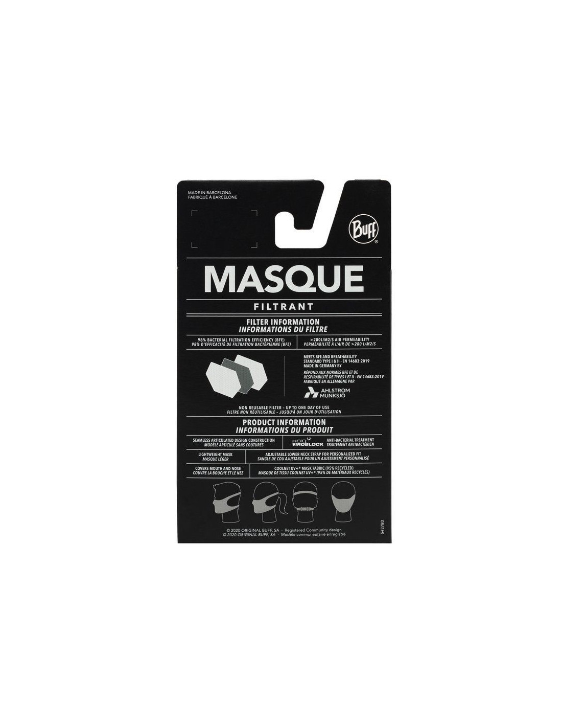 Filtr wykonany z trzech połączonych warstw zapewnia 98% skuteczność filtracji bakteryjnej (BFE) i doskonałą oddychalność. Został wyprodukowany w Niemczech, aby pasował do maski BUFF®. Filtr jednorazowego użytku nie zawiera kleju i lateksu.