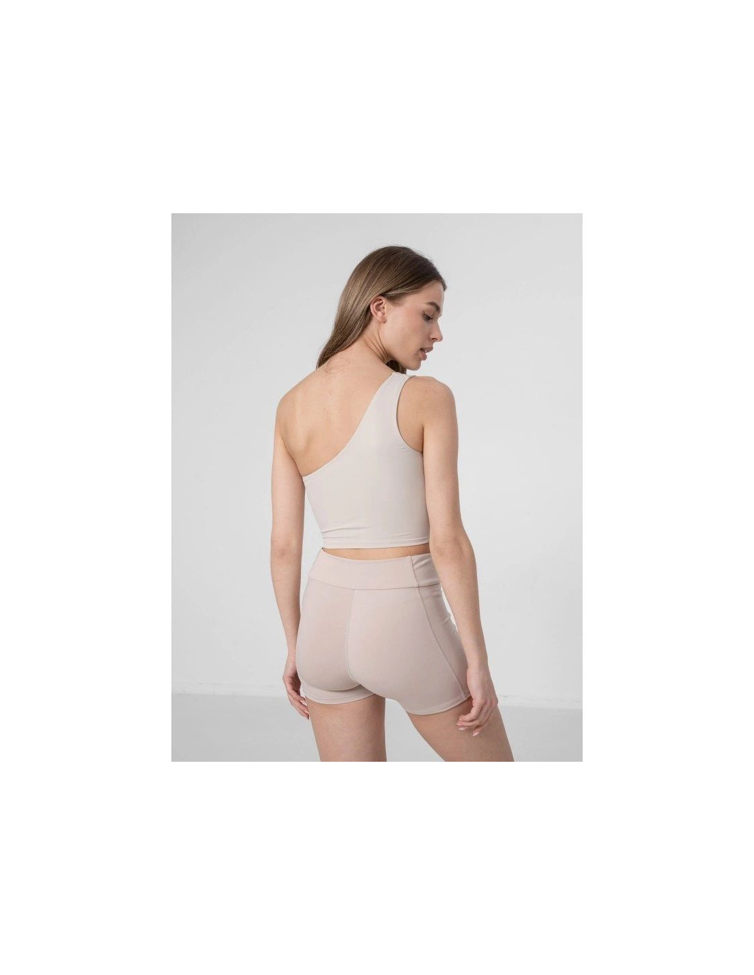 Crop top do jogi na jedno ramię damski. Uszyliśmy go z dopasowanej dzianiny z dodatkiem elastanu. Posiada elastyczne nici, które nie powodują otarć podczas sesji.