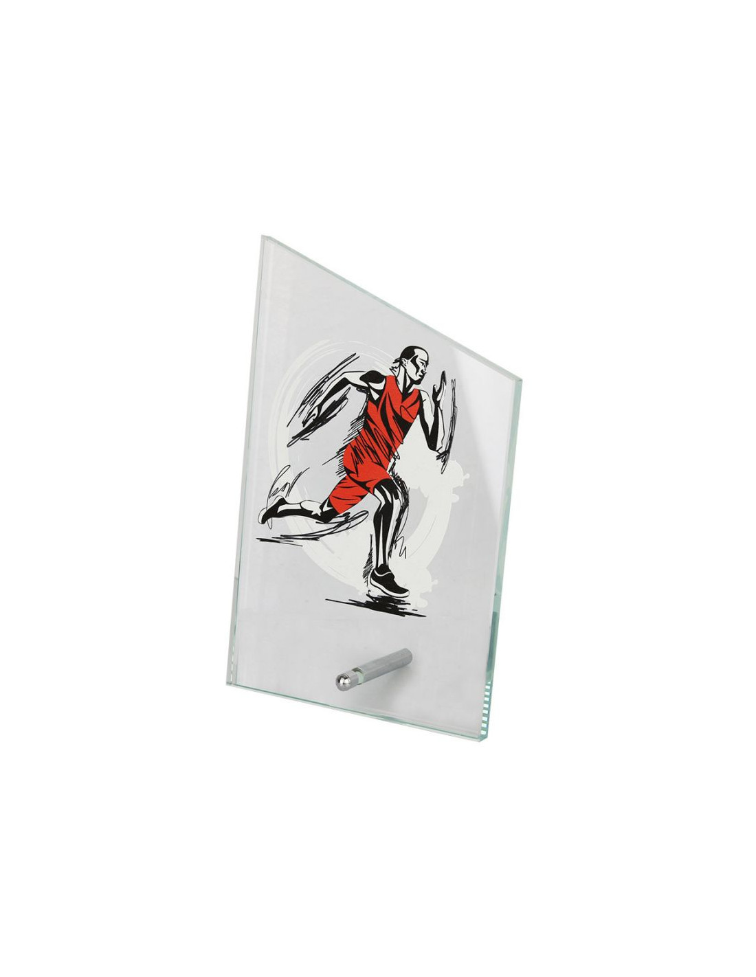 Przezroczyste trofeum ścięte pod skosem wykonane ze szkła z metalową podpórką. Istnieje możliwość wykonania grawertonu na tabliczce - usługa dodatkowa (cena uzależniona od powierzchni nadruku).
