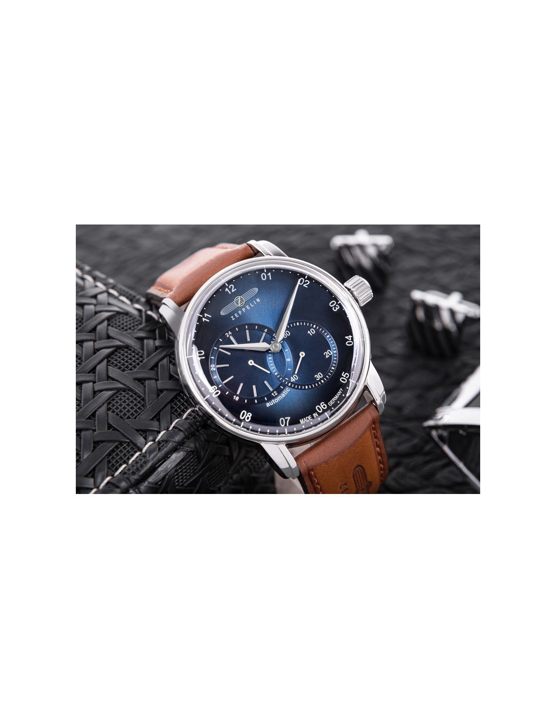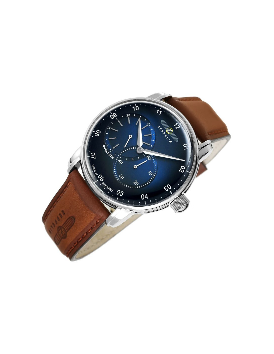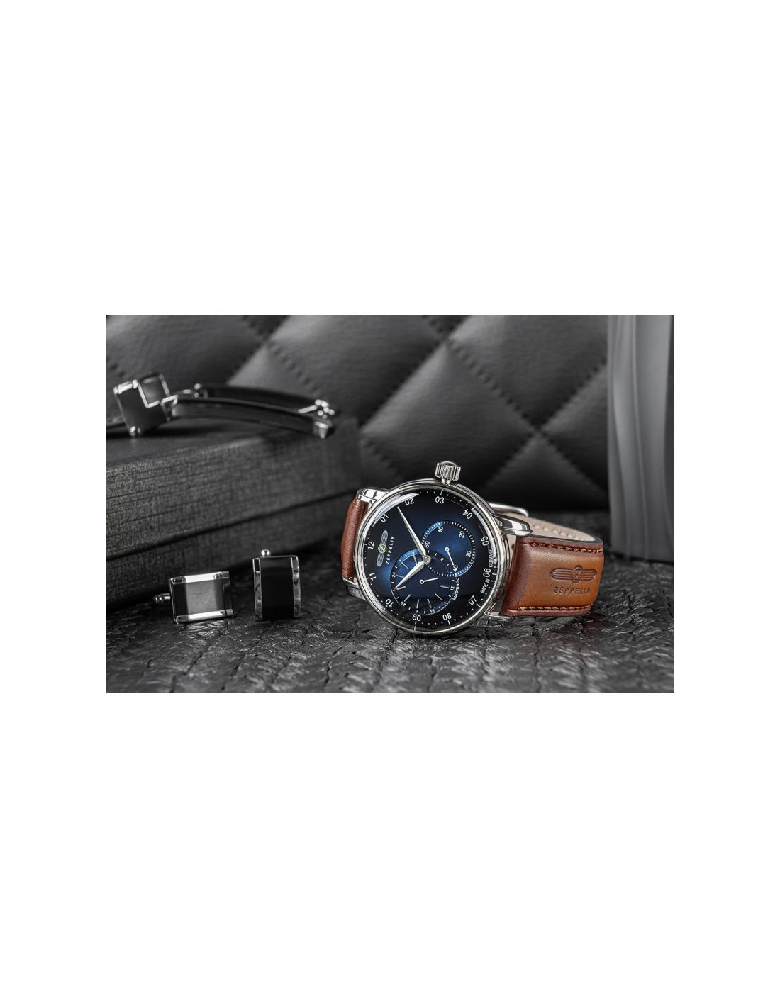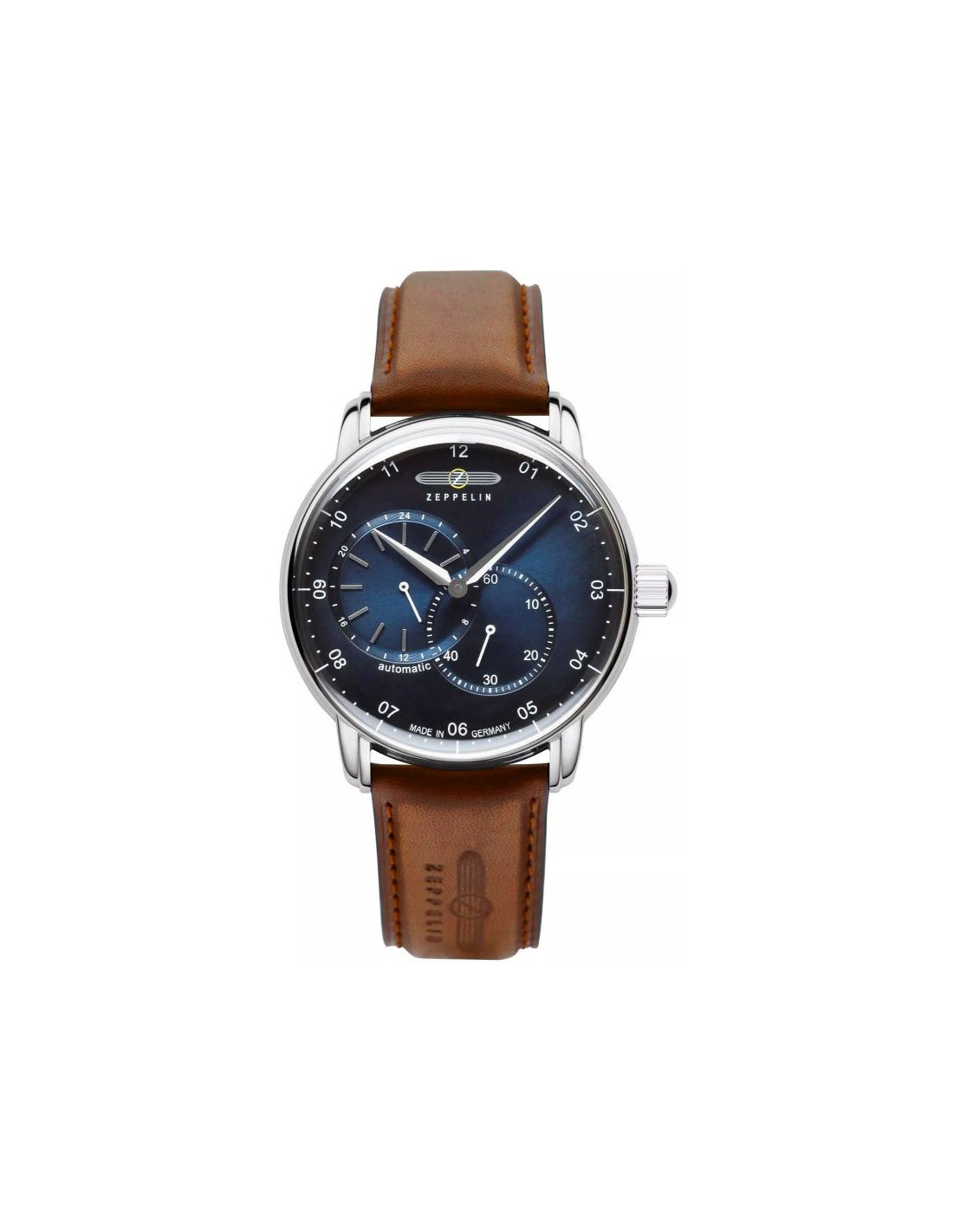 Jego elegancka, srebrna koperta idealnie komponuje się z głęboką granatową tarczą o metalicznym wykończeniu, przyciągając spojrzenia subtelnymi refleksami światła. Srebrne indeksy i wskazówki z białymi akcentami dodają mu ponadczasowej klasy i zapewniają wyjątkową czytelność. Pasek wykonany z wysokiej jakości skóry w jasnobrązowym odcieniu, zszyty brązową nicią, co dodaje mu subtelnego charakteru vintage. Na pasku znajduje się tłoczone logo Zeppelin oraz napis, które podkreślają luksusowy i autentyczny charakter zegarka. Każdy element, od solidnej srebrnej sprzączki po stylową koronkę, został dopracowany, by stworzyć spójną i wyjątkową kompozycję.