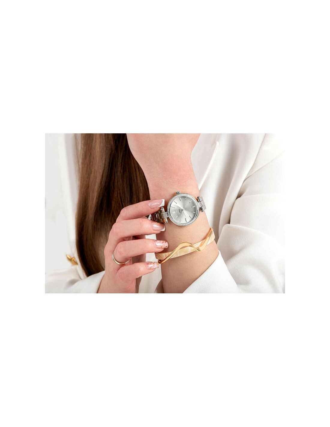 Mocna bransoleta wykonana z perfekcyjnie stali szlachetnej to element, który nie sposób przeoczyć. Każde ogniwo zostało zaprojektowane tak, by doskonale układać się na nadgarstku, zapewniając jednocześnie maksymalny komfort. Nieprzesadzona, doskonała w dotyku, wyrafinowana i solidna - jest jak stalowa obręcz, która mocno trzyma zegarek na Twoim nadgarstku, przypominając Ci o stabilności. Każde ogniwo jest starannie dopracowane, dzięki temu zegarek doskonale pasuje zarówno do codziennych, jak i formalnych stylizacji. Precyzyjnie wykonane zapięcie dopełnia ten mocny, kobiecy charakter zegarka.
