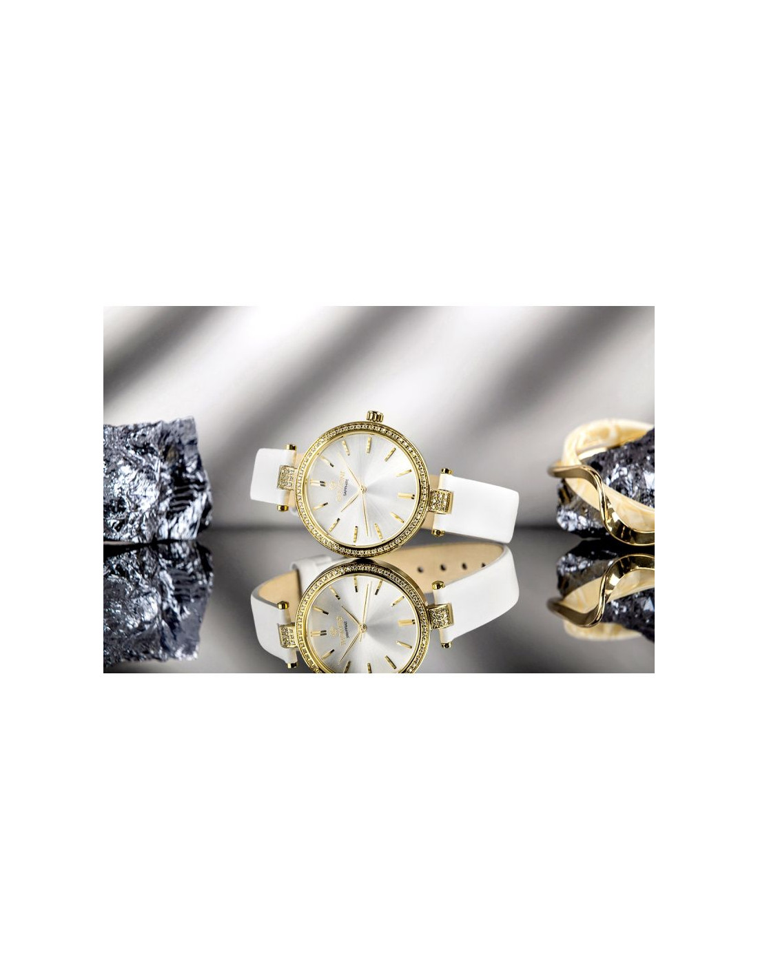 Kopertę otacza subtelny rząd cyrkonii, które tworzą delikatną oprawę przypominającą jubilerski pierścień. Kamienie dyskretnie połyskują przy każdym ruchu dłoni, nadając zegarkowi szlachetnego blasku i luksusowego wyrazu. Dodatkowe cyrkonie umieszczone przy połączeniach koperty z paskiem stanowią biżuteryjny detal, który przyciąga uwagę swoją precyzją i elegancją.