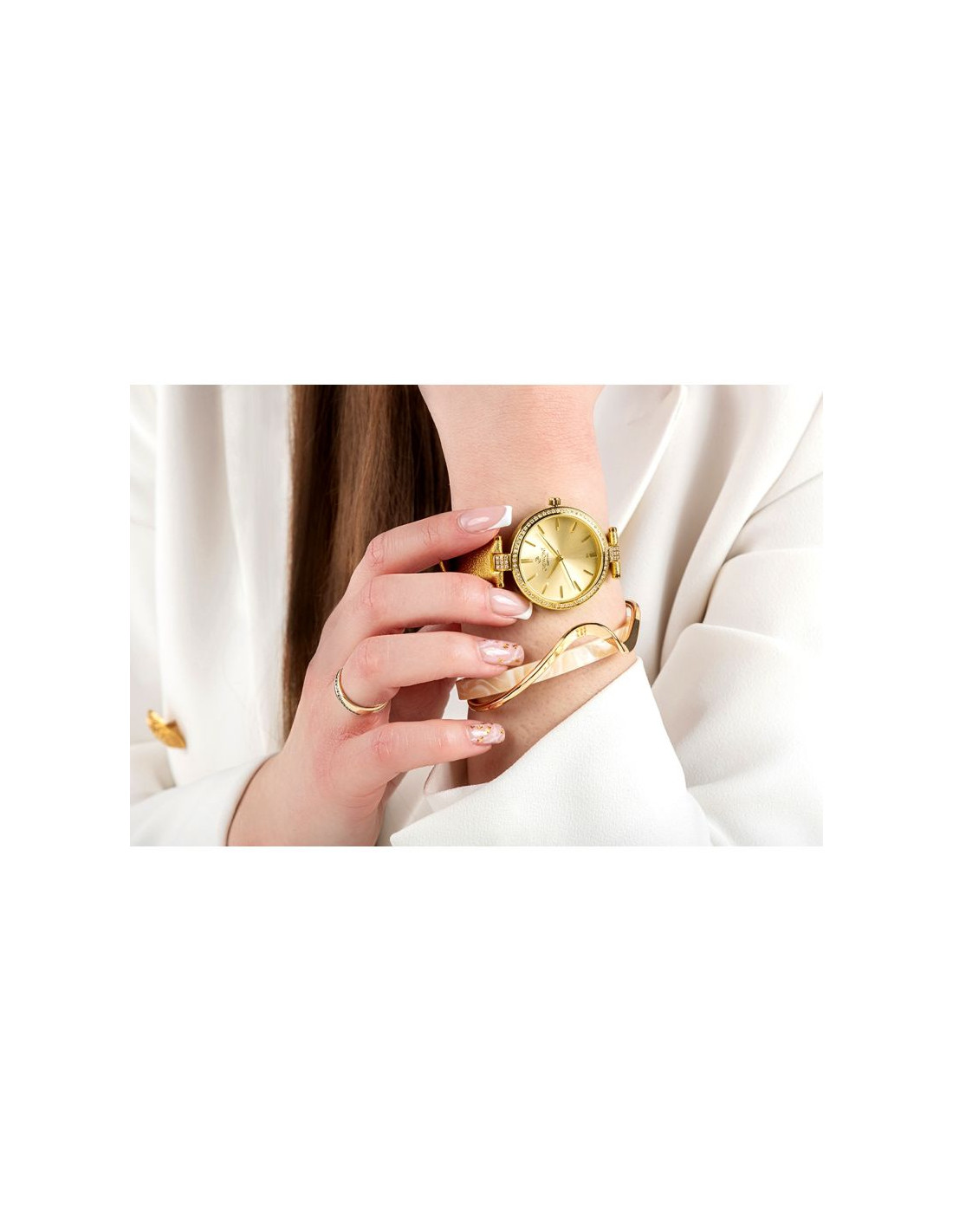 Kopertę otacza subtelny rząd cyrkonii, które tworzą delikatną oprawę przypominającą jubilerski pierścień. Kamienie dyskretnie połyskują przy każdym ruchu dłoni, nadając zegarkowi szlachetnego blasku i luksusowego wyrazu. Dodatkowe cyrkonie umieszczone przy połączeniach koperty z paskiem stanowią biżuteryjny detal, który przyciąga uwagę swoją precyzją i elegancją.