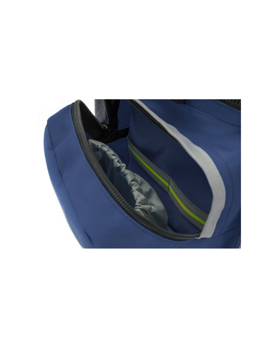 Przednia kieszeń posiada uchwyty gumowe oraz przezroczystą kieszeń zamykaną na suwak, a z tyłu znajduje się płaska kieszeń na suwak.