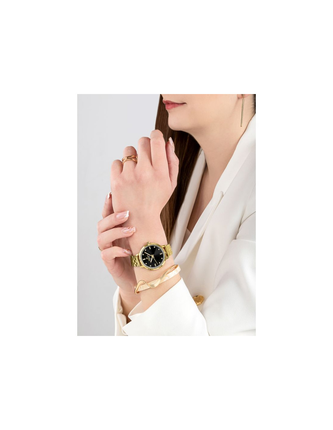 Zegarek osadzono na delikatnej bransolecie, która miękko układa się na nadgarstku, zapewniając komfort noszenia przez cały dzień. Jej subtelna konstrukcja doskonale współgra z lekką sylwetką zegarka, czyniąc go naturalnym dodatkiem zarówno do codziennych, jak i bardziej eleganckich zestawów.