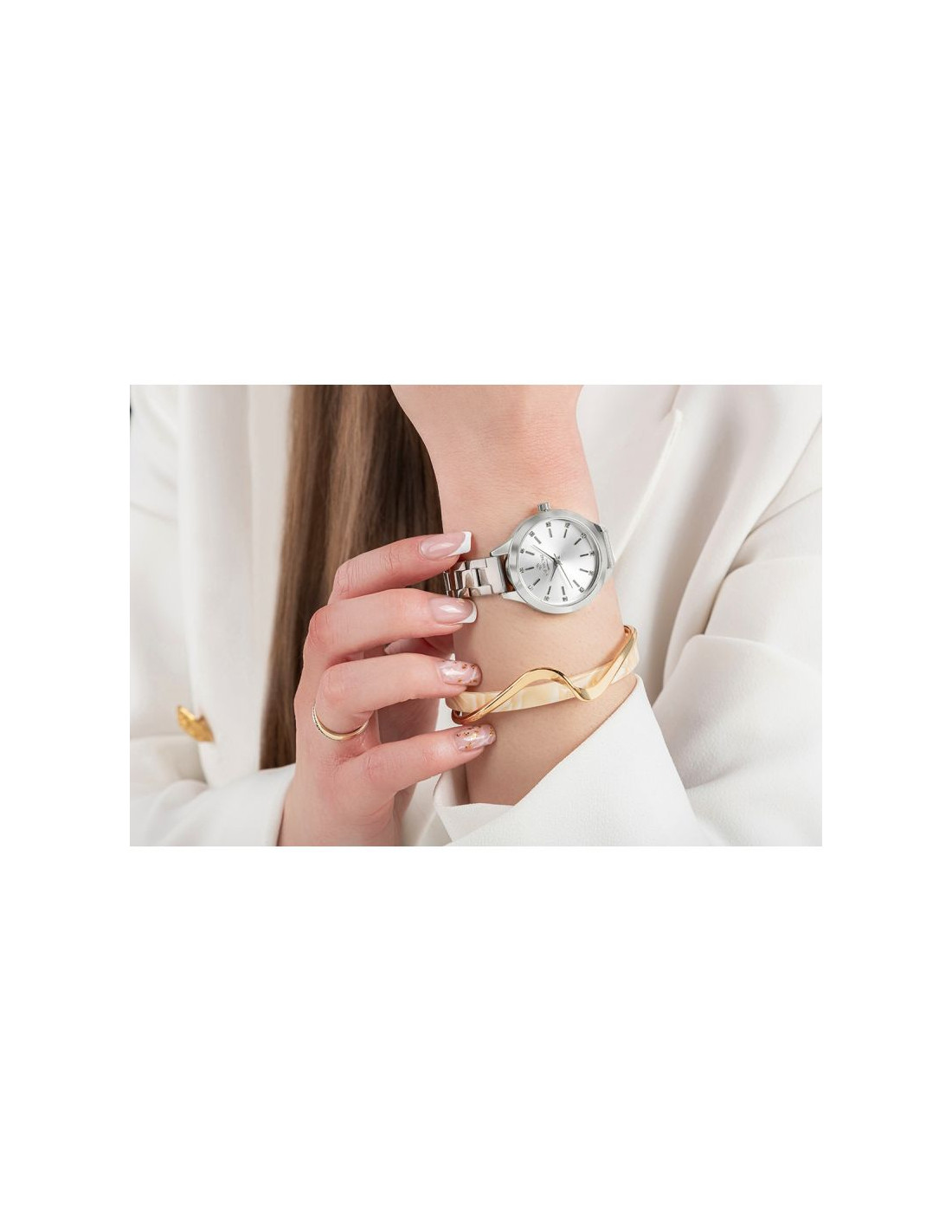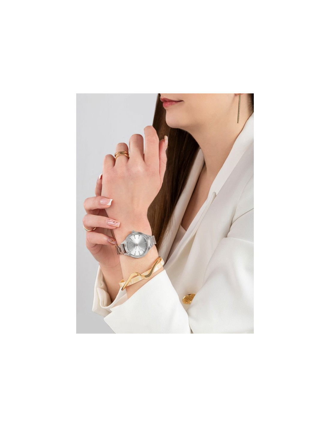 Mocna bransoleta wykonana z perfekcyjnie stali szlachetnej to element, który nie sposób przeoczyć. Każde ogniwo zostało zaprojektowane tak, by doskonale układać się na nadgarstku, zapewniając jednocześnie maksymalny komfort. Nieprzesadzona, doskonała w dotyku, wyrafinowana i solidna - jest jak stalowa obręcz, która mocno trzyma zegarek na Twoim nadgarstku, przypominając Ci o stabilności. Każde ogniwo jest starannie dopracowane, dzięki temu zegarek doskonale pasuje zarówno do codziennych, jak i formalnych stylizacji. Precyzyjnie wykonane zapięcie dopełnia ten mocny, kobiecy charakter zegarka.
