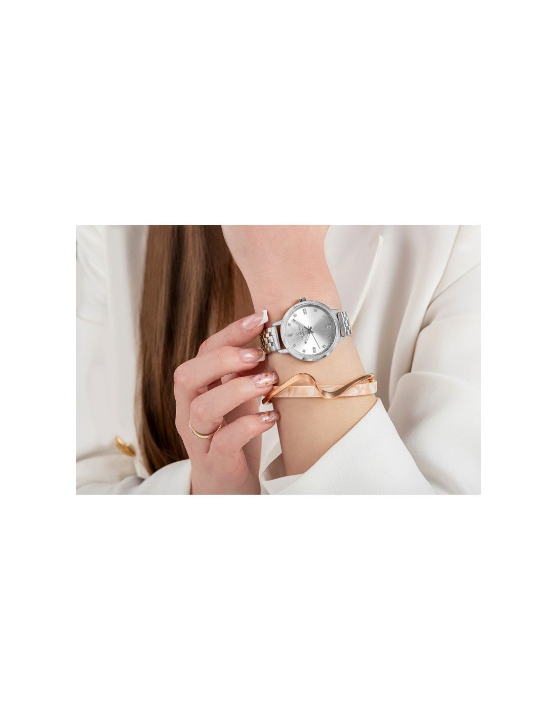 Zegarek osadzono na delikatnej bransolecie, która miękko układa się na nadgarstku, zapewniając komfort noszenia przez cały dzień. Jej subtelna konstrukcja doskonale współgra z lekką sylwetką zegarka, czyniąc go naturalnym dodatkiem zarówno do codziennych, jak i bardziej eleganckich zestawów.