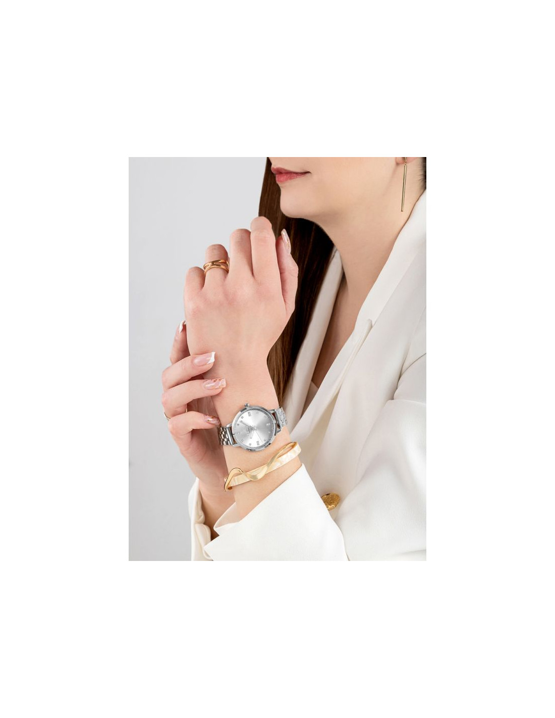 Mocna bransoleta wykonana z perfekcyjnie stali szlachetnej to element, który nie sposób przeoczyć. Każde ogniwo zostało zaprojektowane tak, by doskonale układać się na nadgarstku, zapewniając jednocześnie maksymalny komfort. Nieprzesadzona, doskonała w dotyku, wyrafinowana i solidna - jest jak stalowa obręcz, która mocno trzyma zegarek na Twoim nadgarstku, przypominając Ci o stabilności. Każde ogniwo jest starannie dopracowane, dzięki temu zegarek doskonale pasuje zarówno do codziennych, jak i formalnych stylizacji. Precyzyjnie wykonane zapięcie dopełnia ten mocny, kobiecy charakter zegarka.