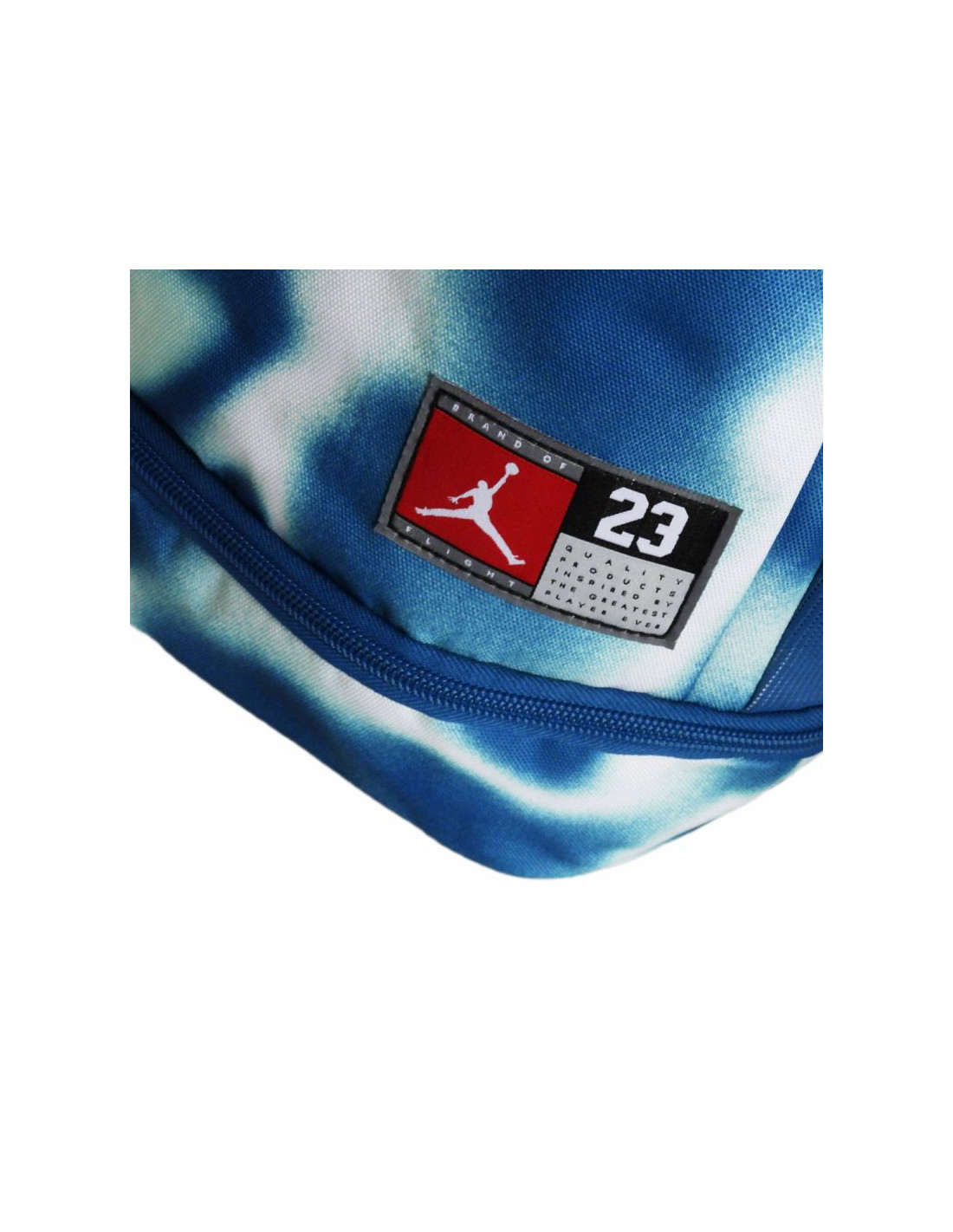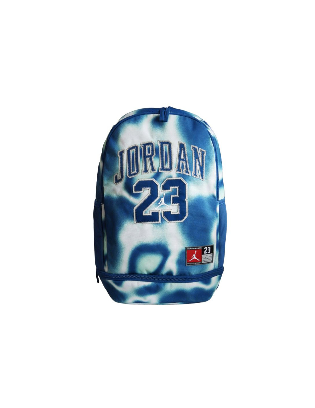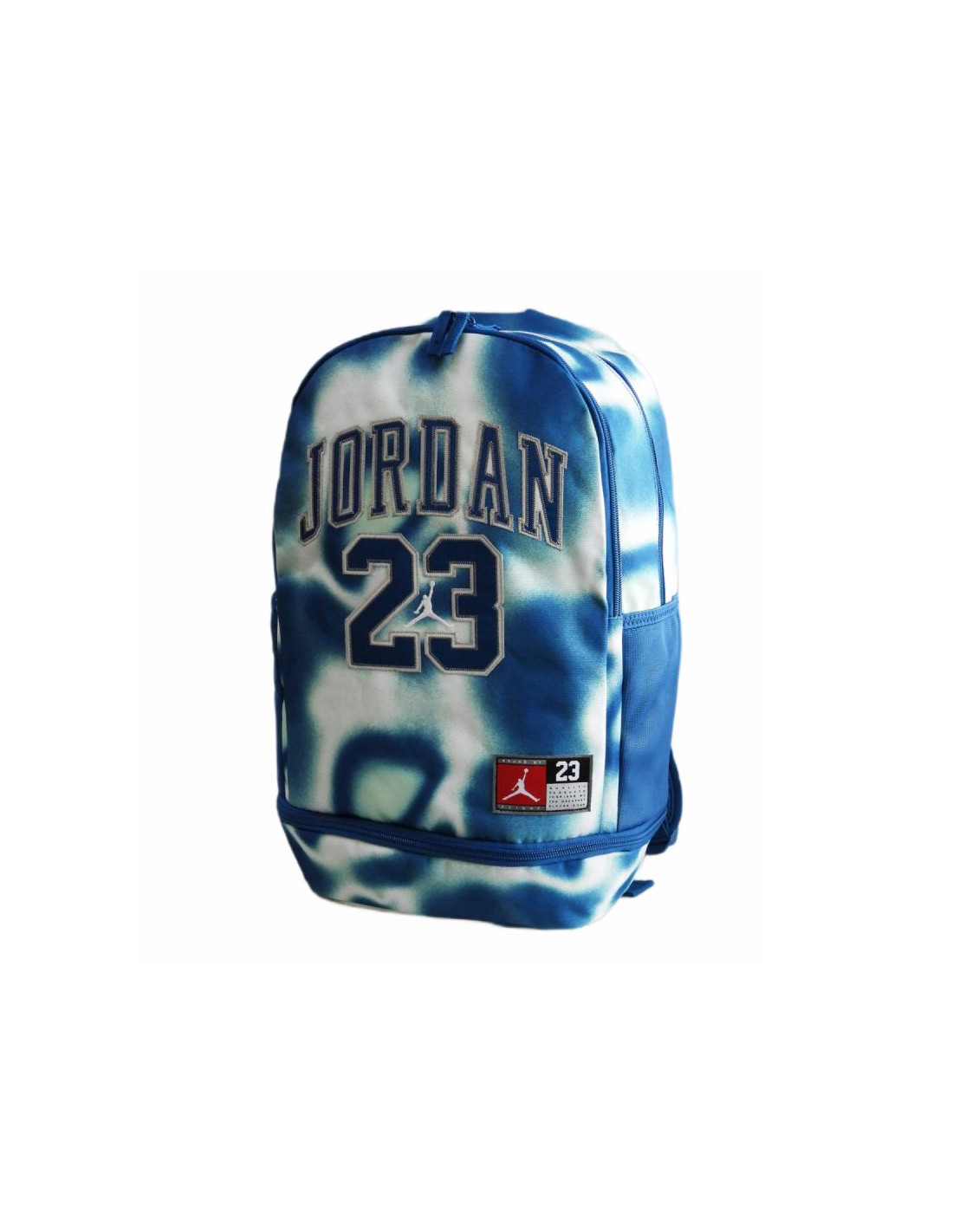 Plecak wniebieskiej kolorystyce z dużym napisem "Jordan 23" oraz niewielkim logotypem Jumpmana na froncie.