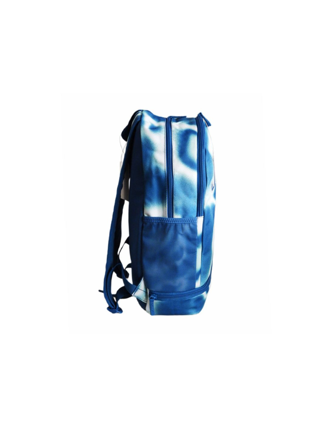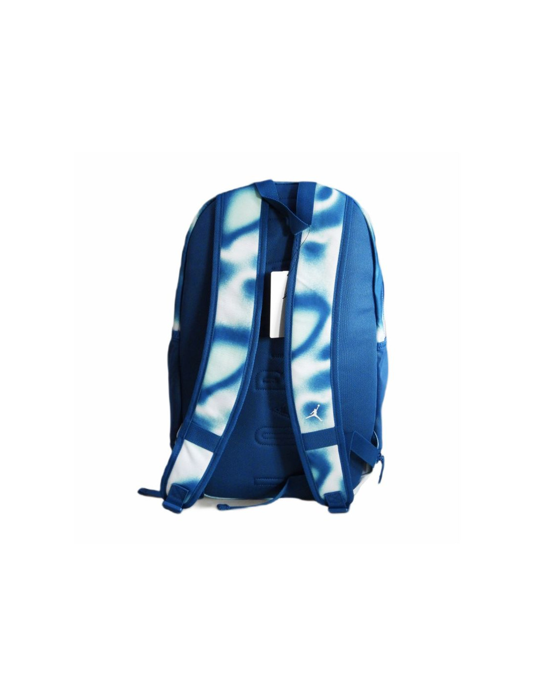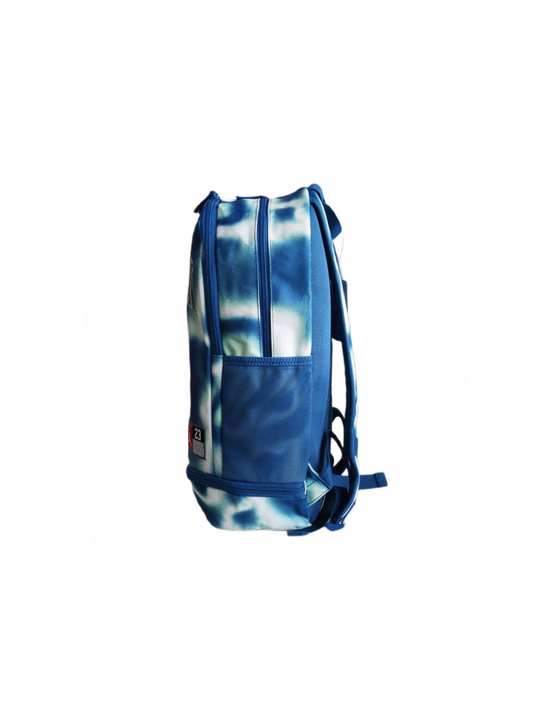 Plecak wniebieskiej kolorystyce z dużym napisem "Jordan 23" oraz niewielkim logotypem Jumpmana na froncie.