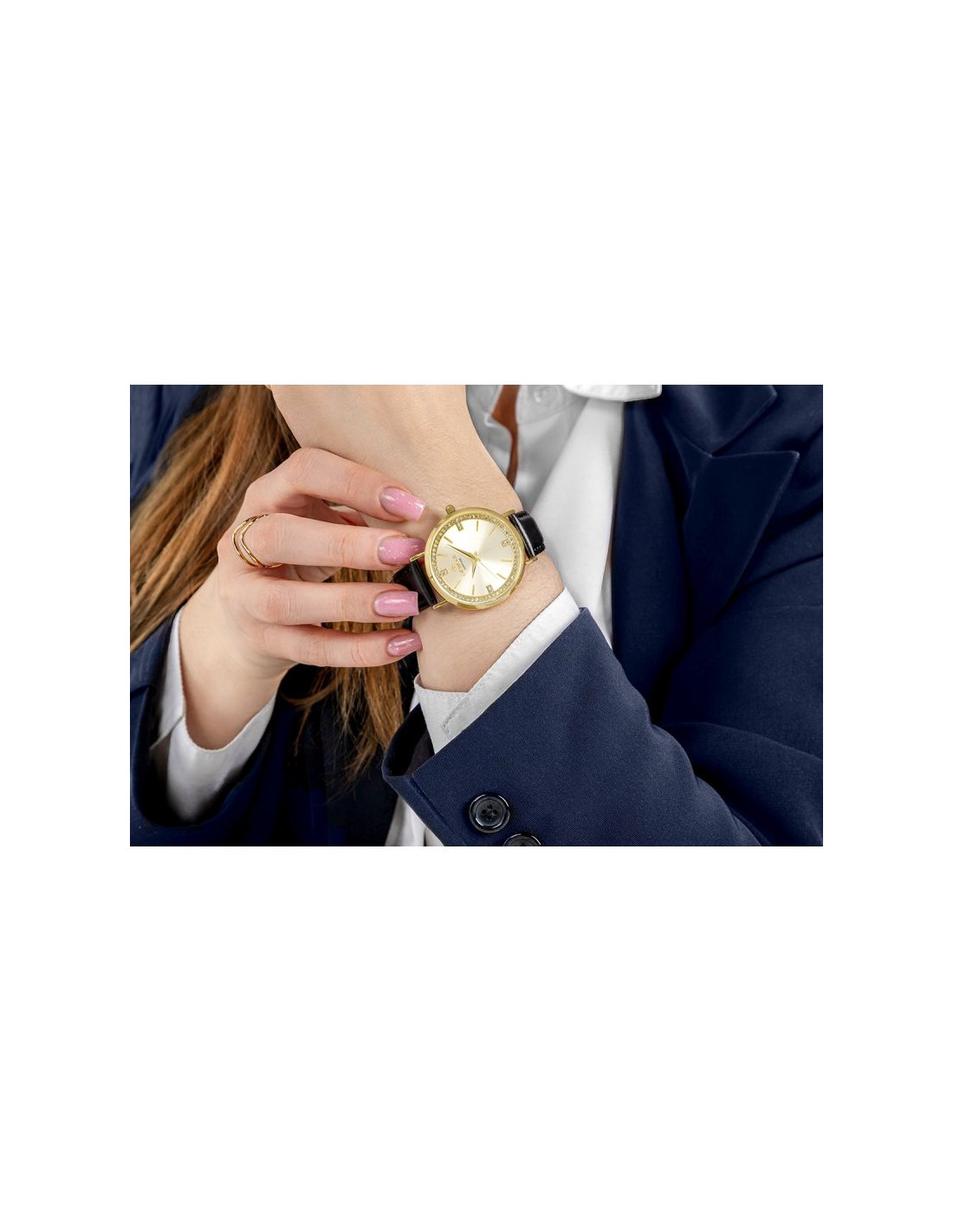 Koperta zachowuje delikatną linię i wyważoną formę, dzięki czemu zegarek miękko układa się na nadgarstku i pozostaje komfortowy przez cały dzień. Pasek wykonany z naturalnej skóry dopełnia całość eleganckim akcentem, oferując przyjemne dopasowanie oraz wysoki komfort noszenia. Jego klasyczna forma podkreśla biżuteryjny charakter modelu i nadaje mu uniwersalności.