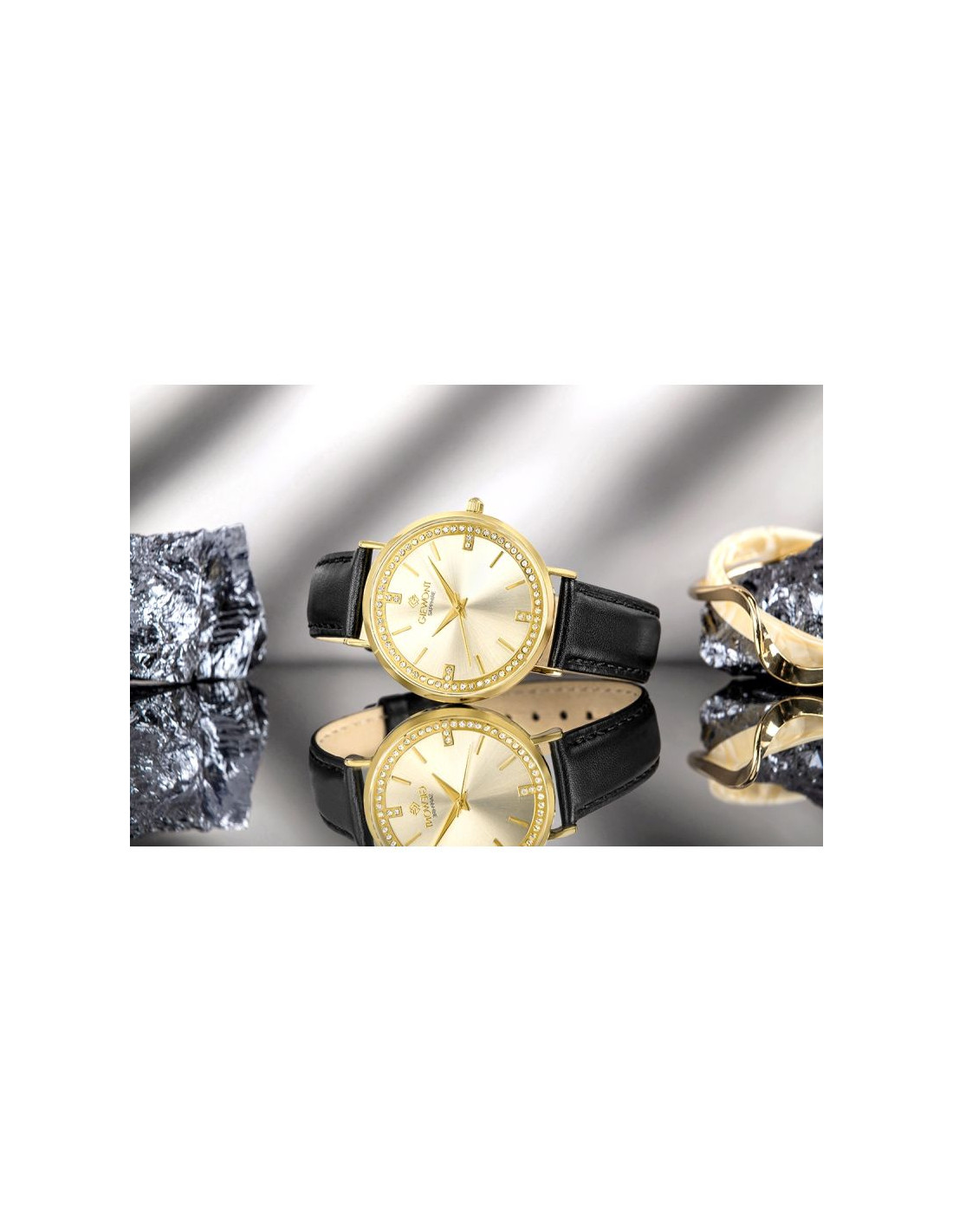 Wnętrze tarczy zdobi dyskretny pierścień z cyrkonii, tworzący efekt miękkiego, jubilerskiego połysku. Kamienie zostały rozmieszczone z wyjątkowym wyczuciem, dzięki czemu stanowią delikatne tło dla kompozycji, nie zakłócając jej przejrzystości. Dodatkowe cyrkonie pełnią rolę indeksów w kluczowych punktach tarczy — na godzinach 12, 3, 6 i 9 — wprowadzając subtelny rytm i elegancką symetrię.