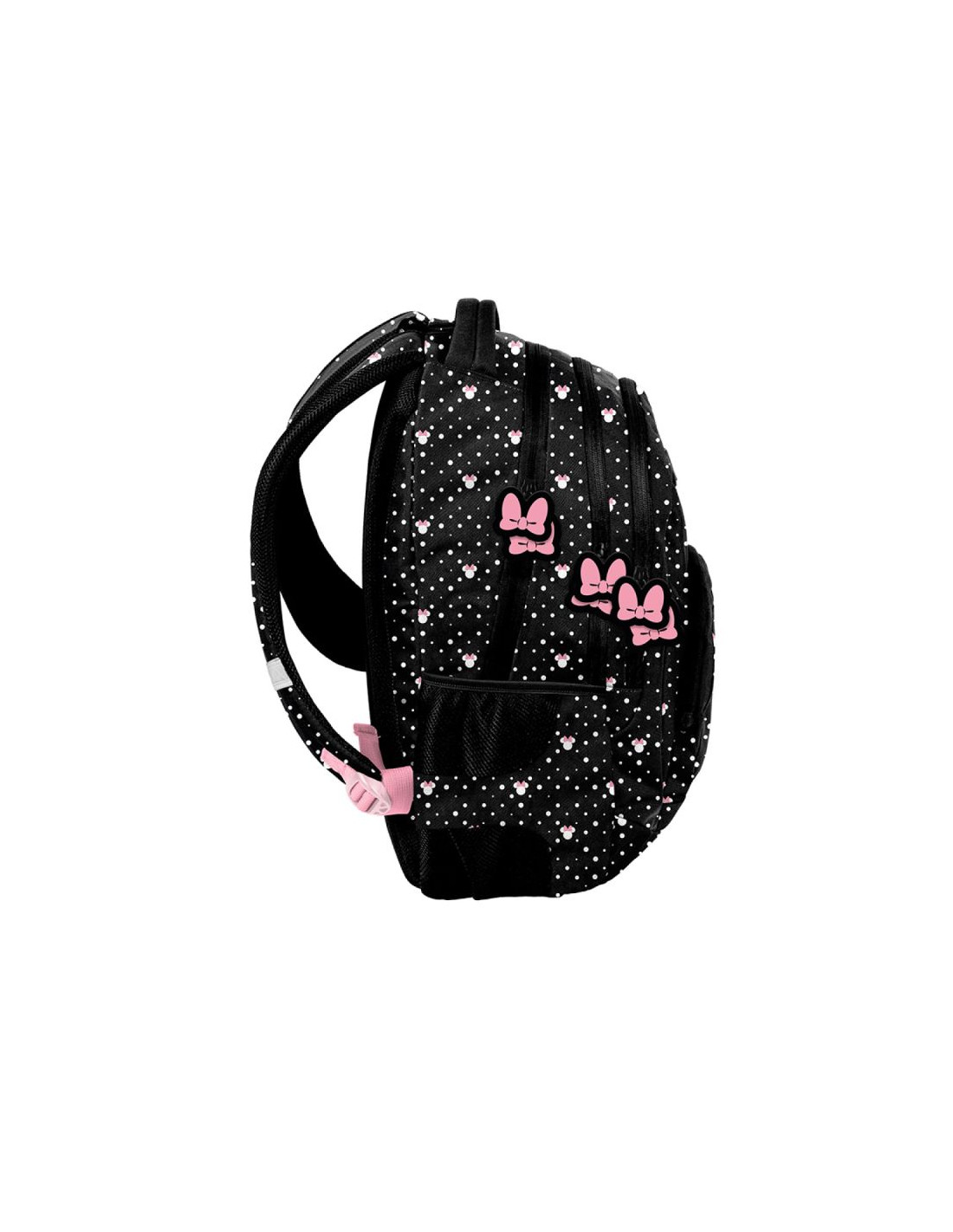 Plecak w kolorzeczarnymz różowymi nadrukami nawiązującymi dopostaci bajek Walta Disneya - Myszki Minnie.