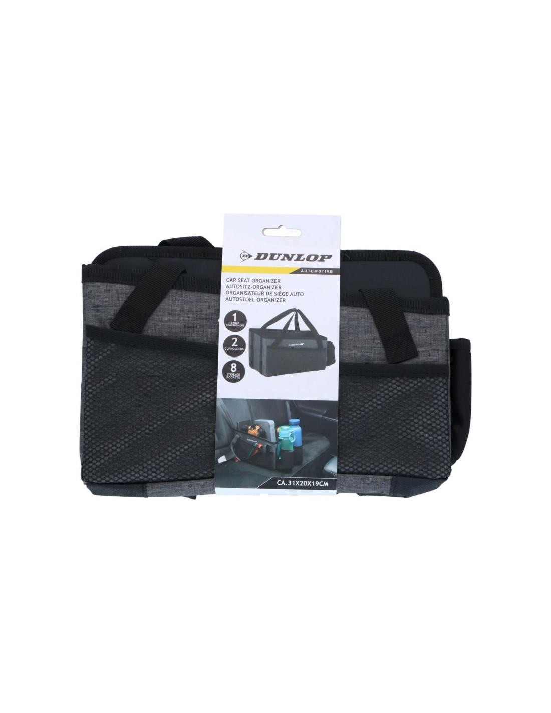 ORGANIZER SCHOWEK TORBA NA TYLNY FOTEL SAMOCHODOWY 30X20X19CM DUNLOP został zaprojektowany tak, aby zwiększyć funkcjonalność tylnej kanapy w samochodzie. Umieszczony między pasażerami z tyłu tworzy dodatkowy praktyczny schowek na drobiazgi potrzebne podczas jazdy.