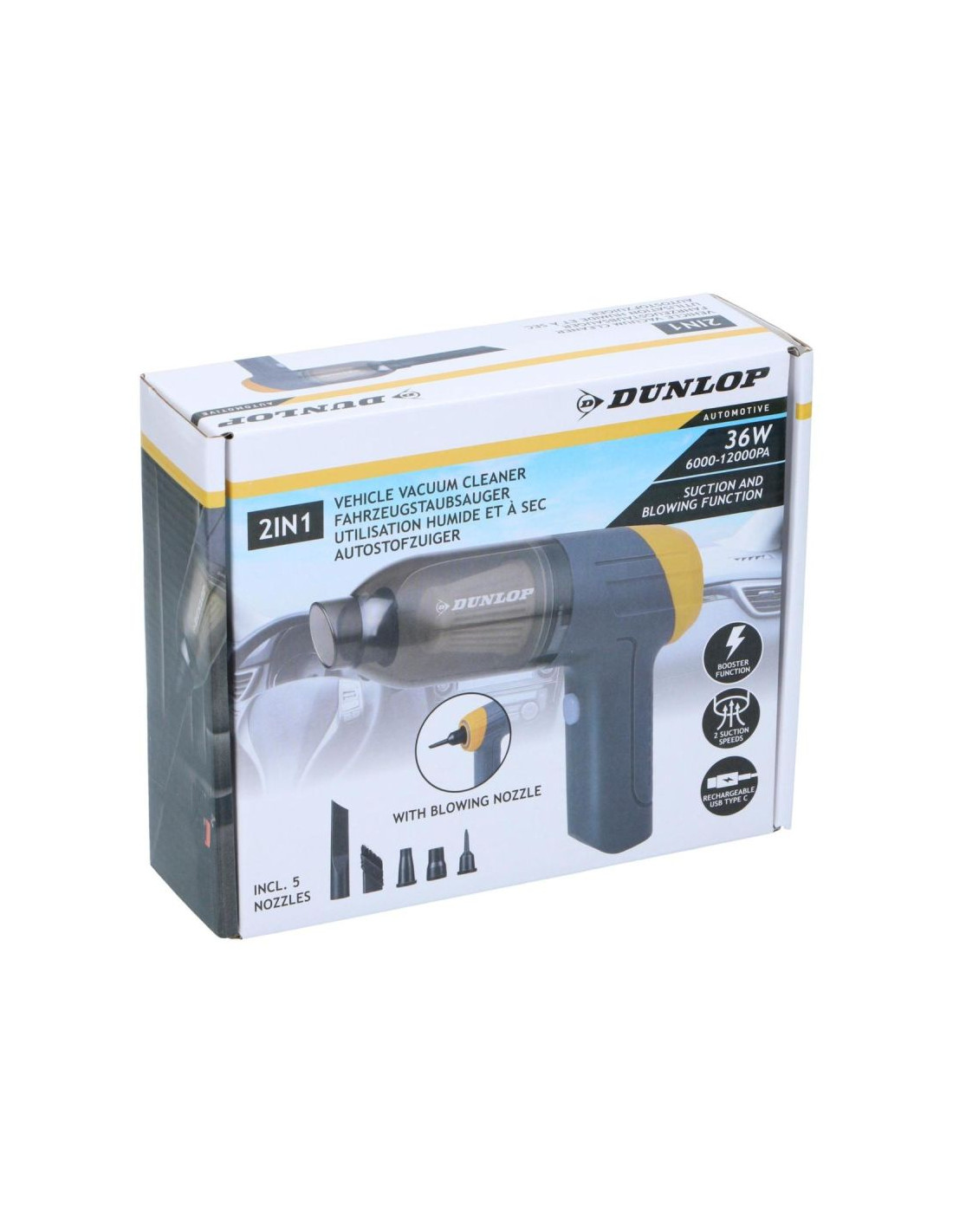 Z ODKURZACZEM SAMOCHODOWYM Z FUNKCJĄ DMUCHANIA 36W DUNLOP sprzątanie staje się szybkie, wygodne i skuteczne – bez kabli i bez wysiłku. Wsiadaj do czystego auta każdego dnia!