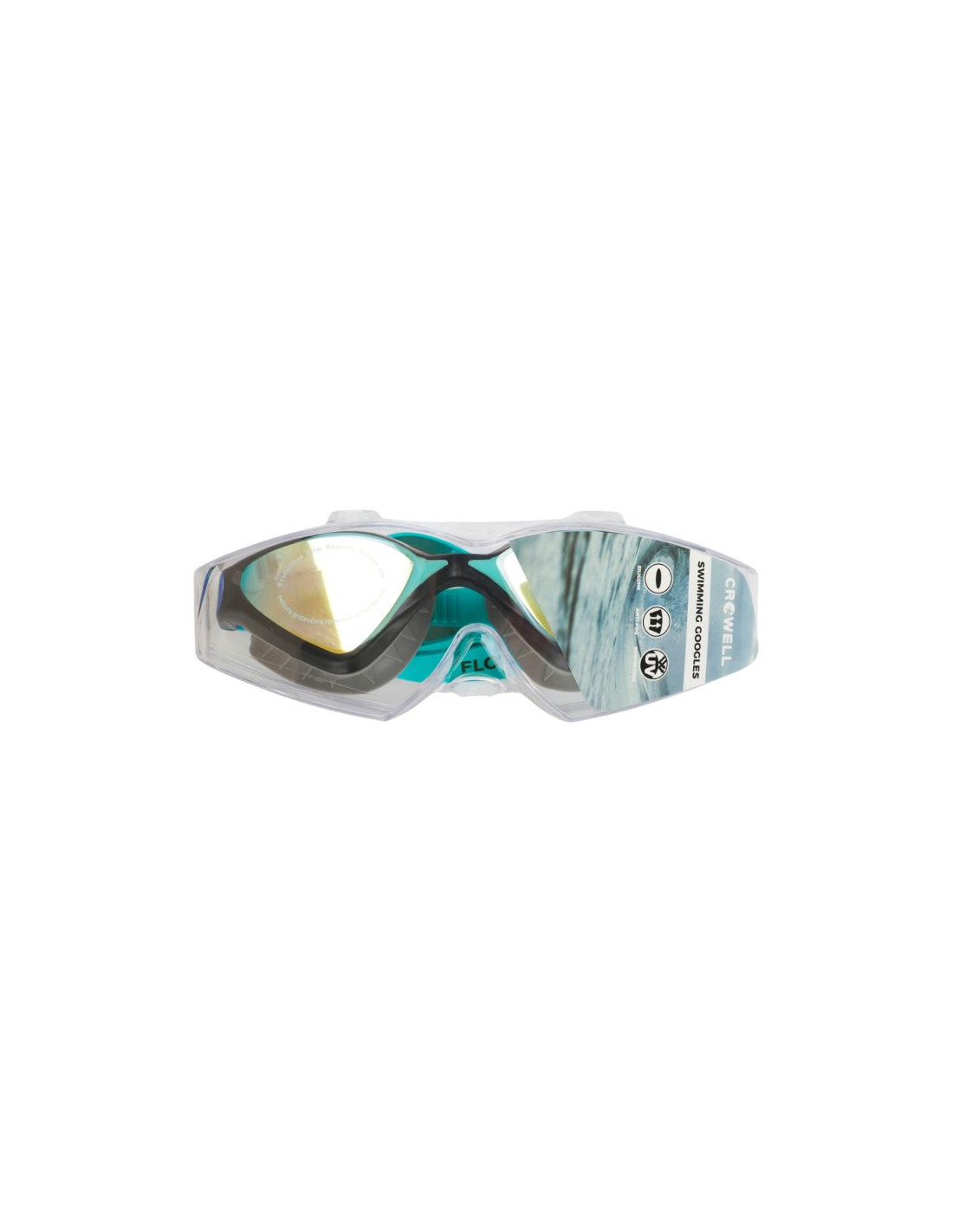 Okulary pływackie Crowell GS20 Flo Mirror szaro-zielone Okulary pływackie Crowell pozwolą chronić oczy przed działaniem chlorowanej wody podczas treningów na basenie. Model polecany dla dorosłych i młodzieży. Szkła wykonano z poliwęglanu wykazującego zwiększoną odporność na uszkodzenia i zarysowania. Lustrzana powłoka odbija refleksy. Powłoka Anti-Fog stanowiąca dodatkową warstwę soczewki zabezpiecza szkła przed parowaniem. Ergonomiczny kształt. Silikonowe, regulowane zapięcie. Wbudowany filtr UV. Do okularów dołączono plastikowe opakowanie. Materiał: poliwęglan PC, silikon