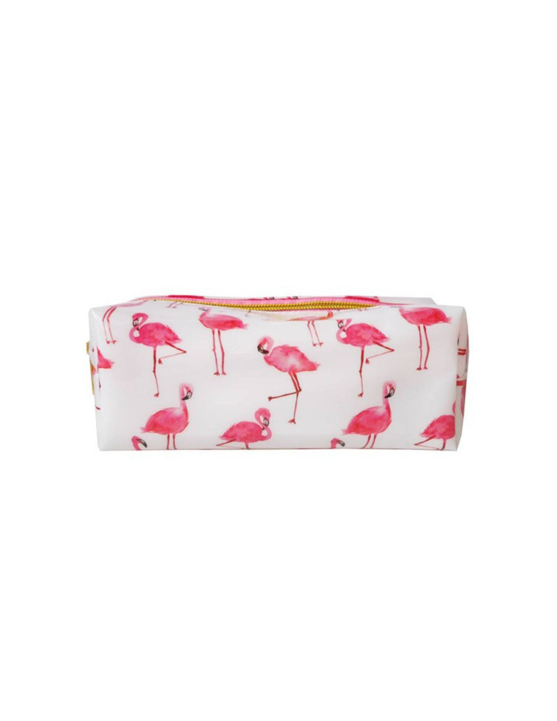 Piórnik szkolny w kolorzebiało-różowym z grafikami przedstawiającymi flamingi.