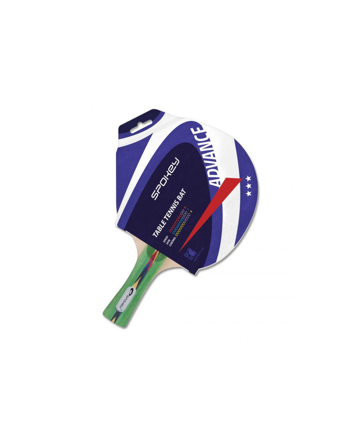 RAKIETKA DO PING PONGA SPOKEY ADVANCE 81914 Rakietka do tenisa stołowego Spokey Advance jest kierowana dla graczy średniozaawansowanych. Dane techniczne:·Ilość warstw: 7 ·Rączka: taliowana/ anatomiczna ·Grubość gąbki: 2,0 mm ·Szybkość (1/10): 8 ·Rotacja (1/10): 7 ·Kontrola (1/10): 6 ·Gwiazdki: ***