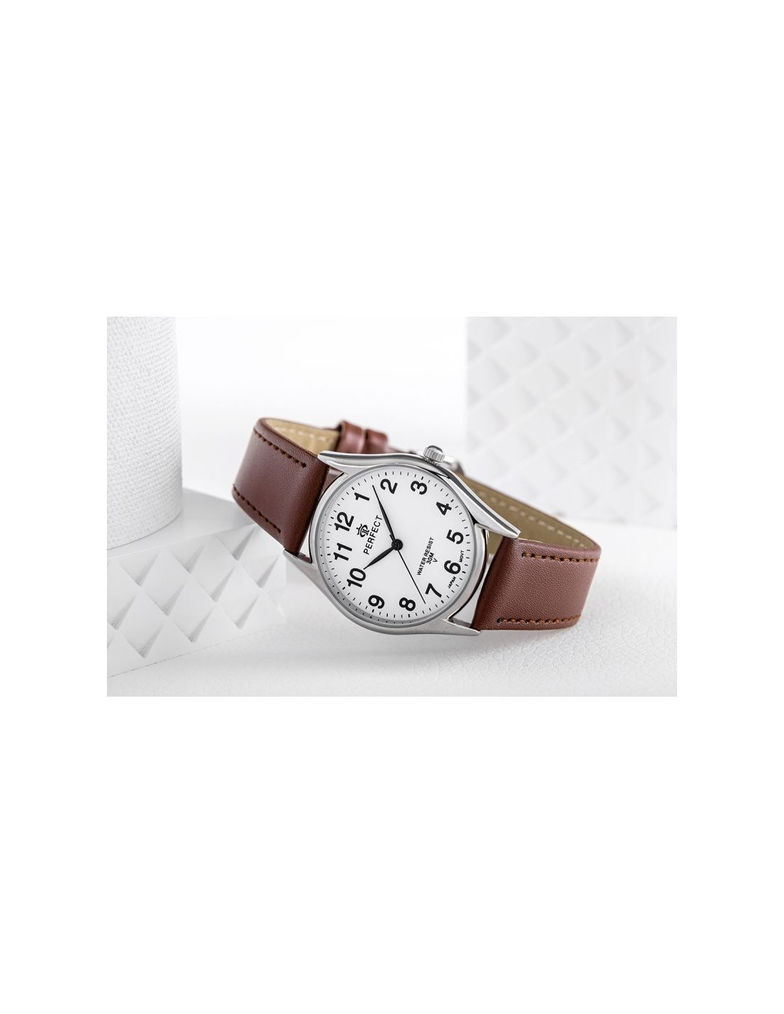 Zegarek Perfect jest odporny na przypadkowe zachlapania i kontakt z wodą, ale nie jest przeznaczony do zanurzenia się w wodzie, np. podczas pływania. Zegarek jest wystarczająco odporny na codzienne sytuacje, takie jak mycie rąk, przypadkowe zachlapania podczas deszczu czy kontakt z wodą podczas mycia naczyń. Zegarki Perfect są zaprojektowane tak, aby wytrzymały różne warunki atmosferyczne, co zwiększa ich trwałość i żywotność.