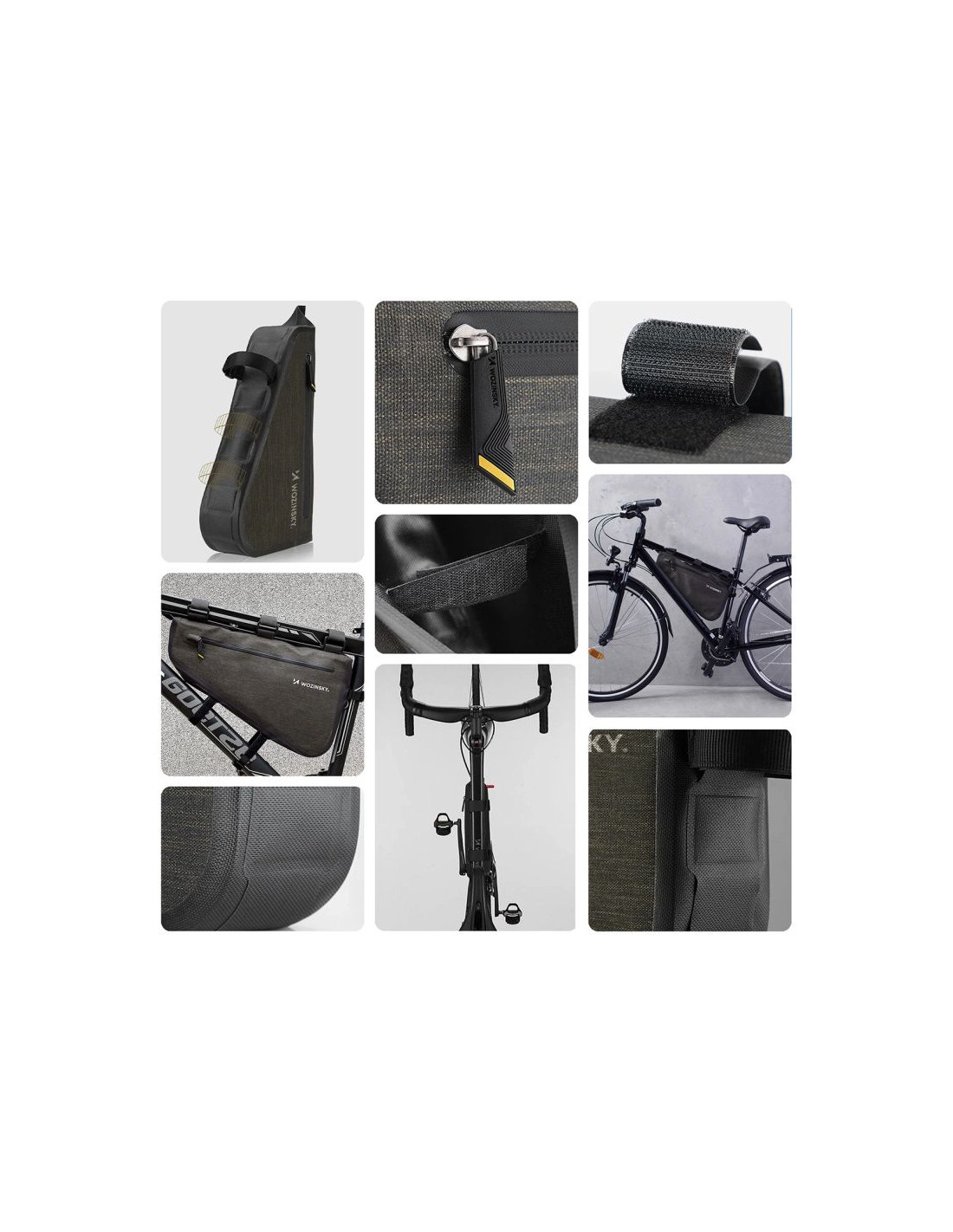 Torbę na rower Wozinsky WBB15BK montuje się bezpośrednio pod ramą za pomocą pięciu mocnych rzepów: trzech górnych i dwóch bocznych. Rzepy zostały przyszyte do długich pasków, dzięki czemu sakwa będzie pasowała do wielu średnic ram rowerowych. Taki sposób montażu gwarantuje stabilność podczas jazdy.