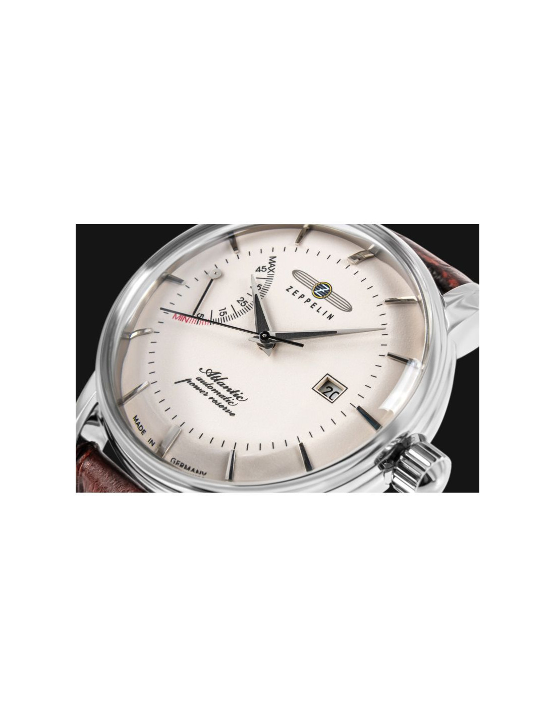 Na tarczy zegarka ZEPPELIN Atlantic Automatic Power Reserve 8462-3 umieszczono kilka praktycznych funkcji, które łączą klasykę z użytecznością. Centralne wskazówki godzinowa, minutowa i sekundnik odpowiadają za tradycyjny, analogowy odczyt czasu. Przy godzinie dziewiątej znajduje się wskaźnik rezerwy chodu, pokazujący ile energii pozostało w mechanizmie, co pozwala kontrolować jego działanie i ewentualnie ręcznie dokręcić zegarek. Przy godzinie trzeciej wkomponowano datownik w formie małego okienka, wskazującego aktualny dzień miesiąca. Całość uzupełniają elementy fluorescencyjne na wskazówkach, dzięki którym czas można odczytać również w ciemności.