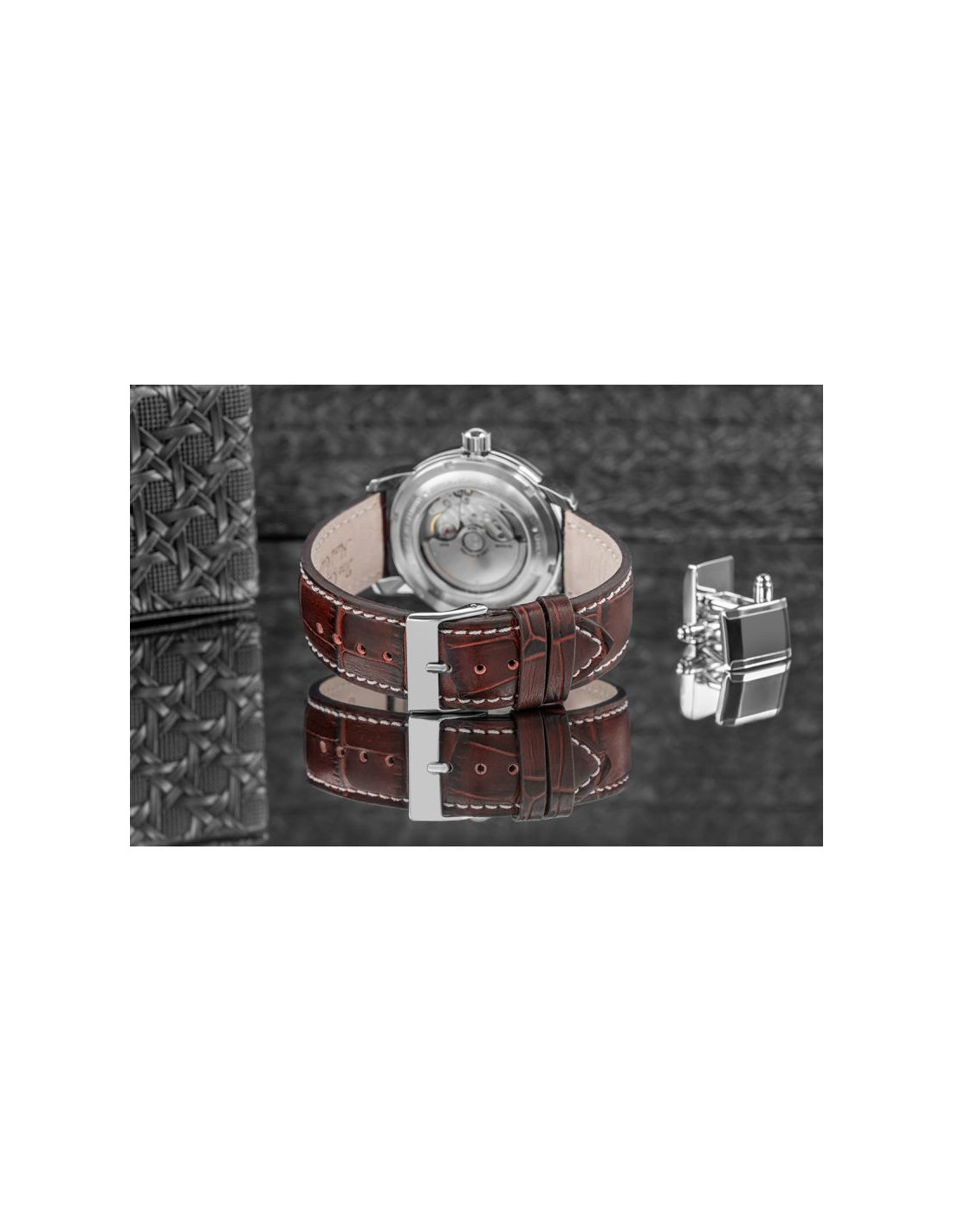 Przezroczysty dekiel, który odsłania precyzyjnie wykonany automatyczny mechanizm, to subtelny detal, który w pełni podkreśla prestiżowy charakter zegarka. Dzięki temu wyjątkowemu rozwiązaniu, możesz podziwiać mistrzowską pracę mechanizmu w każdej chwili, co nadaje zegarkowi jeszcze większego wyrafinowania. Takie rozwiązanie to ukłon w stronę tradycji zegarmistrzowskich, które opierają się na precyzji mechaniki i wysokiej jakości rzemiośle.