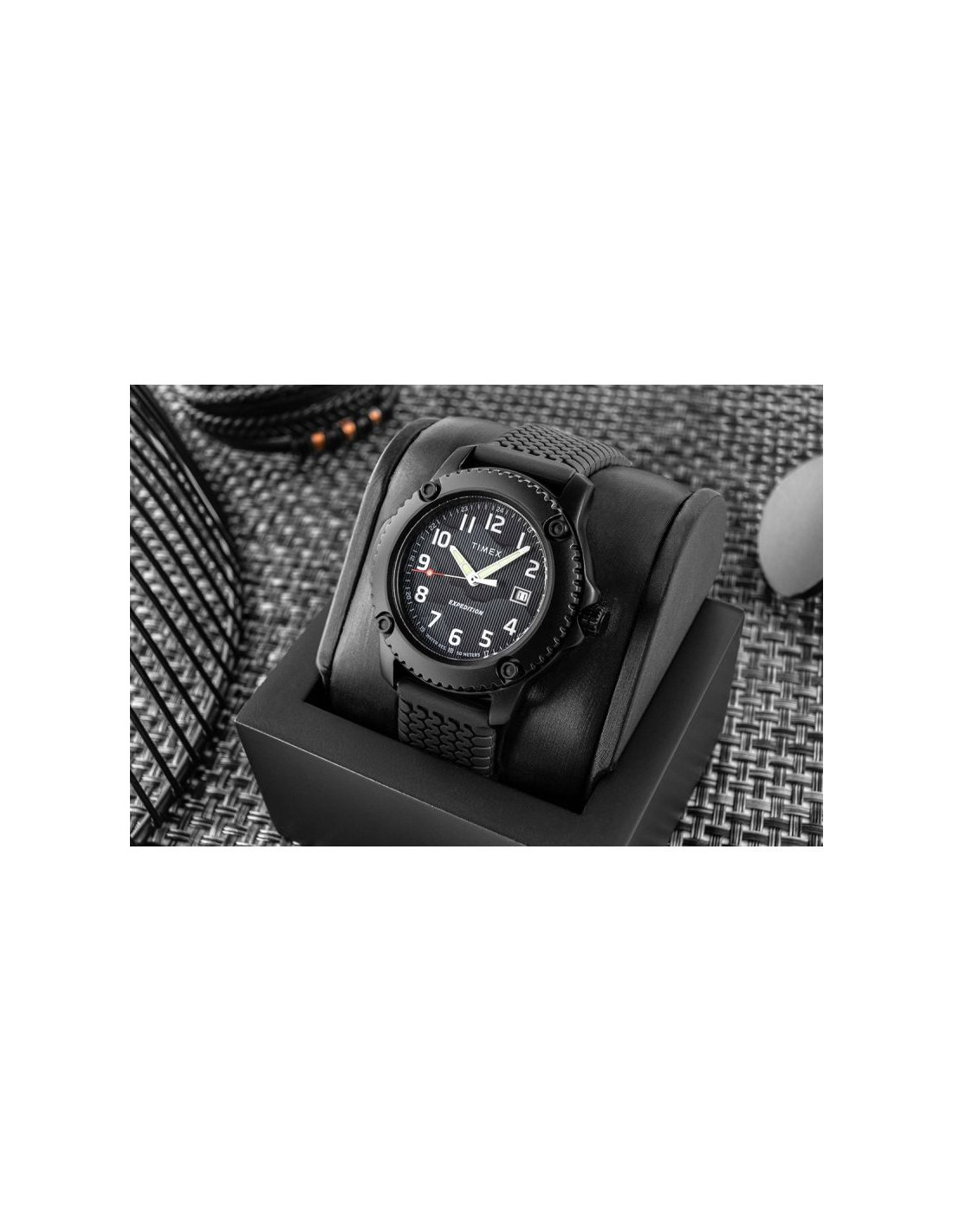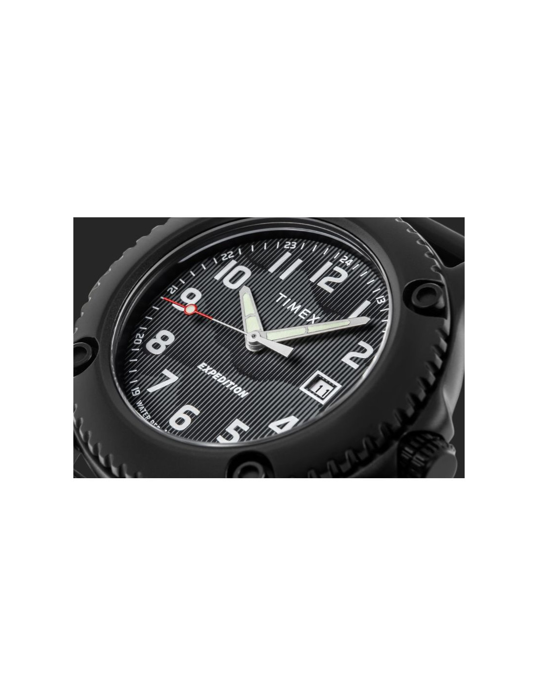 Tarcza tego modelu od razu przyciąga uwagę swoim technicznym, surowym charakterem, który idealnie wpisuje się w linię Expedition. Jej powierzchnia została wykończona w ciemnym odcieniu z pionową, subtelną fakturą, przypominającą precyzyjne, industrialne szczotkowanie – dzięki temu światło delikatnie się na niej rozprasza, dodając głębi i nowoczesności.
