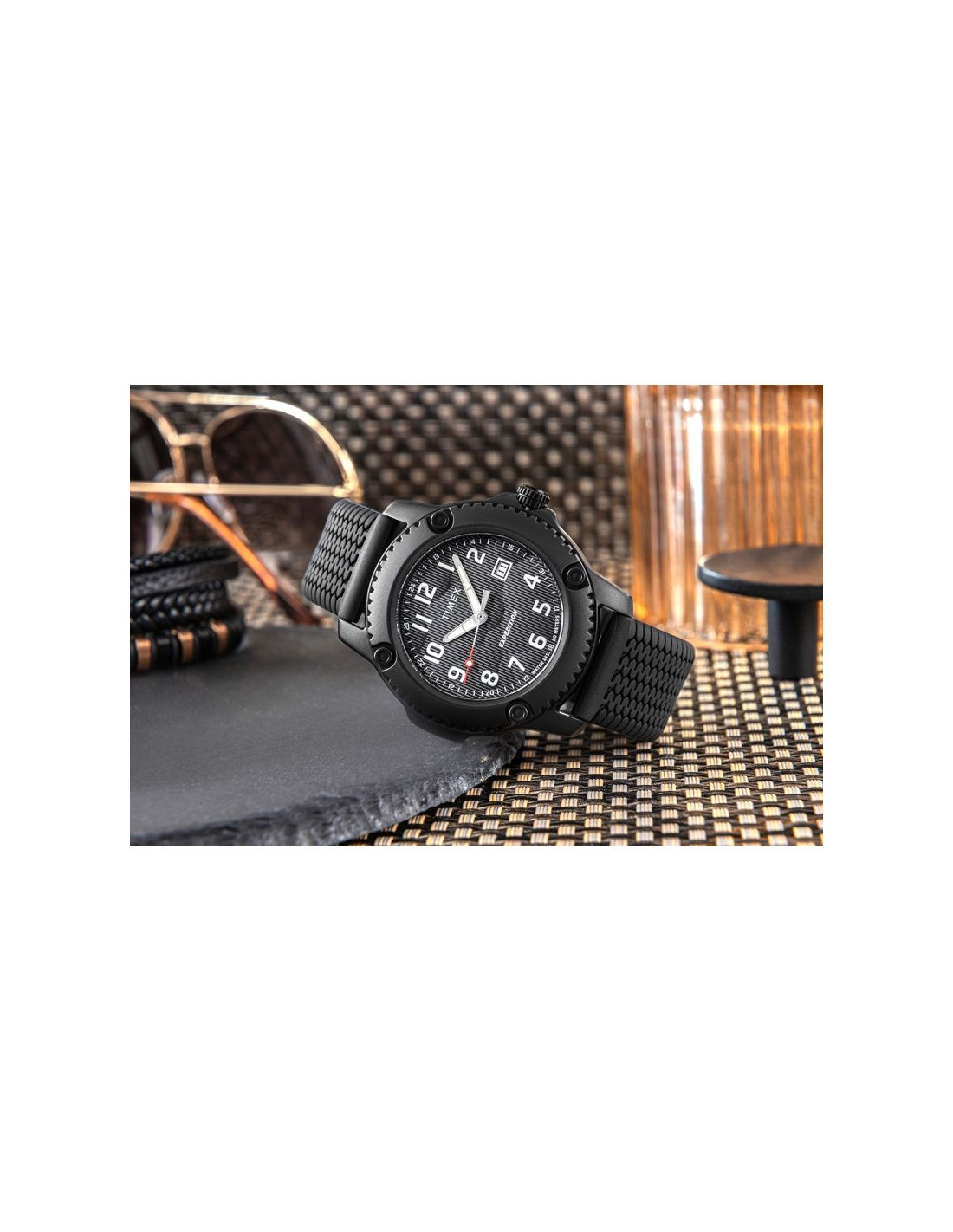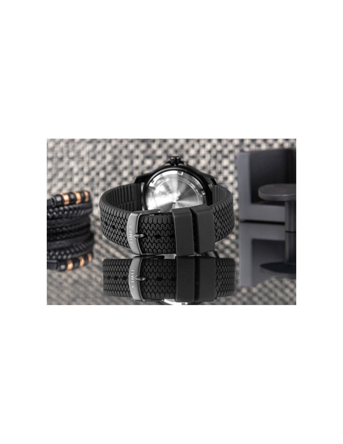 Całość dopełnia solidna klamra z logo TIMEX, która zapewnia pewne zapięcie i podkreśla spójność stylistyczną zegarka. To pasek, który łączy funkcjonalność, trwałość i sportowy design, doskonale współgrając z charakterem całego modelu.
