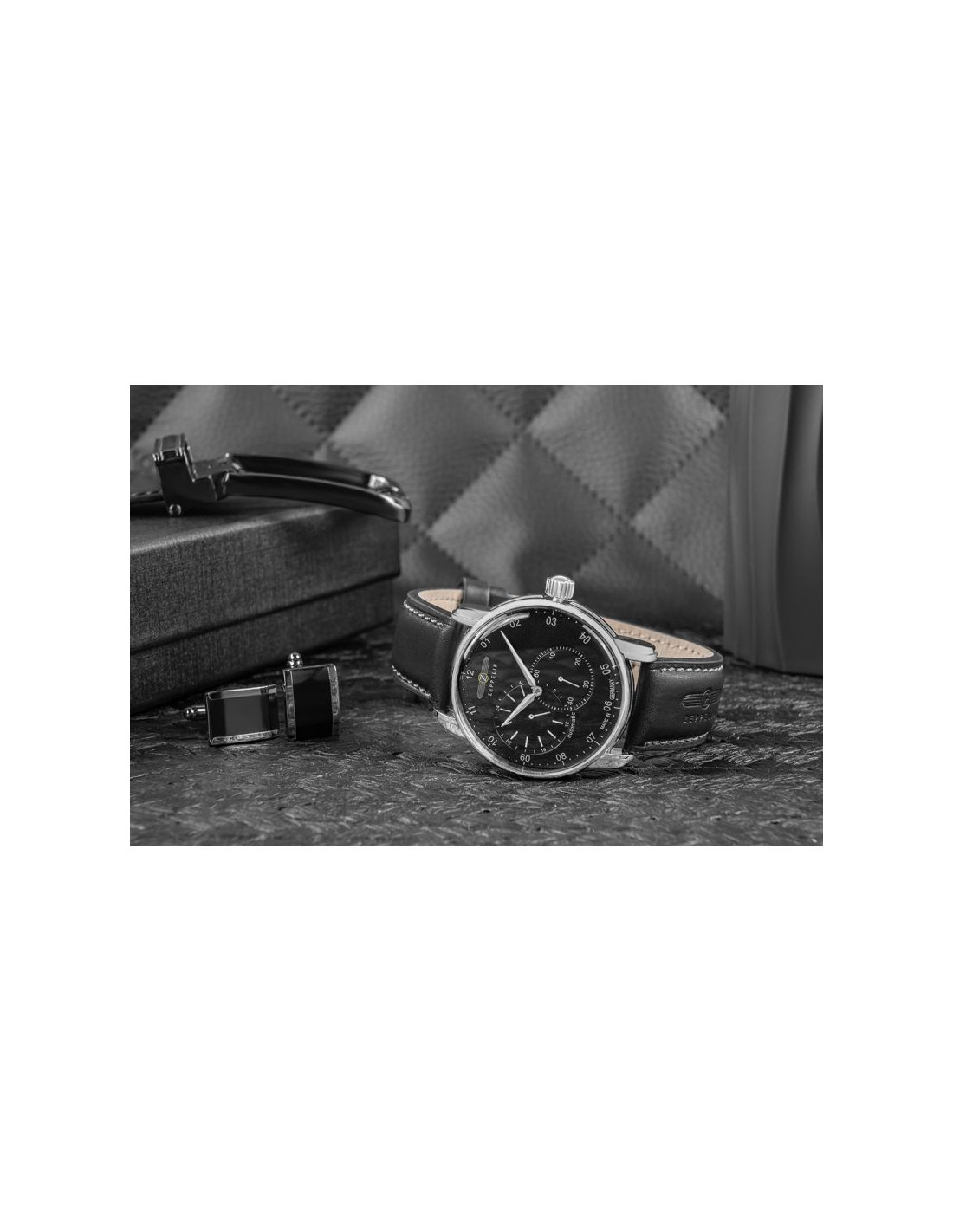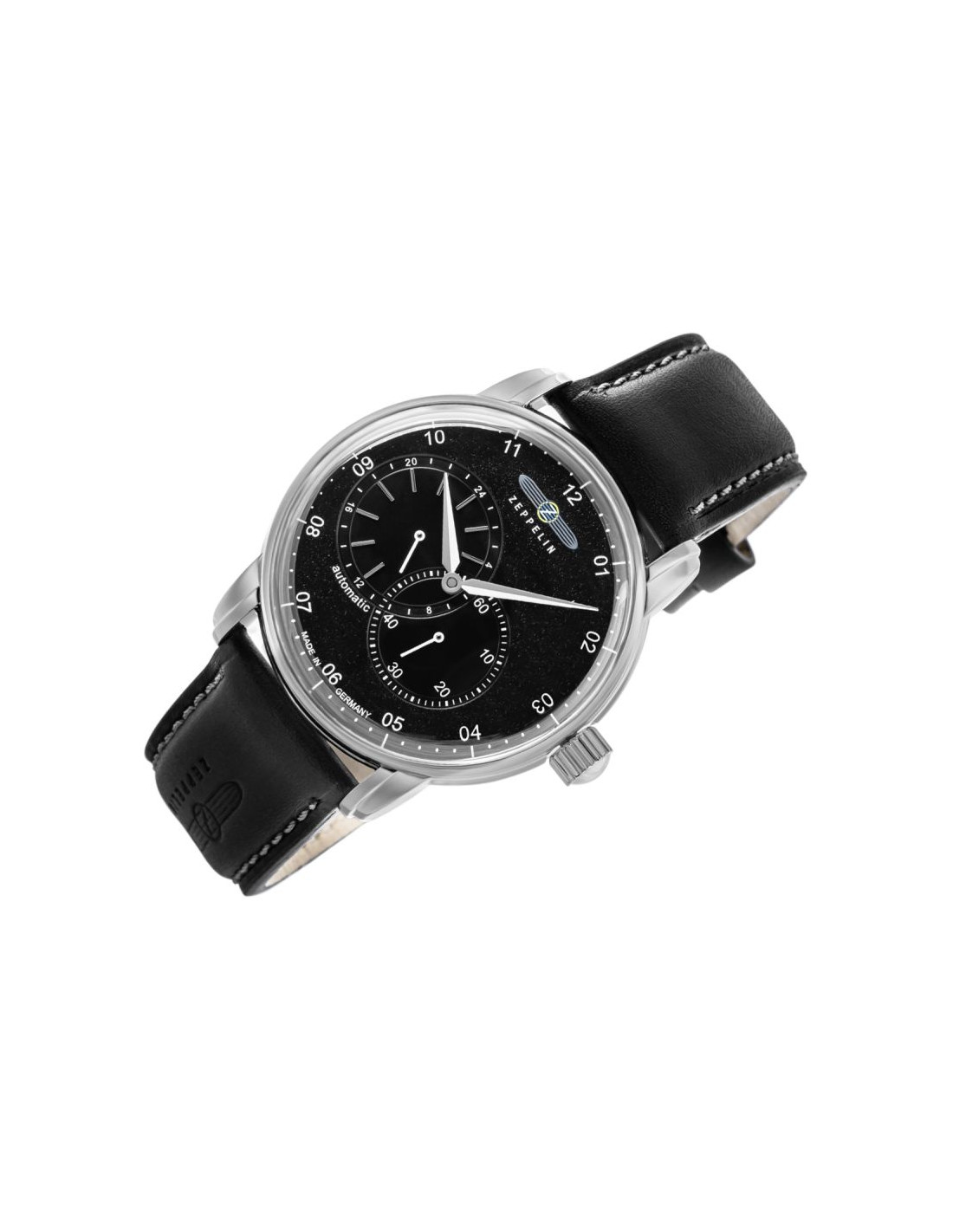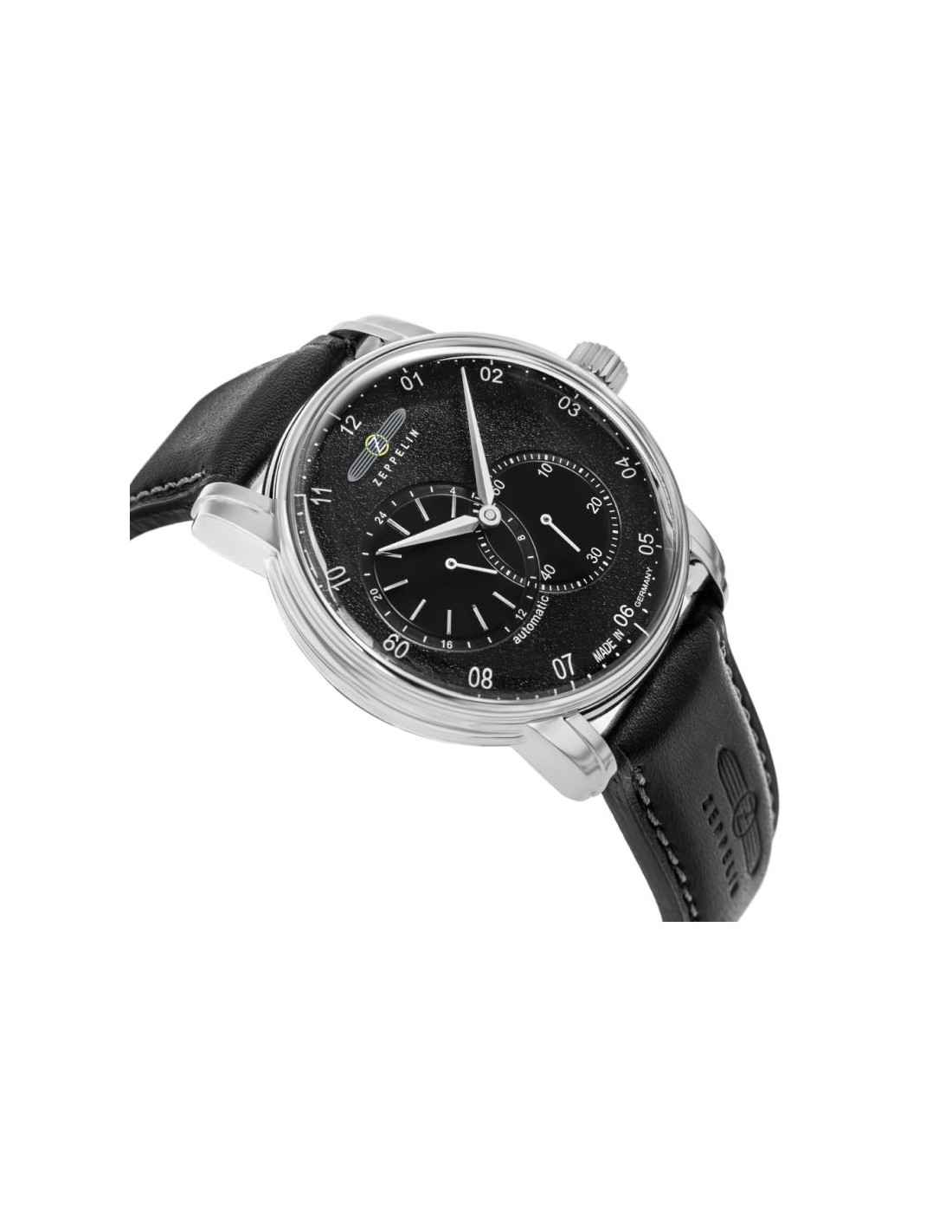 Jego elegancka, srebrna koperta idealnie komponuje się z głęboką czarna tarczą, przyciągając spojrzenia subtelnymi refleksami światła. białe indeksy i wskazówki z biało srebrnymi akcentami dodają mu ponadczasowej klasy i zapewniają wyjątkową czytelność. Pasek wykonany z wysokiej jakości skóry w czarnym odcieniu, zszyty jasną nicią, co dodaje mu subtelnego charakteru vintage. Na pasku znajduje się tłoczone logo Zeppelin oraz napis, które podkreślają luksusowy i autentyczny charakter zegarka. Każdy element, od solidnej srebrnej sprzączki po stylową koronkę, został dopracowany, by stworzyć spójną i wyjątkową kompozycję.