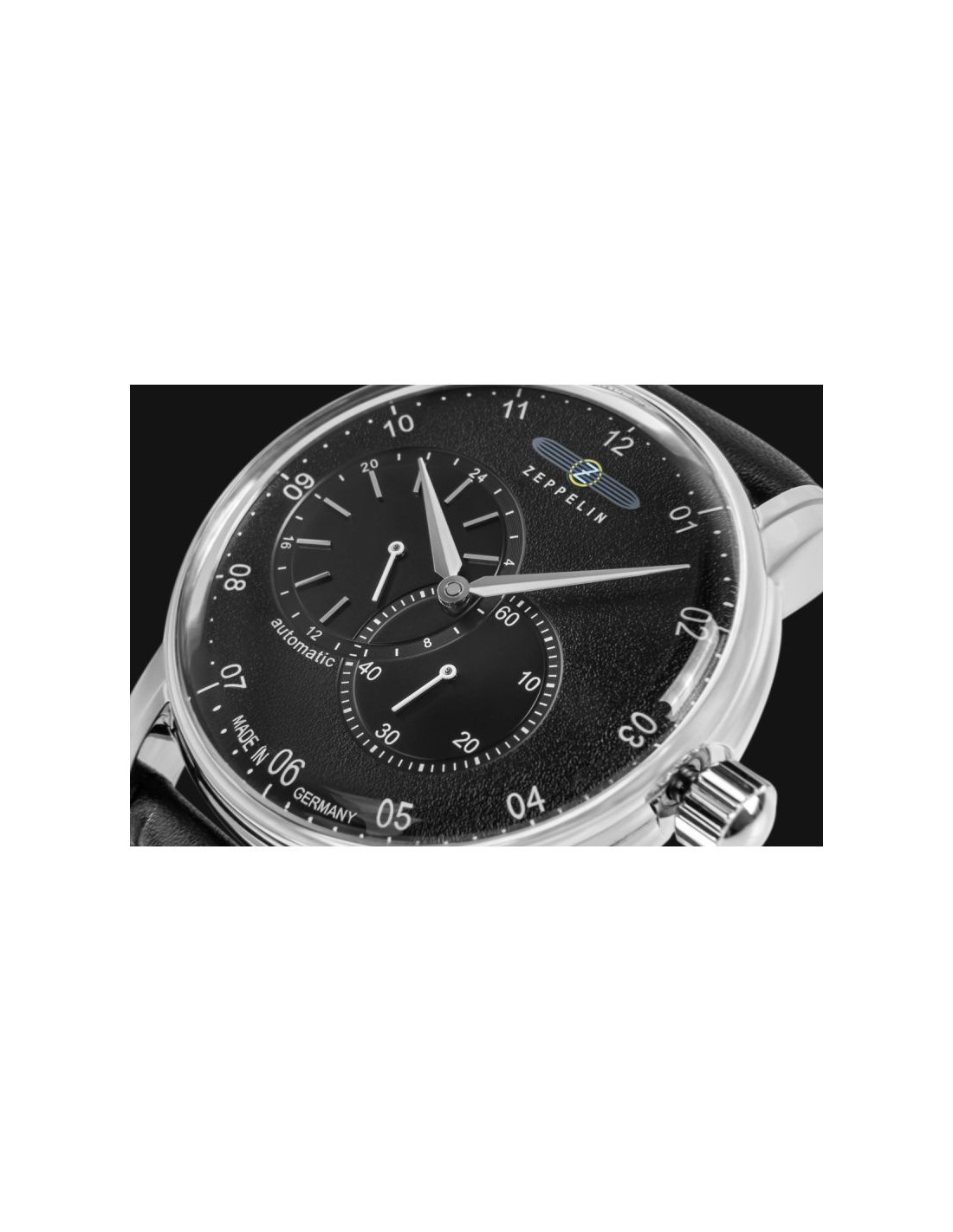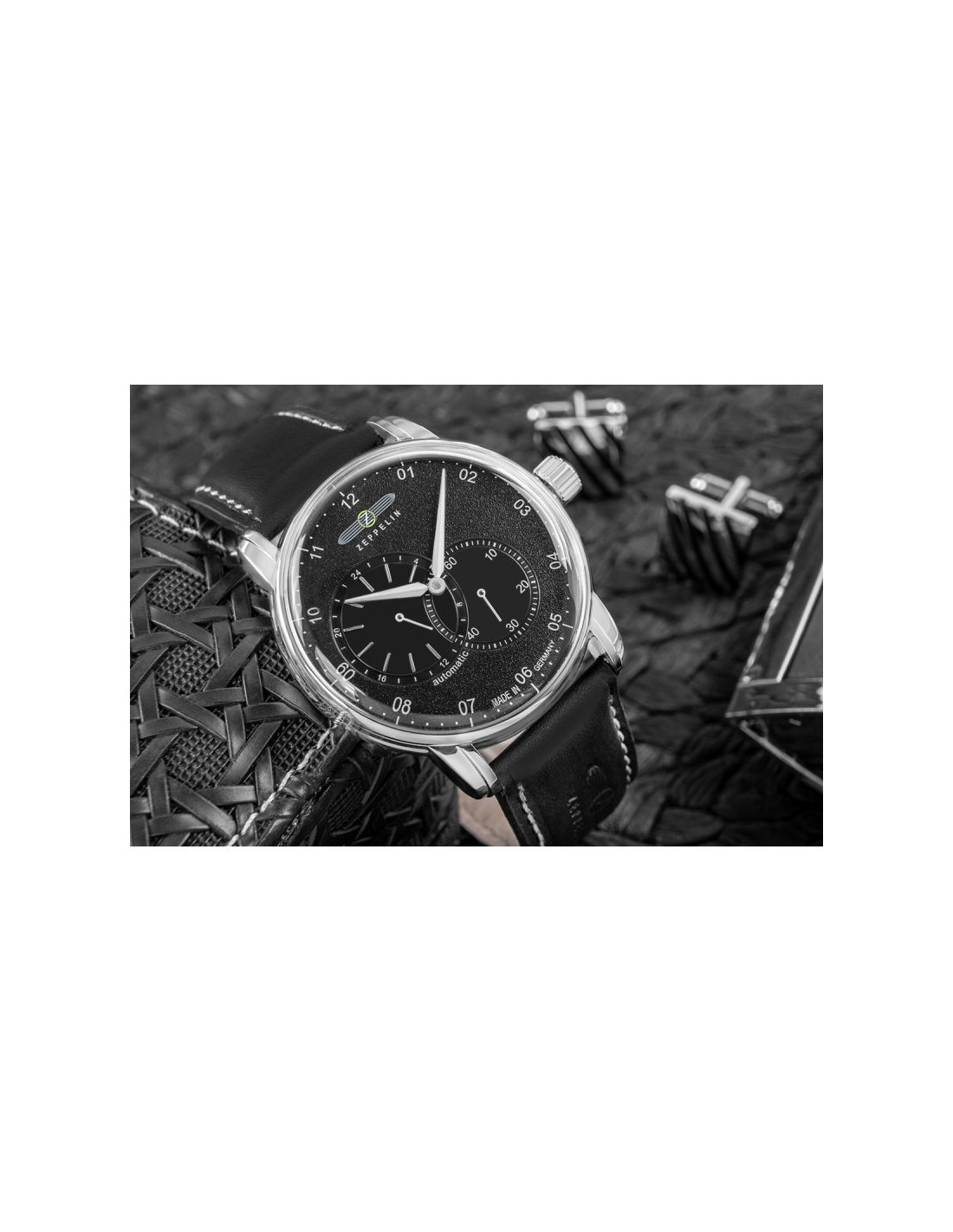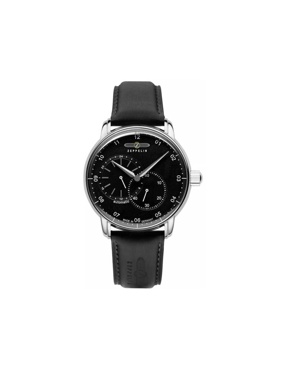 Jego elegancka, srebrna koperta idealnie komponuje się z głęboką czarna tarczą, przyciągając spojrzenia subtelnymi refleksami światła. białe indeksy i wskazówki z biało srebrnymi akcentami dodają mu ponadczasowej klasy i zapewniają wyjątkową czytelność. Pasek wykonany z wysokiej jakości skóry w czarnym odcieniu, zszyty jasną nicią, co dodaje mu subtelnego charakteru vintage. Na pasku znajduje się tłoczone logo Zeppelin oraz napis, które podkreślają luksusowy i autentyczny charakter zegarka. Każdy element, od solidnej srebrnej sprzączki po stylową koronkę, został dopracowany, by stworzyć spójną i wyjątkową kompozycję.