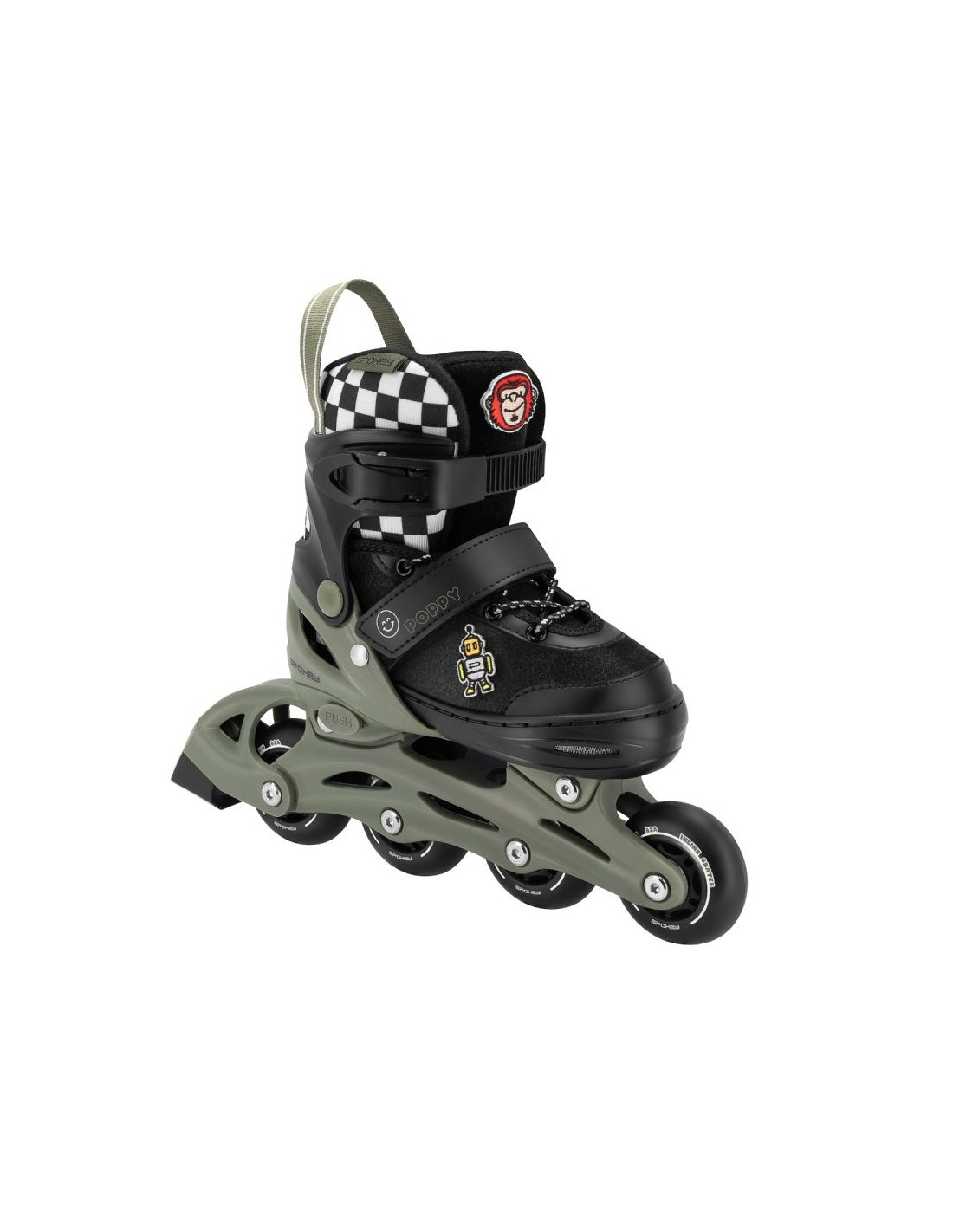 Dziecięce rolki regulowane. Półmiękki but zapewnia komfort podczas jazdy, a regulowany rozmiar pozwala dopasować rolki do rosnącej stopy, co wydłuża czas użytkowania. Kółka o twardości 82A dobrze sprawdzają się na asfaltowych nawierzchniach – zapewniają przyczepność i tłumią drgania. Łożyska ABEC-7 umożliwiają płynną i cichą jazdę. Potrójny system zapięcia (klamra, rzep, sznurowadła) stabilizuje stopę i zapobiega jej przesuwaniu w trakcie jazdy. Do zestawu dołączone są wymienne ozdoby na rzep, które pozwalają spersonalizować wygląd rolek. Tabela rozmiarów: Rozmiar Długość wkładki 27-30 16 - 18,5 cm 31-34 18,5 - 20,5 cm Parametry: But: semi-soft, regulowany Materiał buta: poliester, PP Materiał płozy: PP Materiał kółek: PU Twardość kółek: 82A Średnica kółek: 64 mm Łożyska: ABEC-7 Zapięcia: klamra dwusekcyjna, rzep, sznurowadła Rozmiar: 27-30 lub 31-34 Hamulec: TPR W zestawie: 8 naszywek na rzep – do personalizacji produktu Max. waga użytkownika: 60 kg Polecany do: jazda rekreacyjna Poziom zaawansowania: początkujący Informacje dotyczące bezpieczeństwa: Należy stosować środki ochrony indywidualnej. Nie nadaje się dla dzieci o masie ciała większej niż 60 kg. Do stosowania pod nadzorem osoby dorosłej. Nie używać w ruchu ulicznym. Nie do użytku komercyjnego.