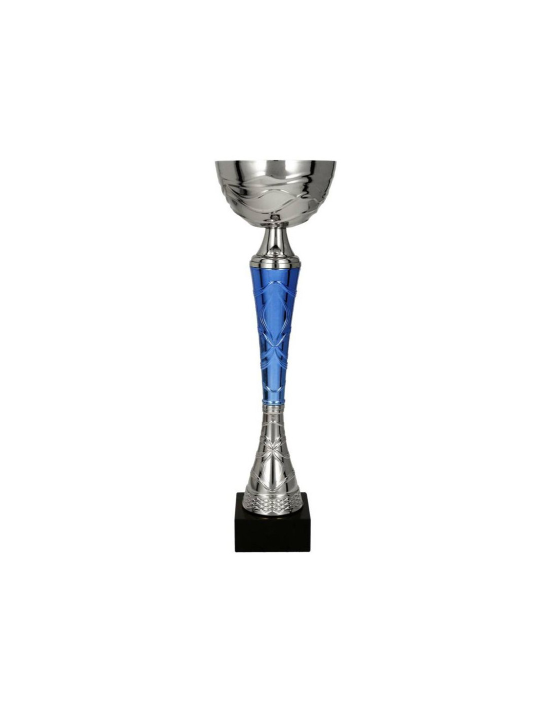 Klasyczny wzór pucharu utrzymany w kolorystyce srebrno-niebieskiej. Subtelności nadaje mu niewielki kielich z motywem fali oraz pięknie zdobiona wąska nóżka. Idealnie sprawdzi się jako trofeum wręczane podczas różnego rodzaju wydarzeń.