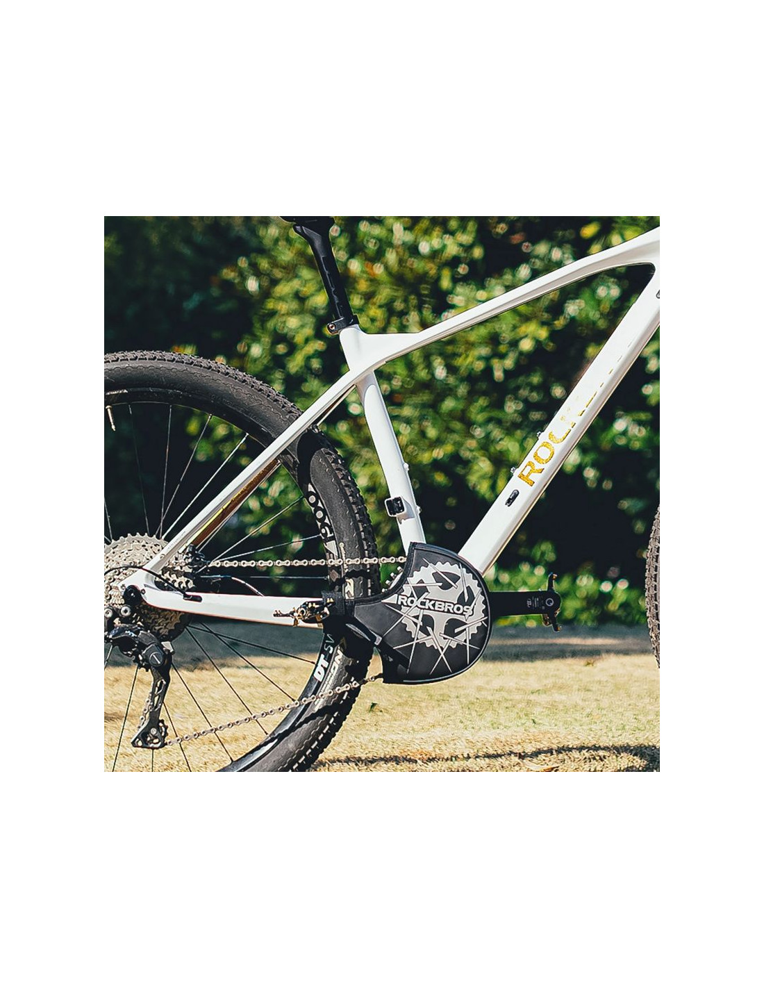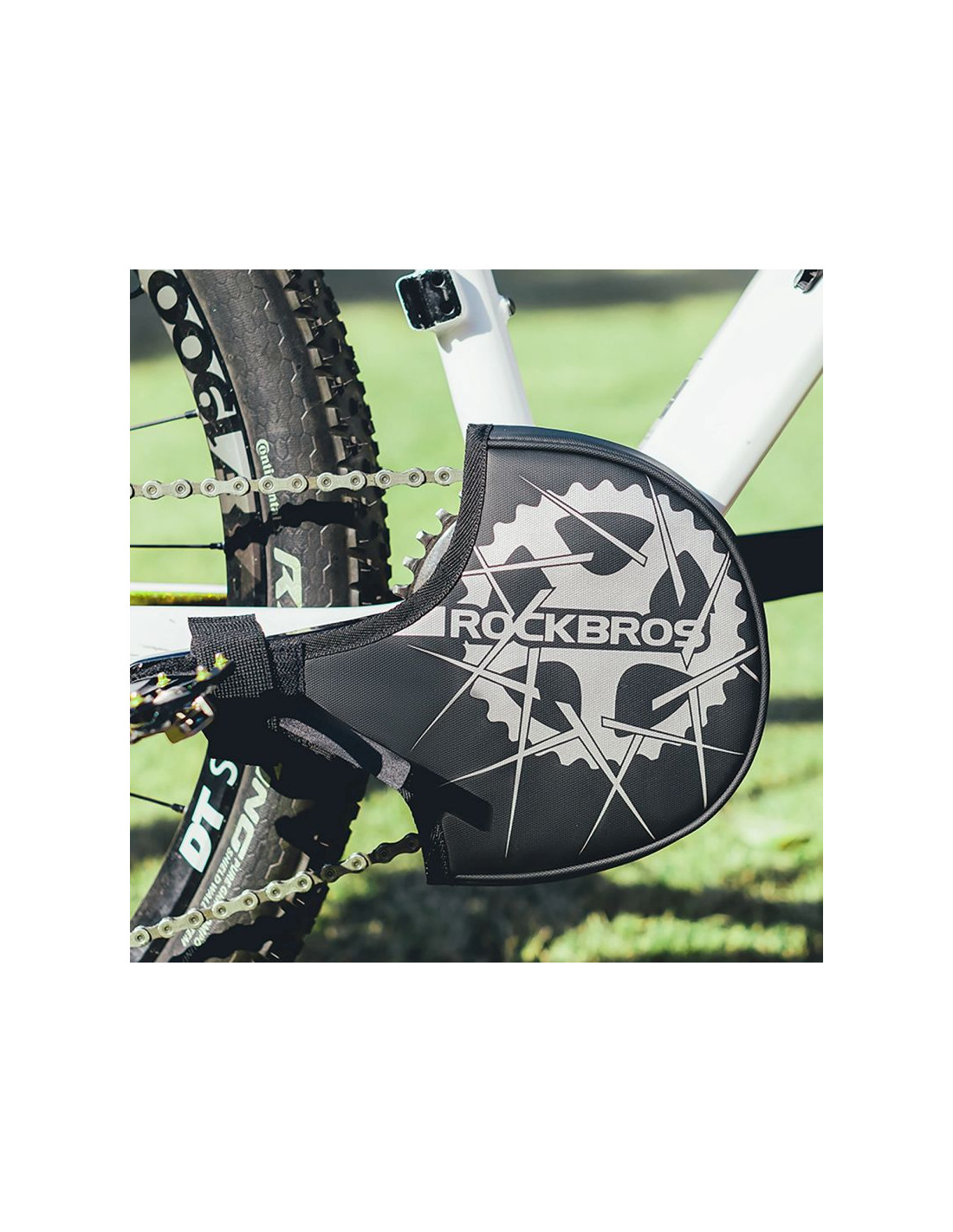 Osłona pomaga zabezpieczyć zębatkę i korbę przed zabrudzeniem oraz przypadkowymi uszkodzeniami podczas transportu roweru lub jego przechowywania.