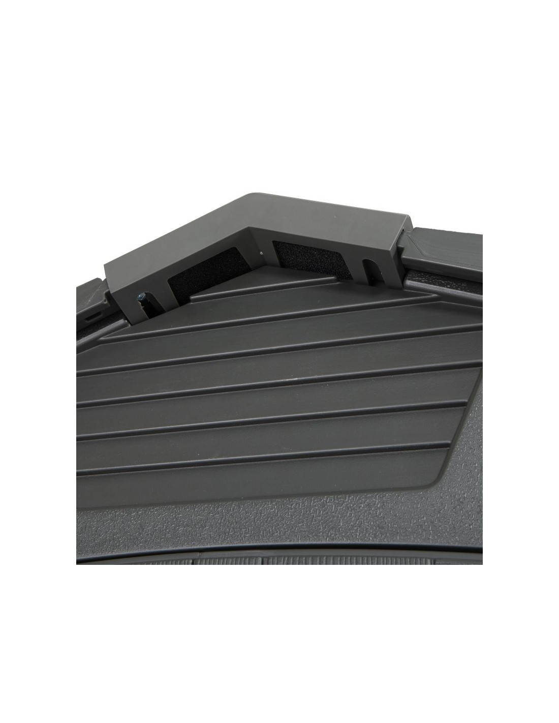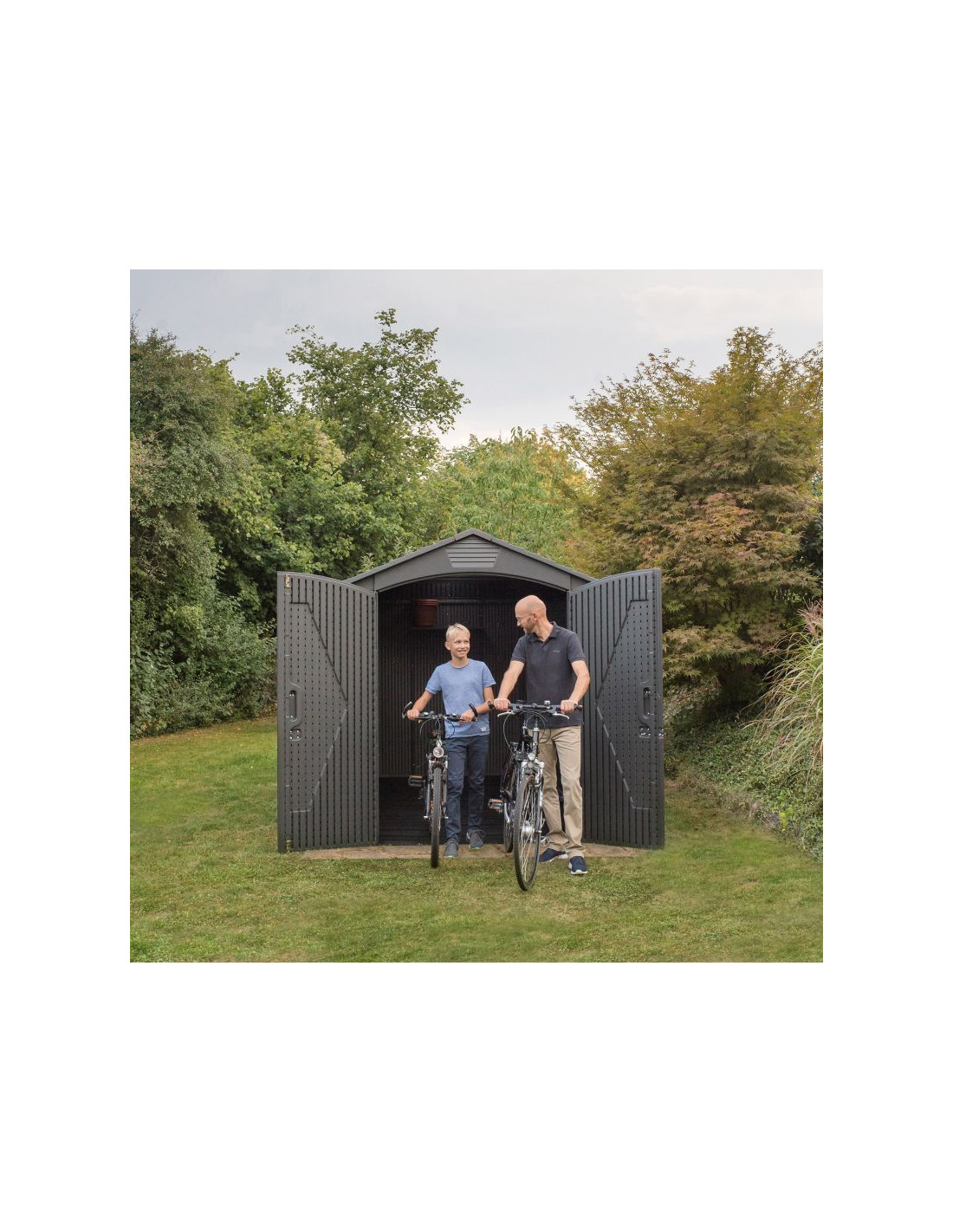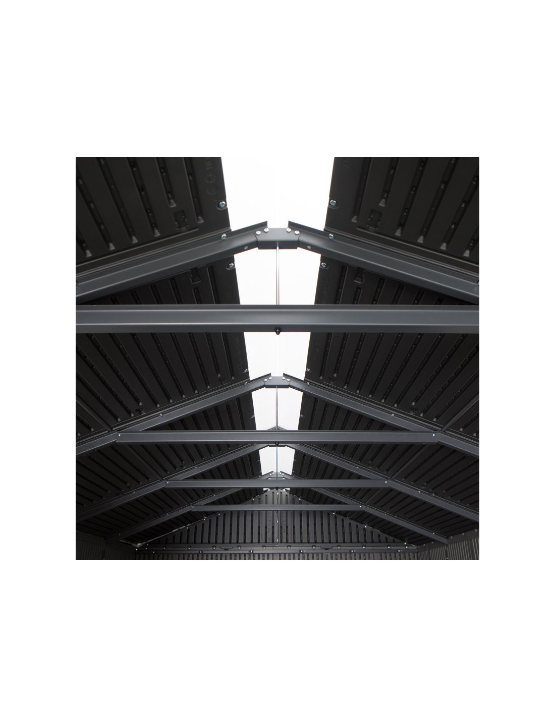Świetlik wykonany z wytrzymałego materiału, biegnący przez całą długość dachu, zapewnia maksimum naturalnego oświetlenia. Podwójne drzwi z zawiasami zamykane na zamek otwierają się do prawie do 180 stopni, dzięki czemu możemy wnieść do środka nawet duże sprzęty. Antypoślizgowa podłoga polietylenowa i łatwa w konserwacji konstrukcja wzmocniona stalą zapewniają komfort użytkowania na długie lata.