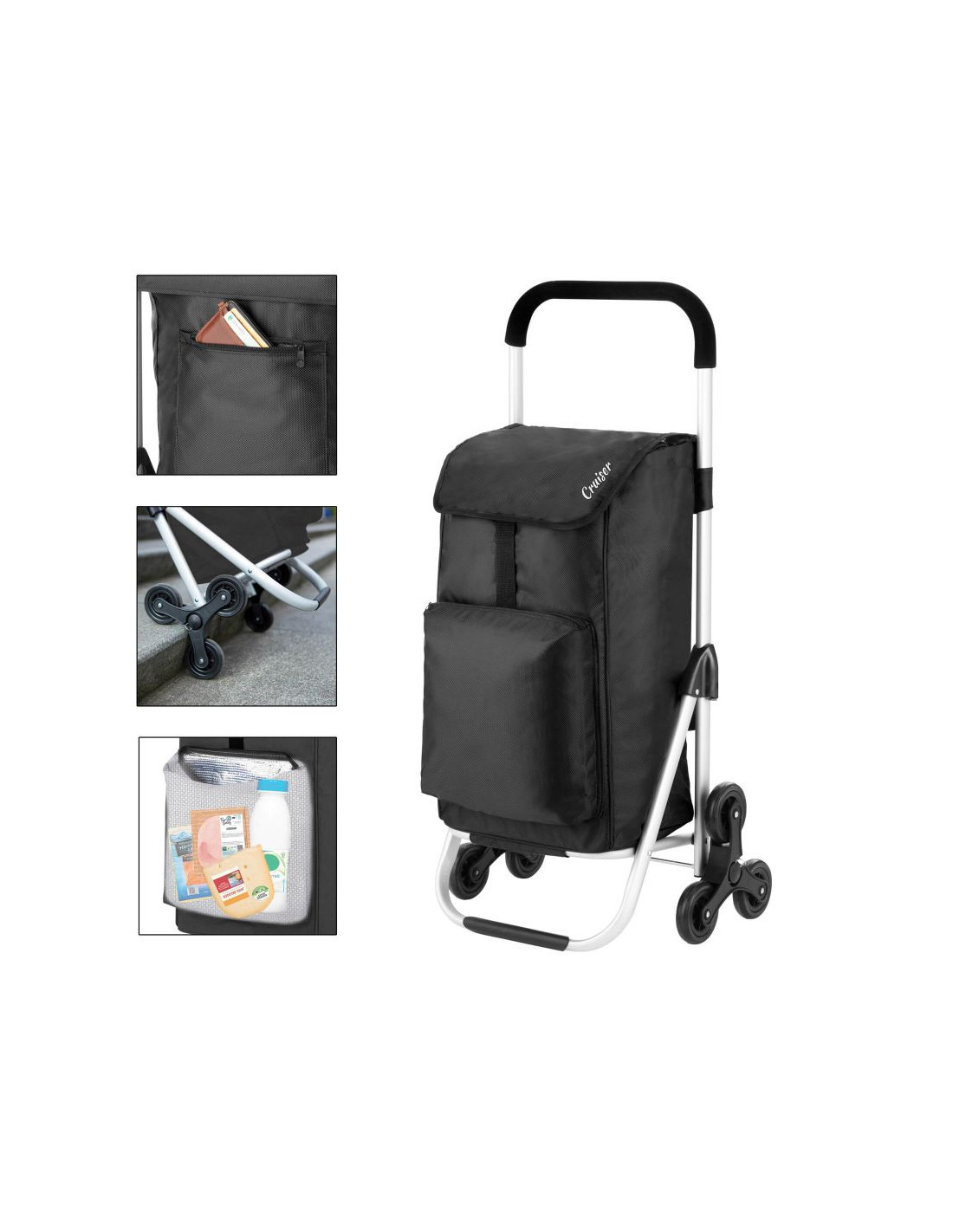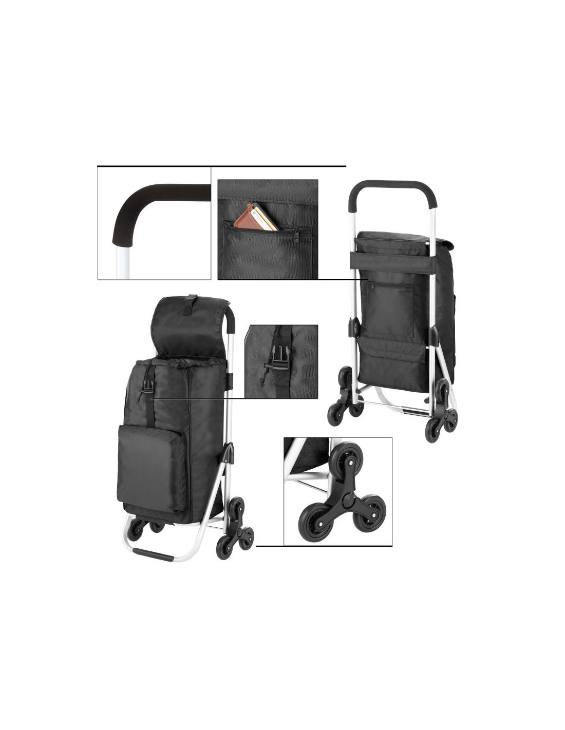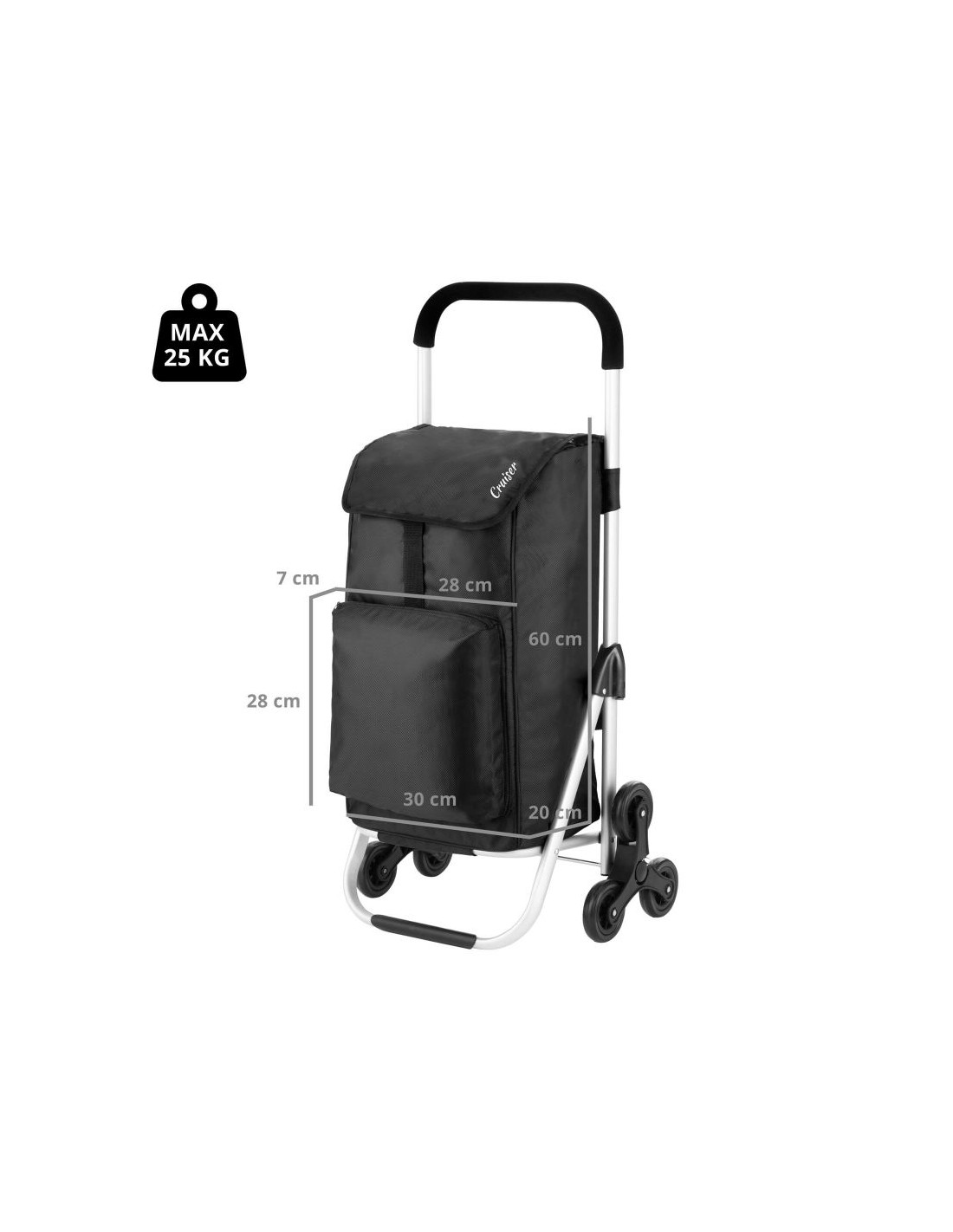 Praktyczny i pojemny wózek zakupowy z 6 kołami do łatwego poruszania się po schodach. Wózek posiada przestronną komorę główną o pojemności 30 litrów, ze sznurkiem i zamknięciem, przednią kieszeń termoizolacyjną (funkcja lodówki) i dodatkową kieszenią na suwak z tyłu. Usztywniane dno, wygodny uchwyt, górna klapa na klips, wodoodporny materiał wykonania to główne atuty wózka.