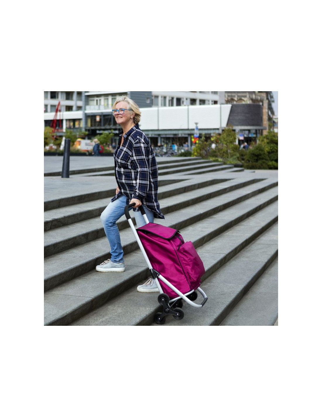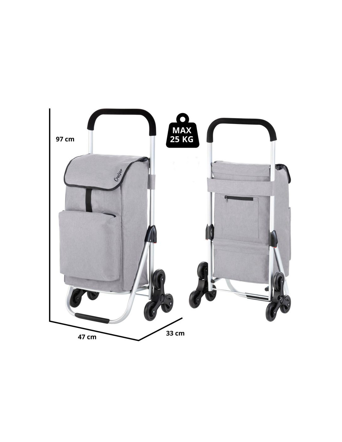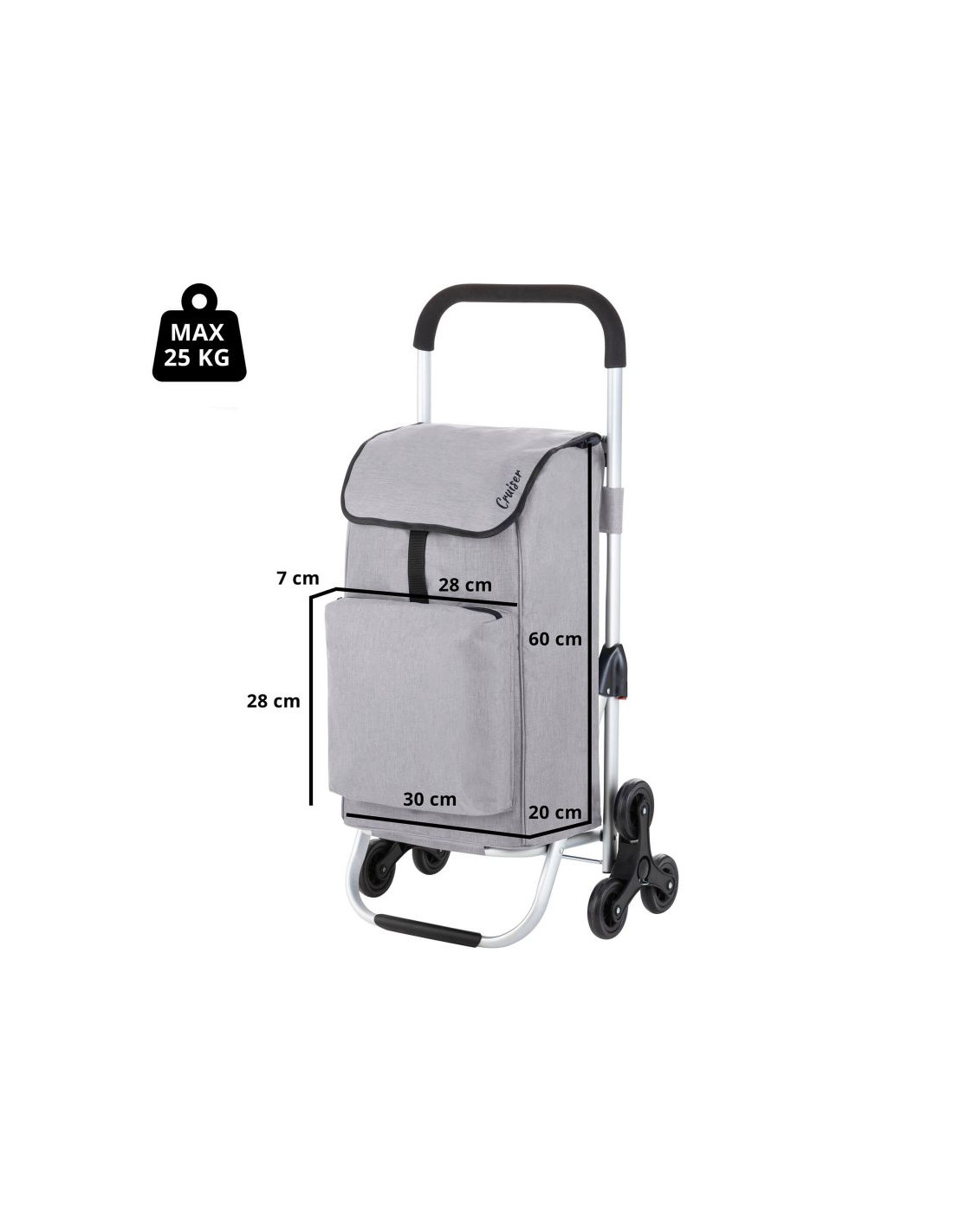 Praktyczny i pojemny wózek zakupowy z wygodnym, rozkładanym siedziskiem. Wózek posiada przestronną komorę główną o pojemności 40 litrów, ze sznurkiem i klapą oraz dodatkową kieszenią na suwak z tyłu. Usztywniane dno, wygodny uchwyt, wodoodporny materiał wykonania oraz wygodne szybko rozkładające się siedzisko to główne atuty wózka. Siedzisko jest idealne szczególnie dla osób starszych podczas codziennych zakupów, jak również podczas oczekiwania na autobus czy tramwaj.