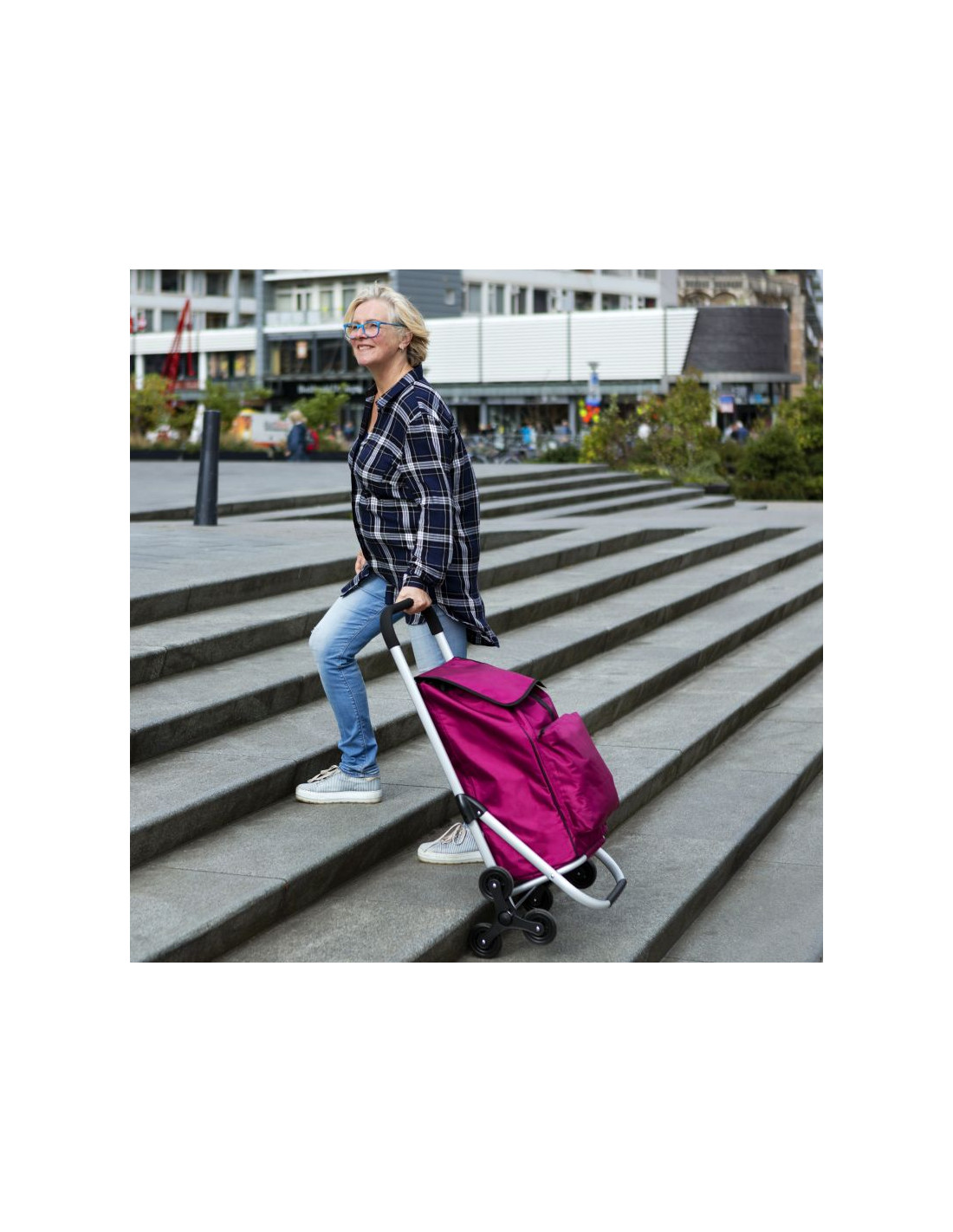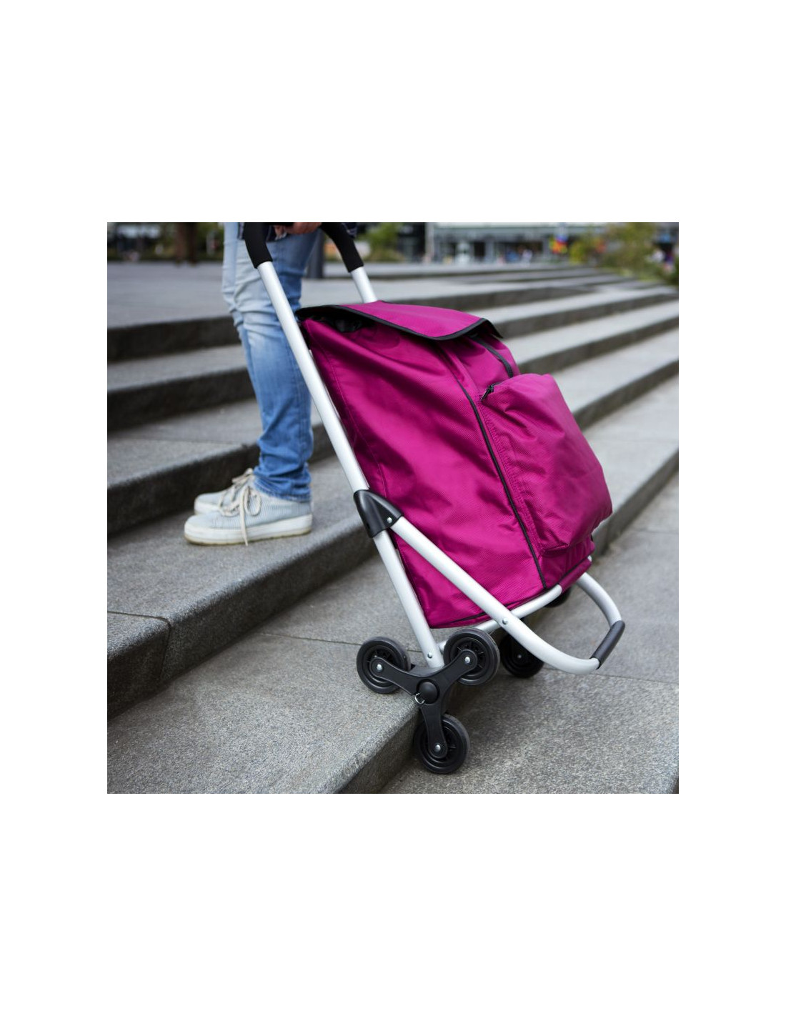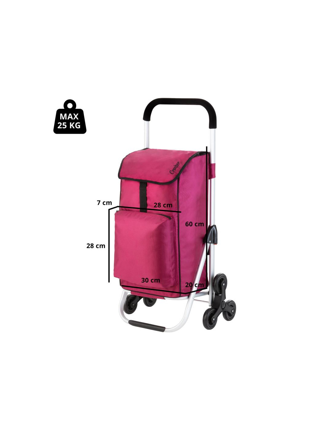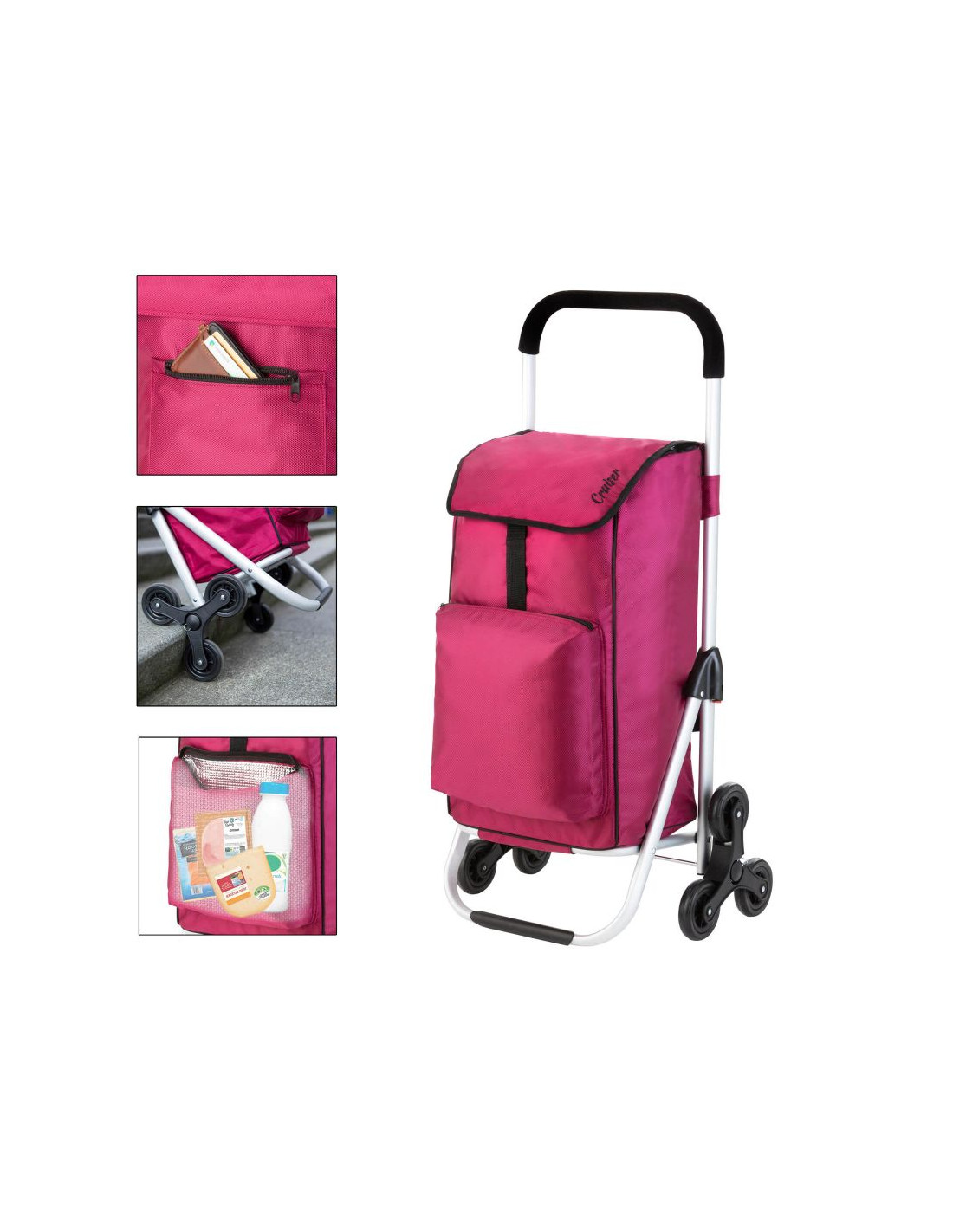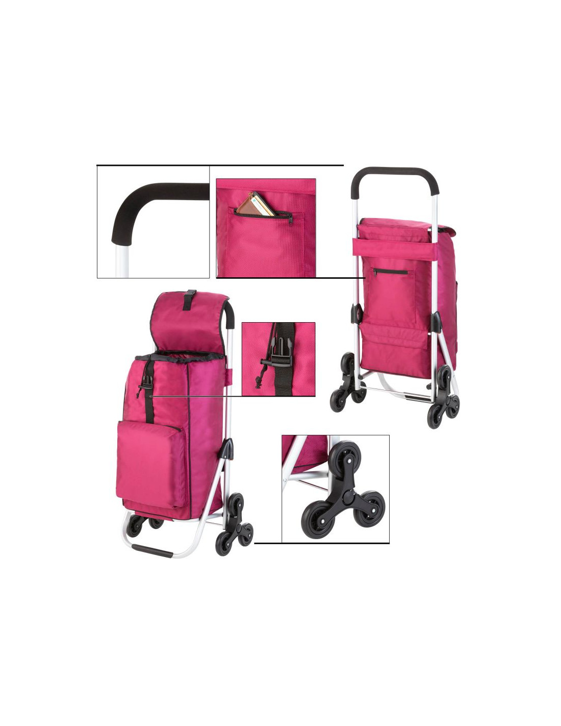 Praktyczny i pojemny wózek zakupowy z 6 kołami do łatwego poruszania się po schodach. Wózek posiada przestronną komorę główną o pojemności 30 litrów, ze sznurkiem i zamknięciem, przednią kieszeń termoizolacyjną (funkcja lodówki) i dodatkową kieszenią na suwak z tyłu. Usztywniane dno, wygodny uchwyt, górna klapa na klips, wodoodporny materiał wykonania to główne atuty wózka.