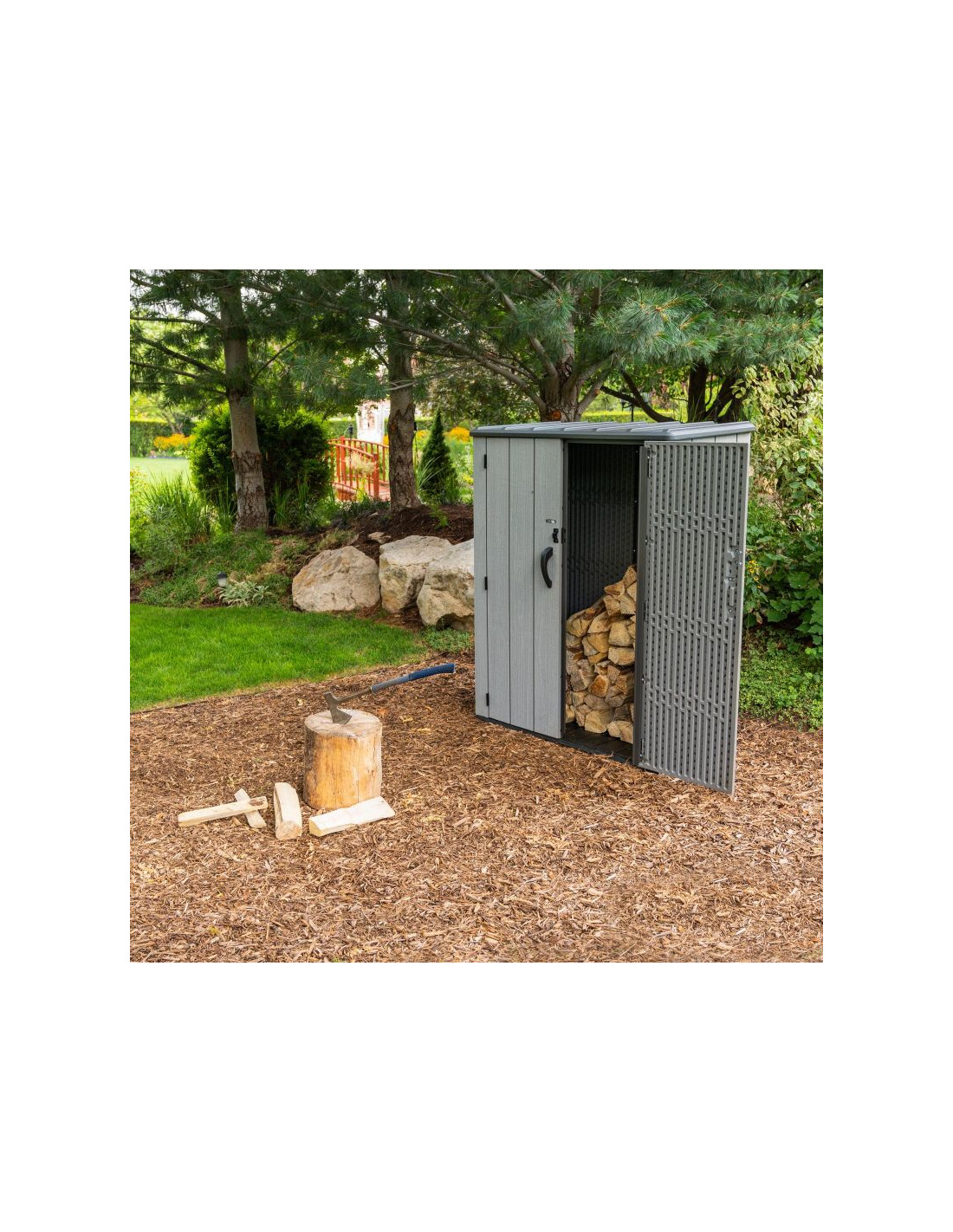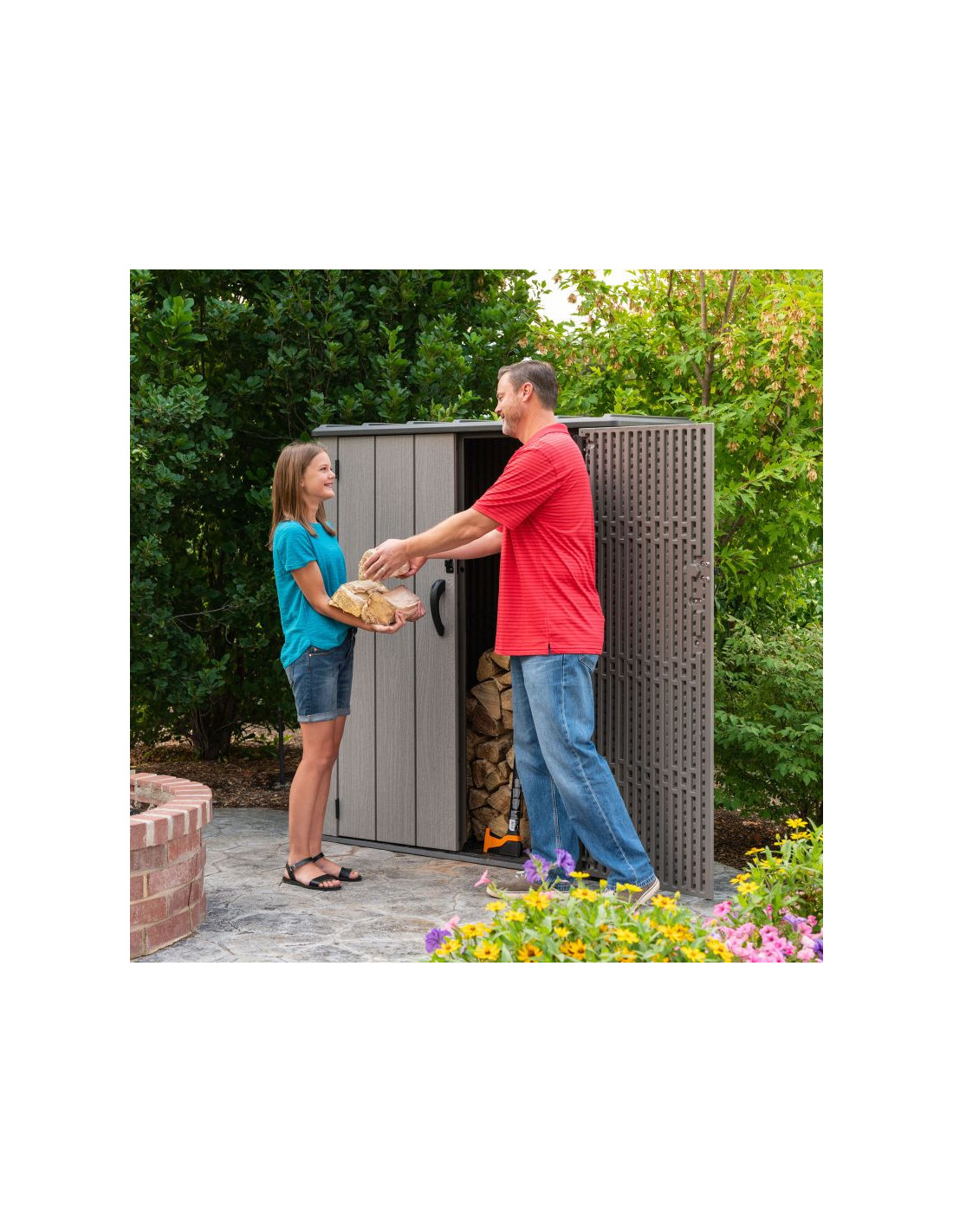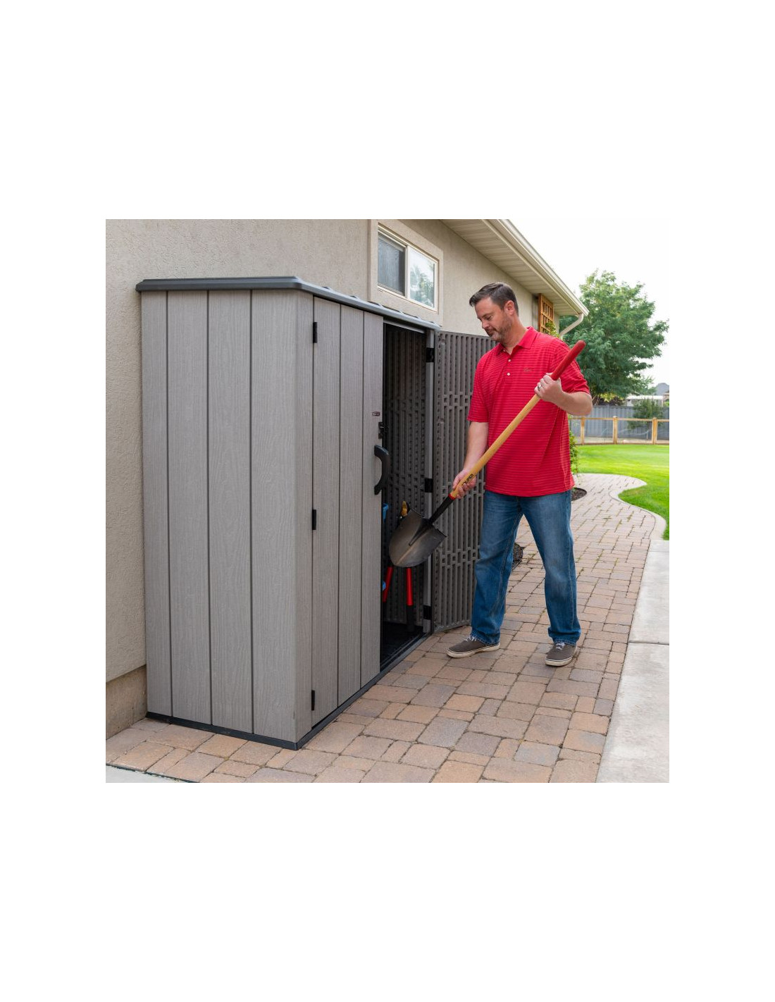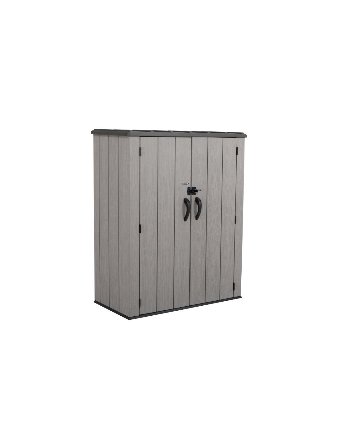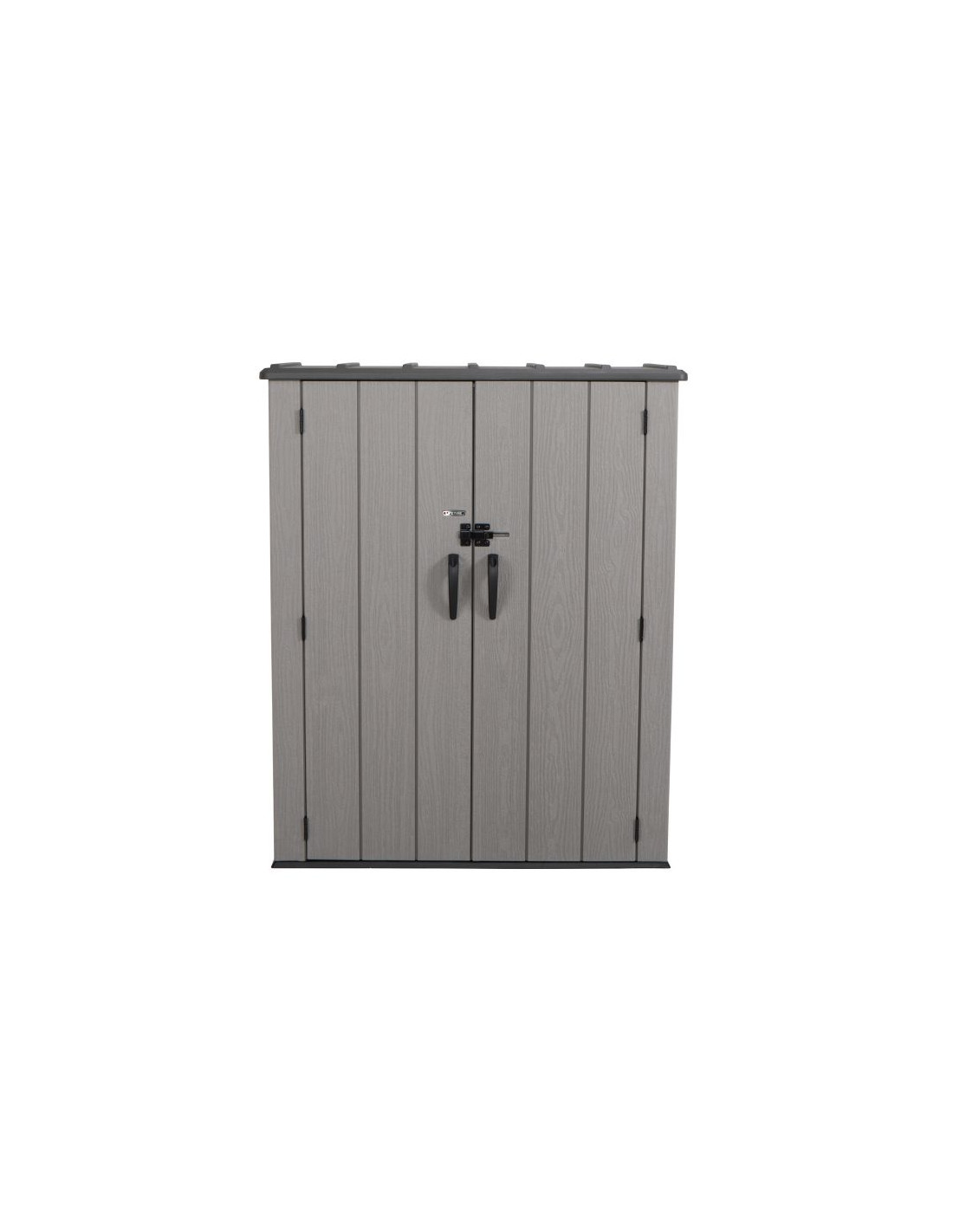 Szafa ogrodowa o wymiarach 174 x 142 x 74 cm wyprodukowana przez markę Lifetime z USA to innowacyjny produkt wykonany z plastiku o najwyższej jakości – 100% polietylenu wysokiej gęstości (HDPE). Doskonałe uzupełnienie ogrodu lub przydomowego składzika, w którym na przykład można schować narzędzia ogrodowe lub drewno. Dzięki strukturze imitującej prawdziwe drewno, świetnie wkomponuje się w otoczenie.