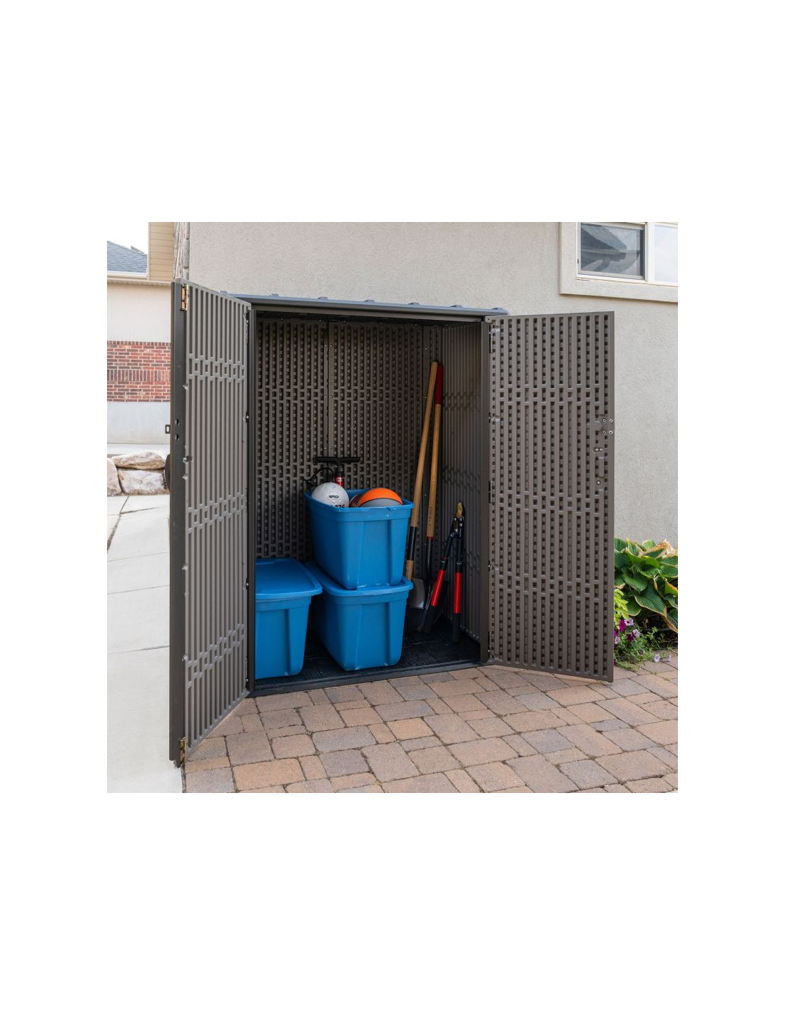 Sztywna, dwuścienna konstrukcja z HDPE wzmocniona stalą sprawia, że szafa jest mocna i niezawodna. Pokryta warstwą ochronną przed promieniowaniem UV, aby zapobiegać blaknięciu i pękaniu. Odporna na plamy powierzchnia nigdy nie wymaga malowania – to zdecydowana przewaga nad drewnianymi szafami!