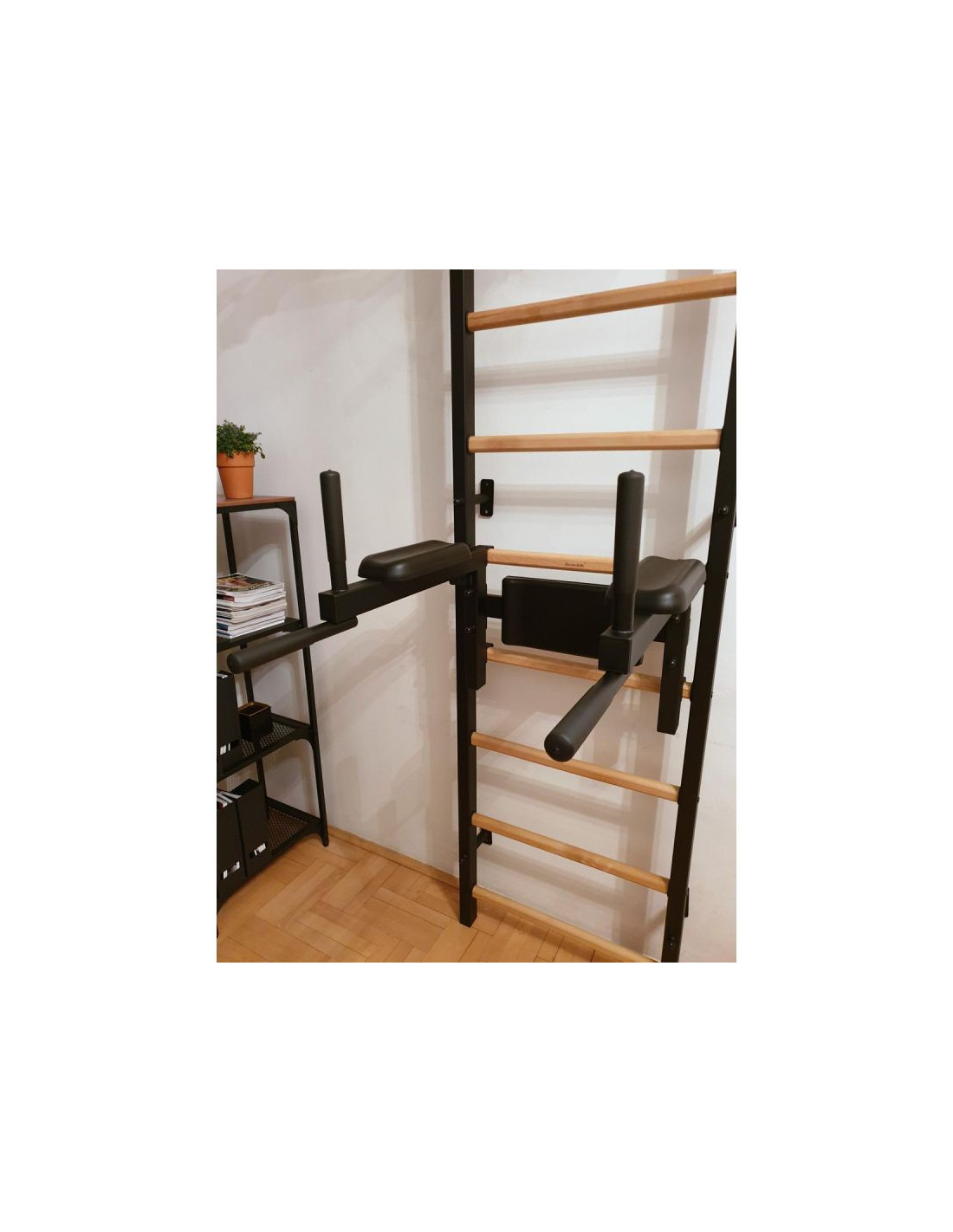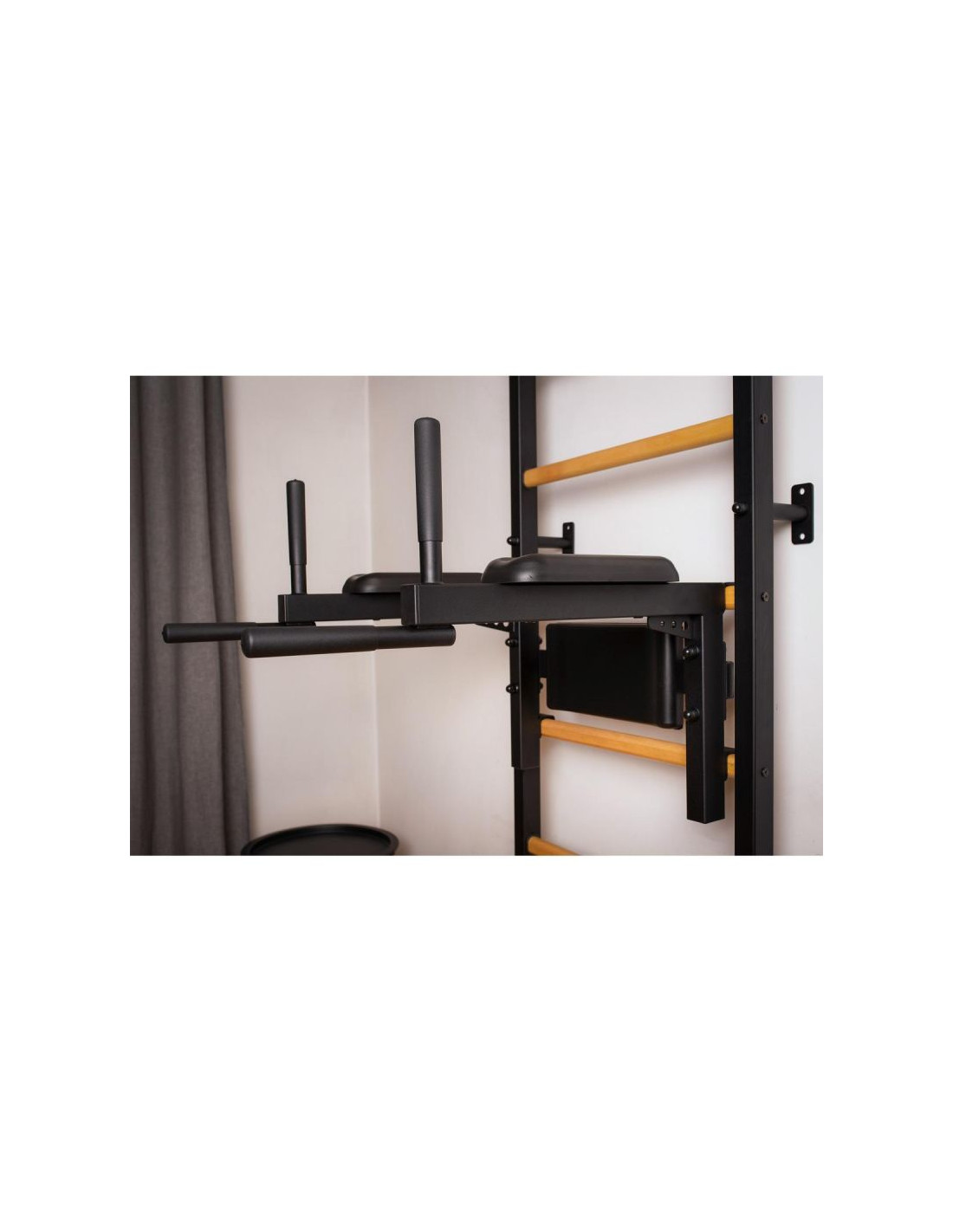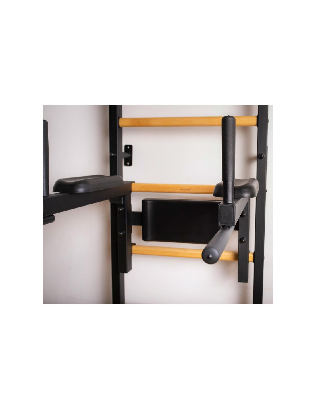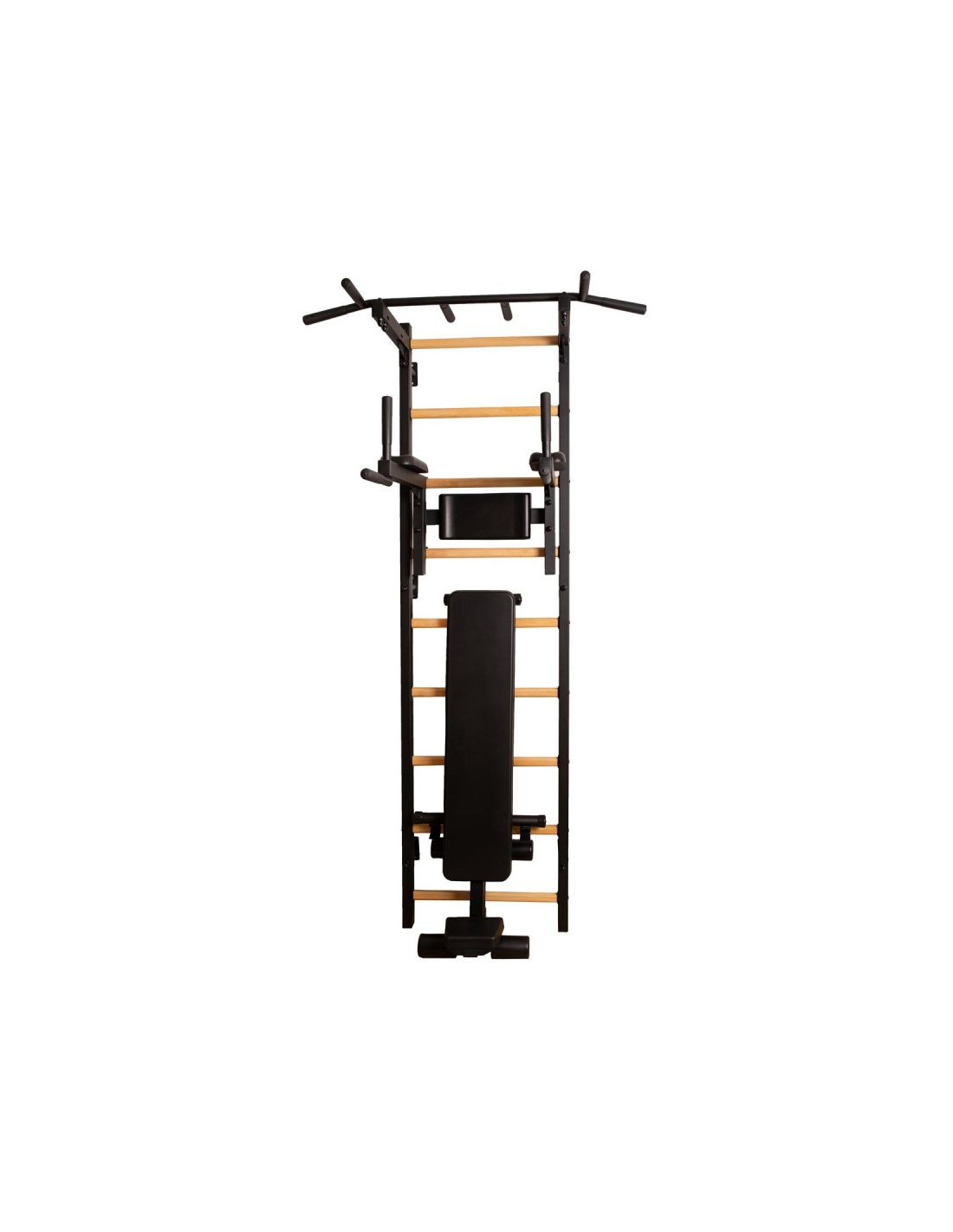 Drewniano – metalowa drabinka gimnastyczna z drążkiem, poręczą do ćwiczeń i ławeczką to solidna i praktyczna konstrukcja. Nie zajmuje dużo miejsca, jest przymocowana do ściany i odstaje na około 15 cm, dzięki czemu znakomicie sprawdzi się w każdym pomieszczeniu. Nowatorskie połączenie drewna z metalem idealnie komponuje się w aktualne trendy nowoczesnego wystroju wnętrza. Drabinka mocowana jest do ściany, z wykorzystaniem sześciu mocnych uchwytów. Profile boczne drabinki gimnastycznej zostały wykonane z metalu 40 x 50 mm o grubości stali – 2 mm. Metal wykorzystany w produkcji jest wysokiej jakości, a proszkowe malowanie zabezpiecza profile drabinki przed odpryskami, zarysowaniami czy zadrapaniami wynikłymi z użytkowania drabinki i kontaktu z osprzętem. Amortyzacja w kształcie litery T uchwytów do ściany skierowana jest na duże obciążenia, nawet do 150 kg osoby ćwiczącej na drabince gimnastycznej. Szczebelki wykonane są z drewna bukowego, są one ręcznie olejowane co zapobiega ślizganiu się dłoni podczas wykonywania ćwiczeń na drabince gimnastycznej. Chroni to także drabinkę przed szybką eksploatacją w postaci śladów, otarć czy zabrudzeń. Najważniejszą zaletą drabinki jest jej wytrzymałość. Drabinka jest w stanie wytrzymać obciążenie sięgające nawet do 150 kilogramów. Jest to szczególnie ważny aspekt dla użytkowników o większej wadze ciała.